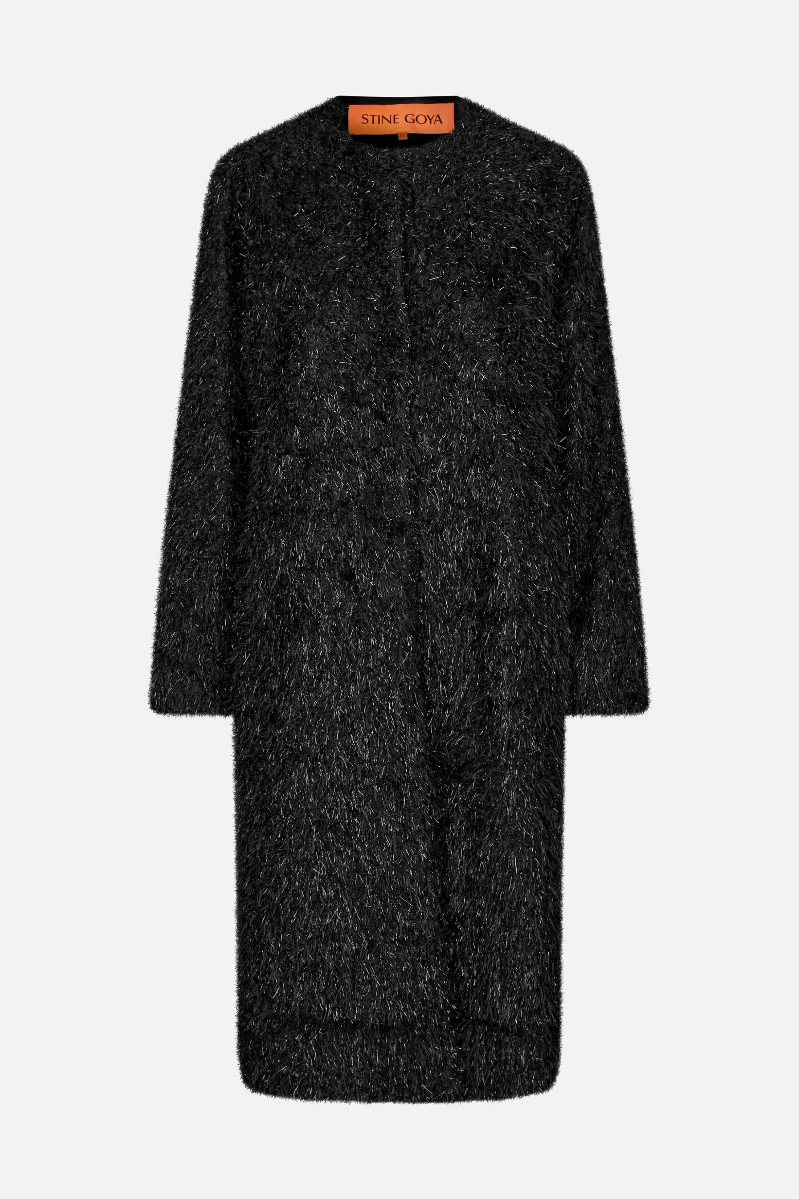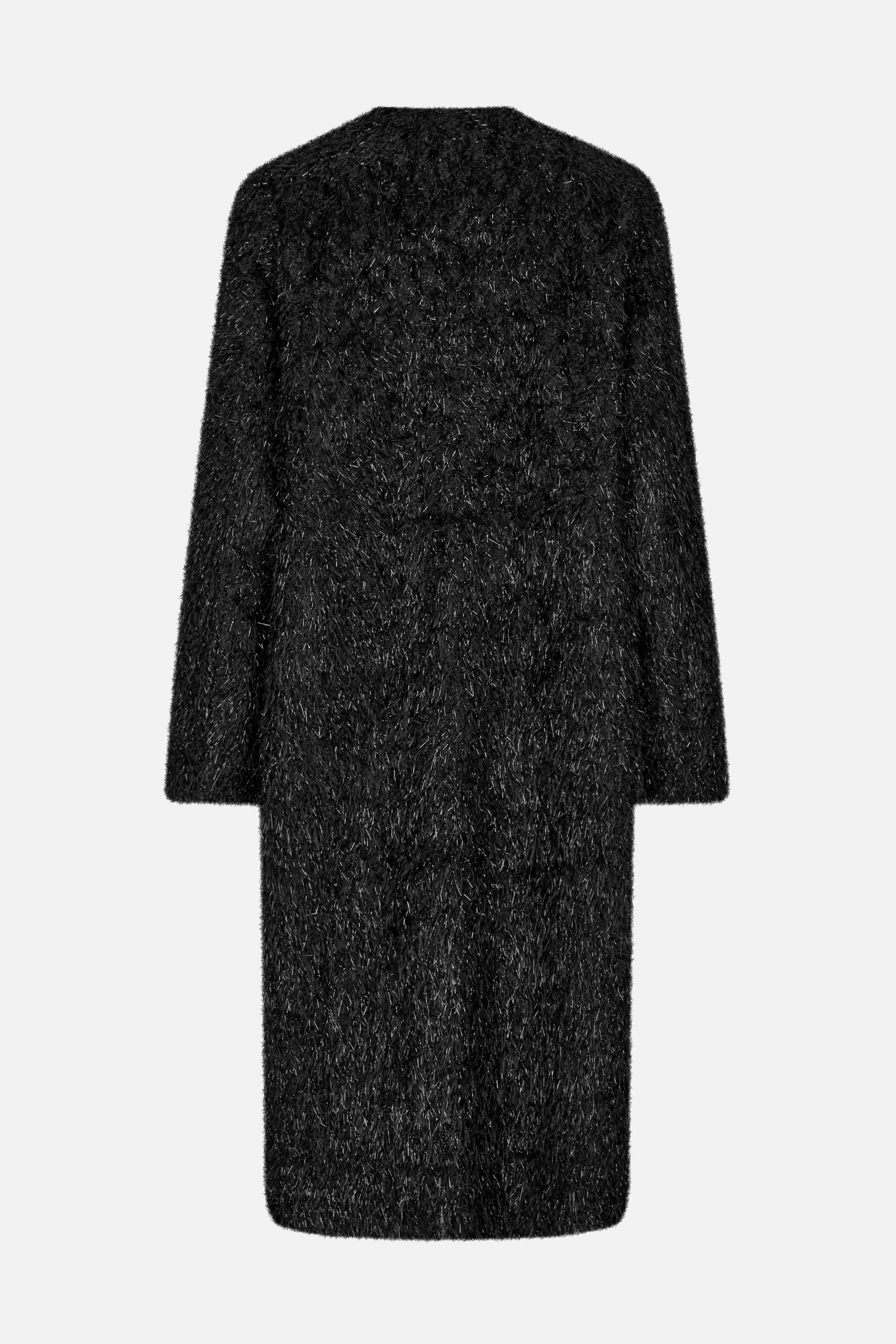 Sort glitrende frakke med lange ærmer og sidelommer. Jakken kan lukkes med hægter foran. Fuldt foret.