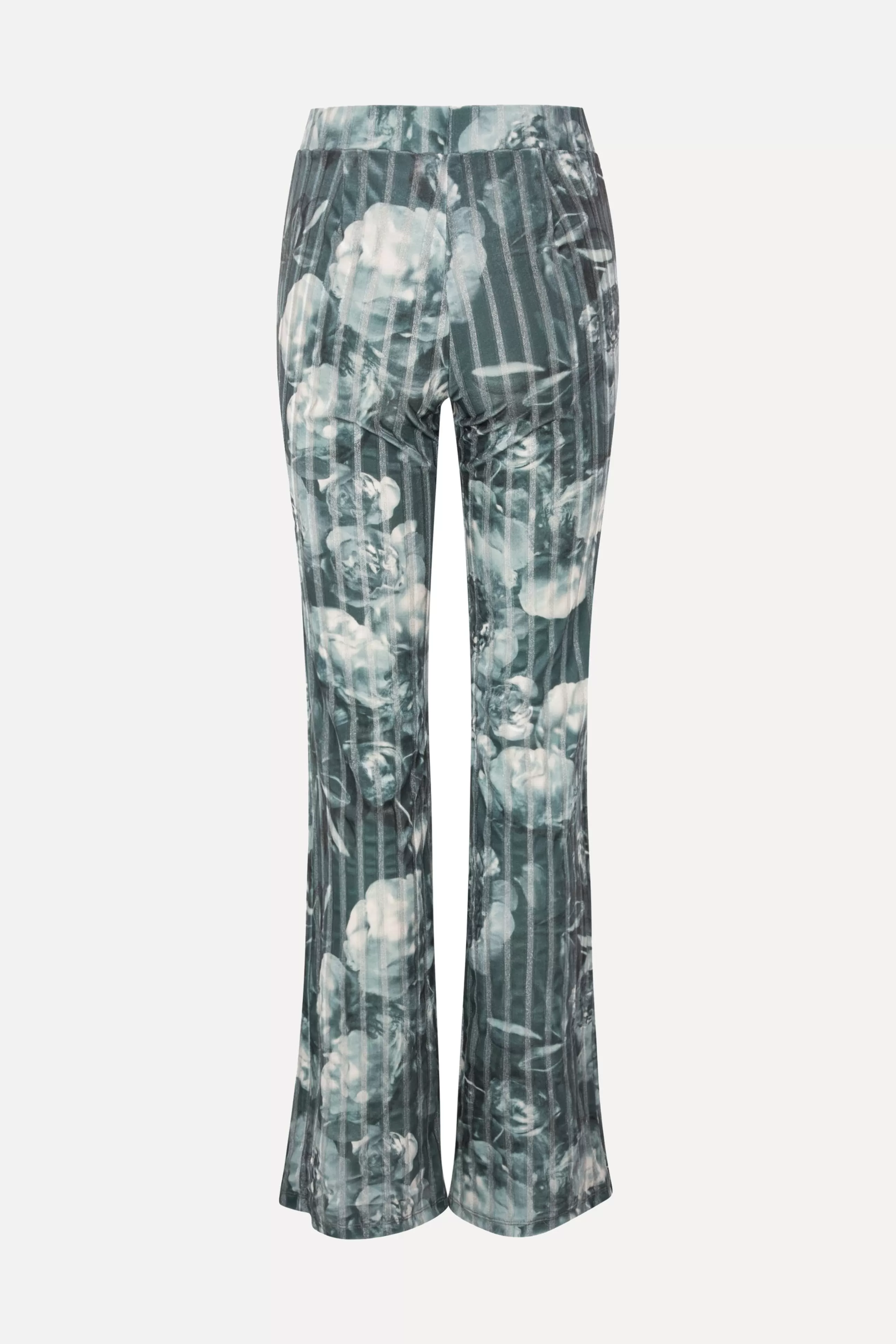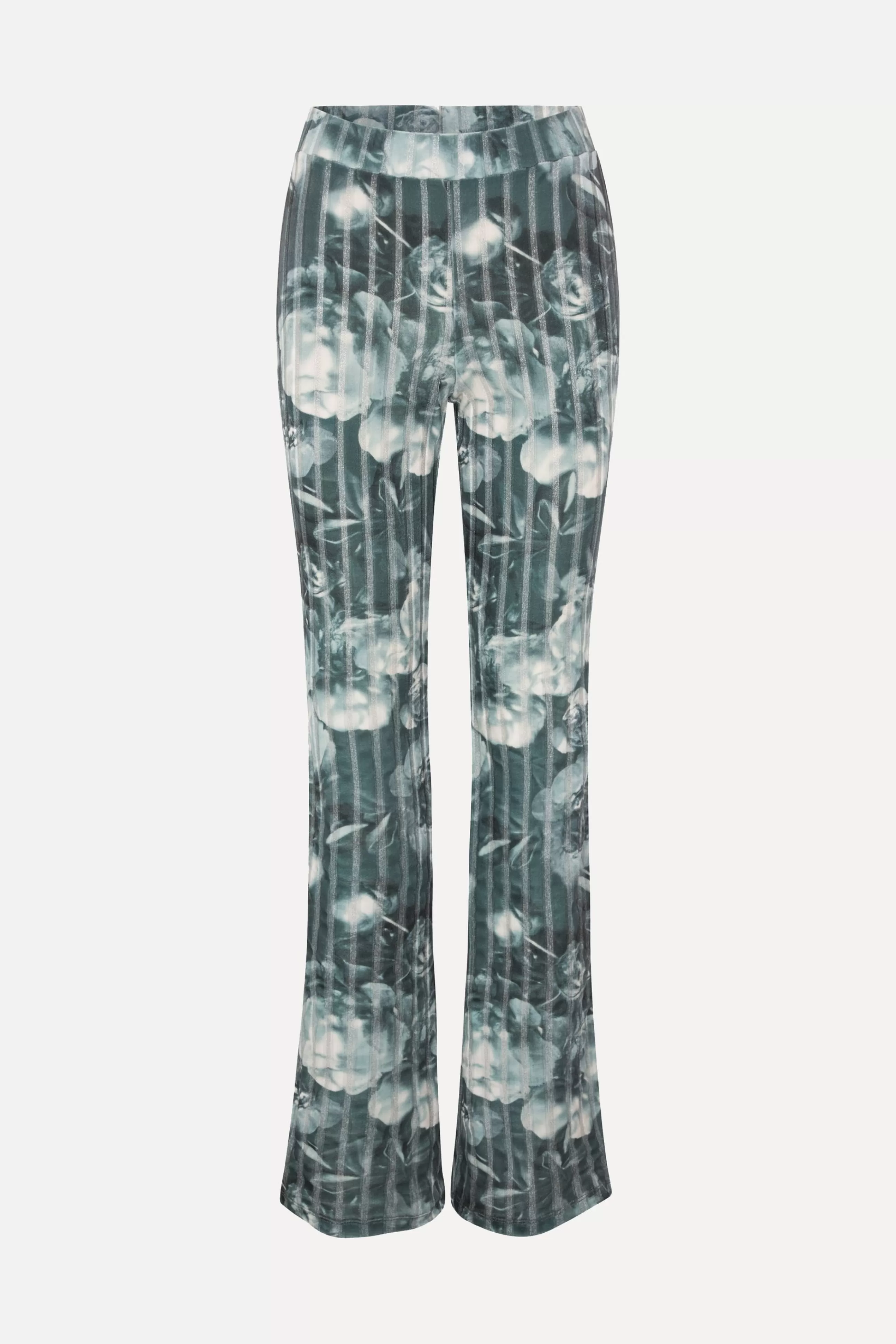 Velourbukser med blomsterprint og metalliske sølv striber, en smule stretch, let vidde i benene og elastisk talje.