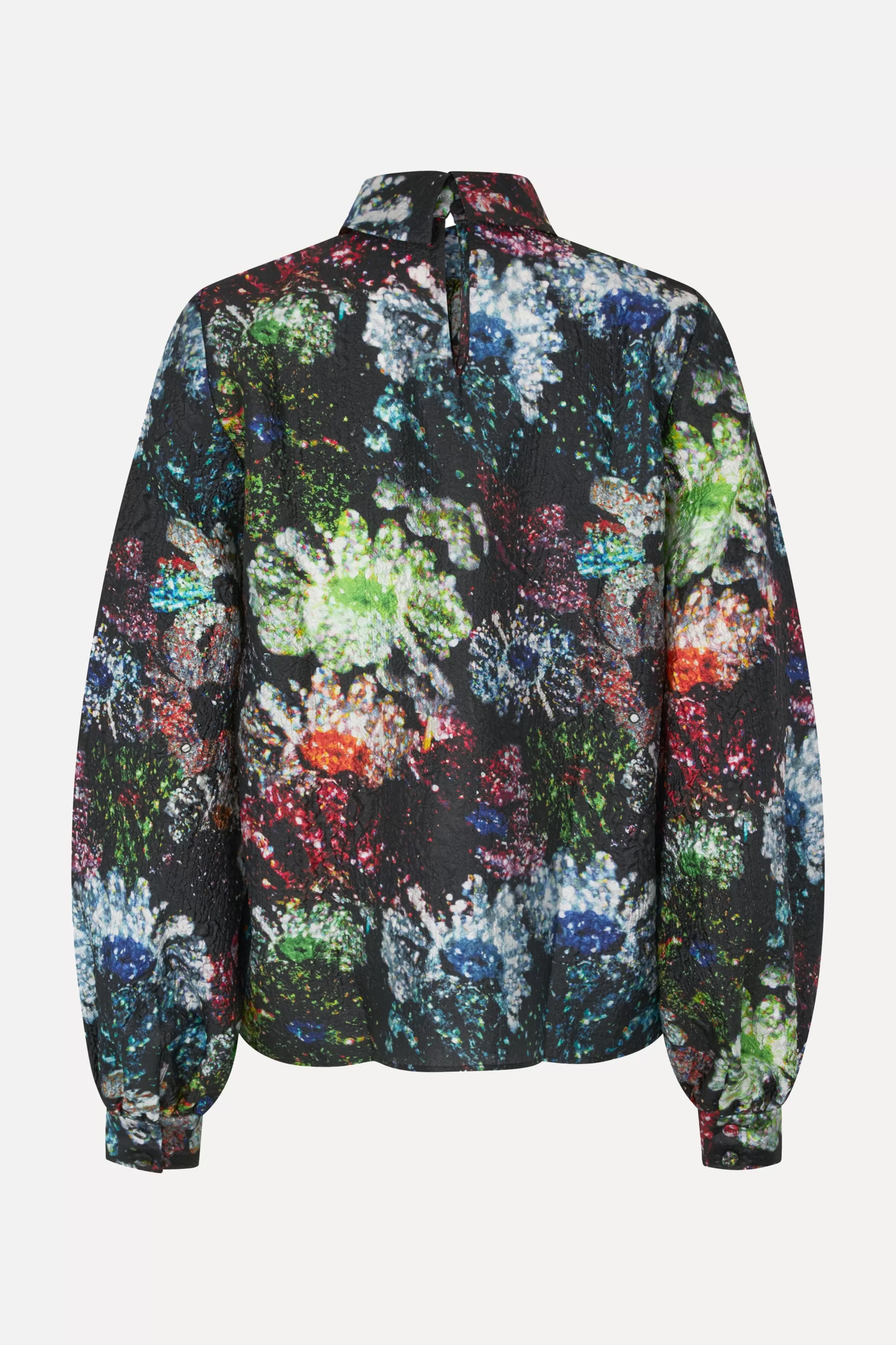 Langærmet top med rullekrave, lange ærmer med manchetter og farverigt blomstermønster. Afslappet pasform.