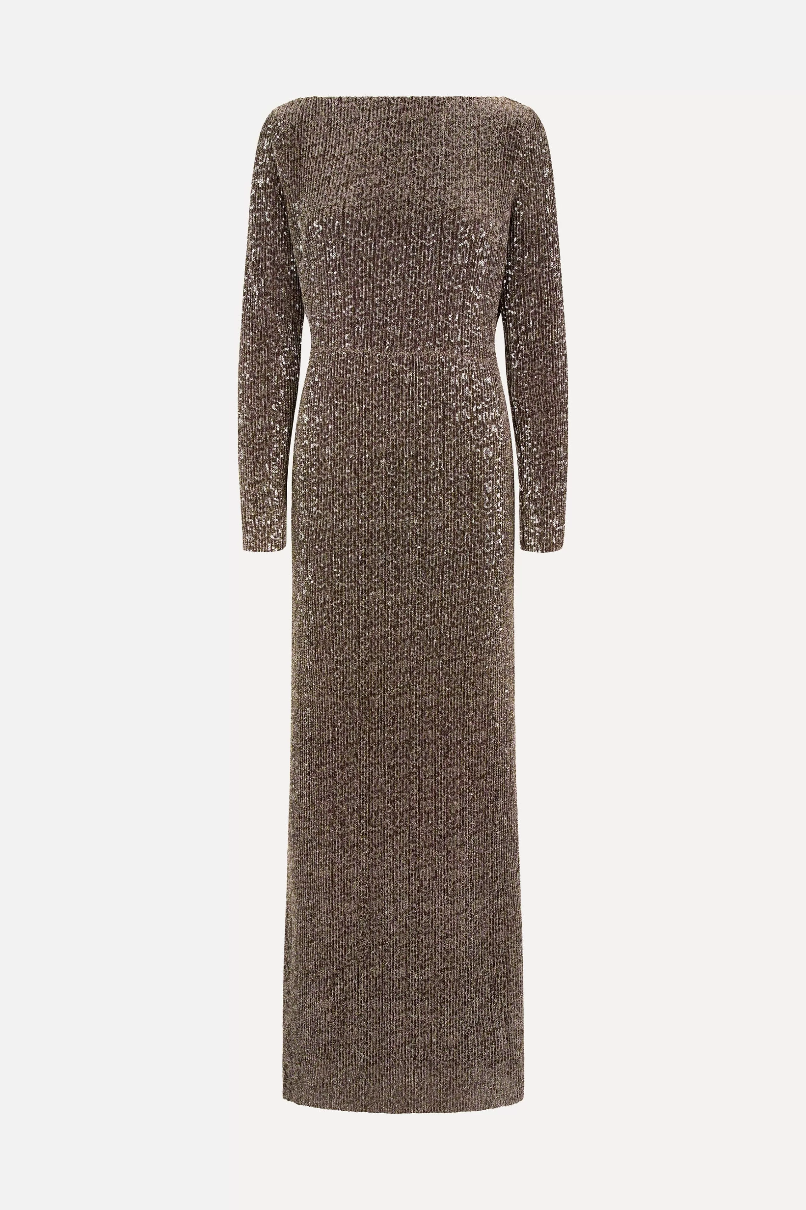 Langærmet pailletkjole kjole i fuld længde med høj halsudskæring og dyb åben ryg.50% Metallisk/50% PolyesterFoer: 1…