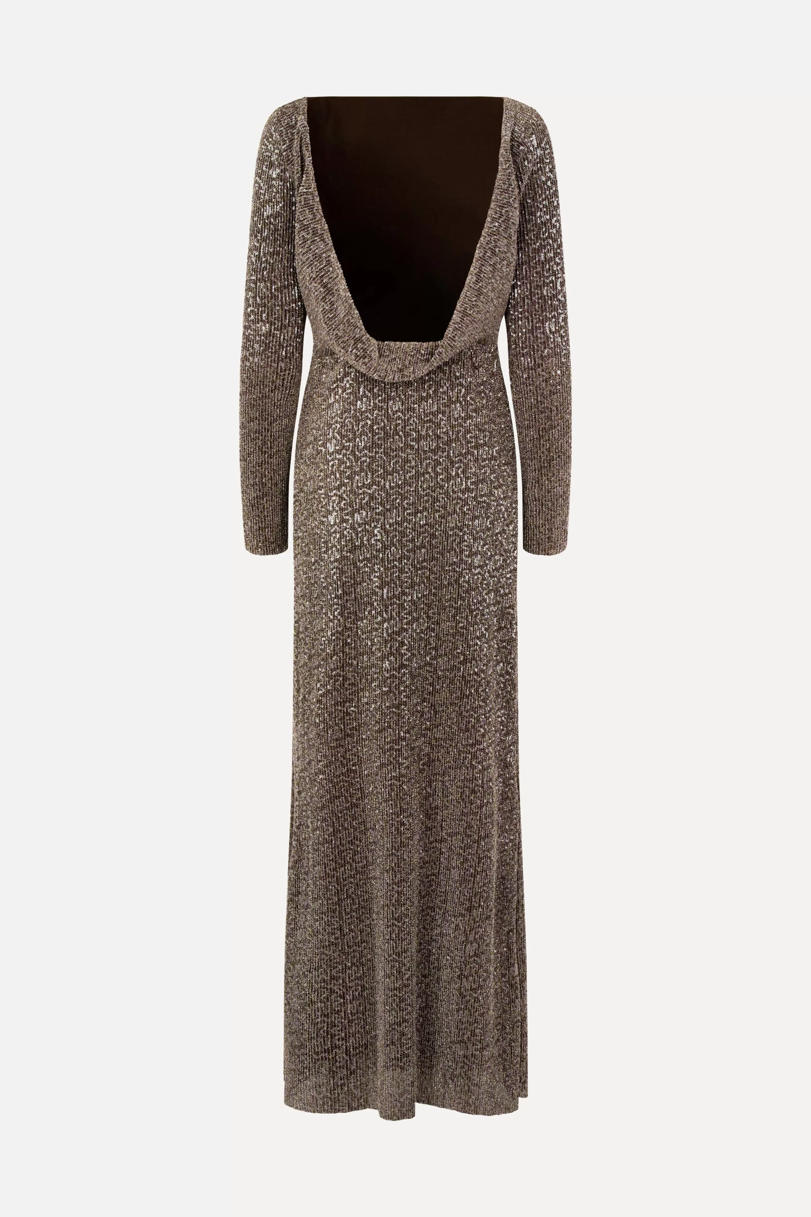 Langærmet pailletkjole kjole i fuld længde med høj halsudskæring og dyb åben ryg.