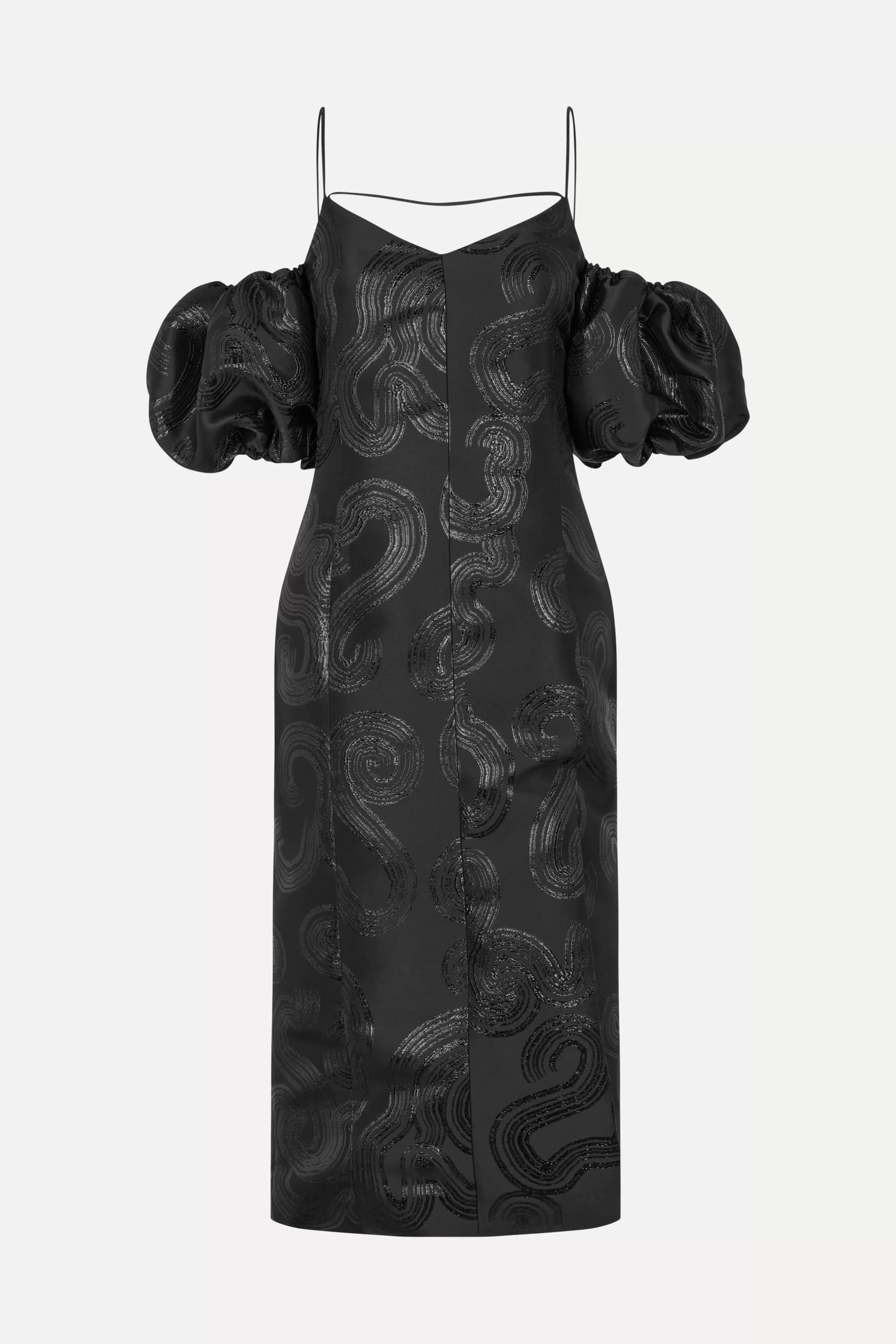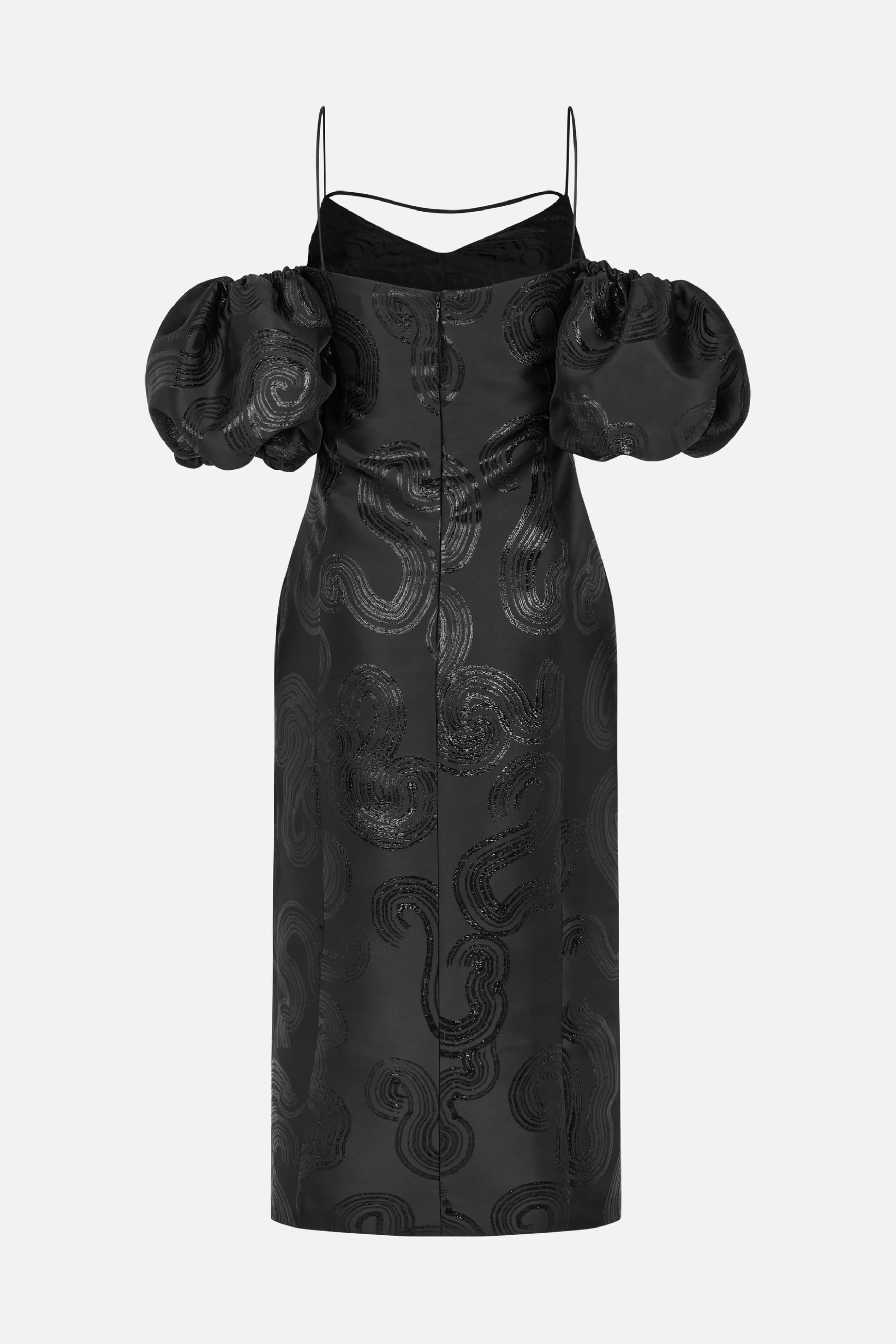 Elegant sort mønstret midikjole med off the shoulder-udskæring, tynde stropper, korte pufærmer og slids foran. Skjult lynslås bagpå. Helforet.