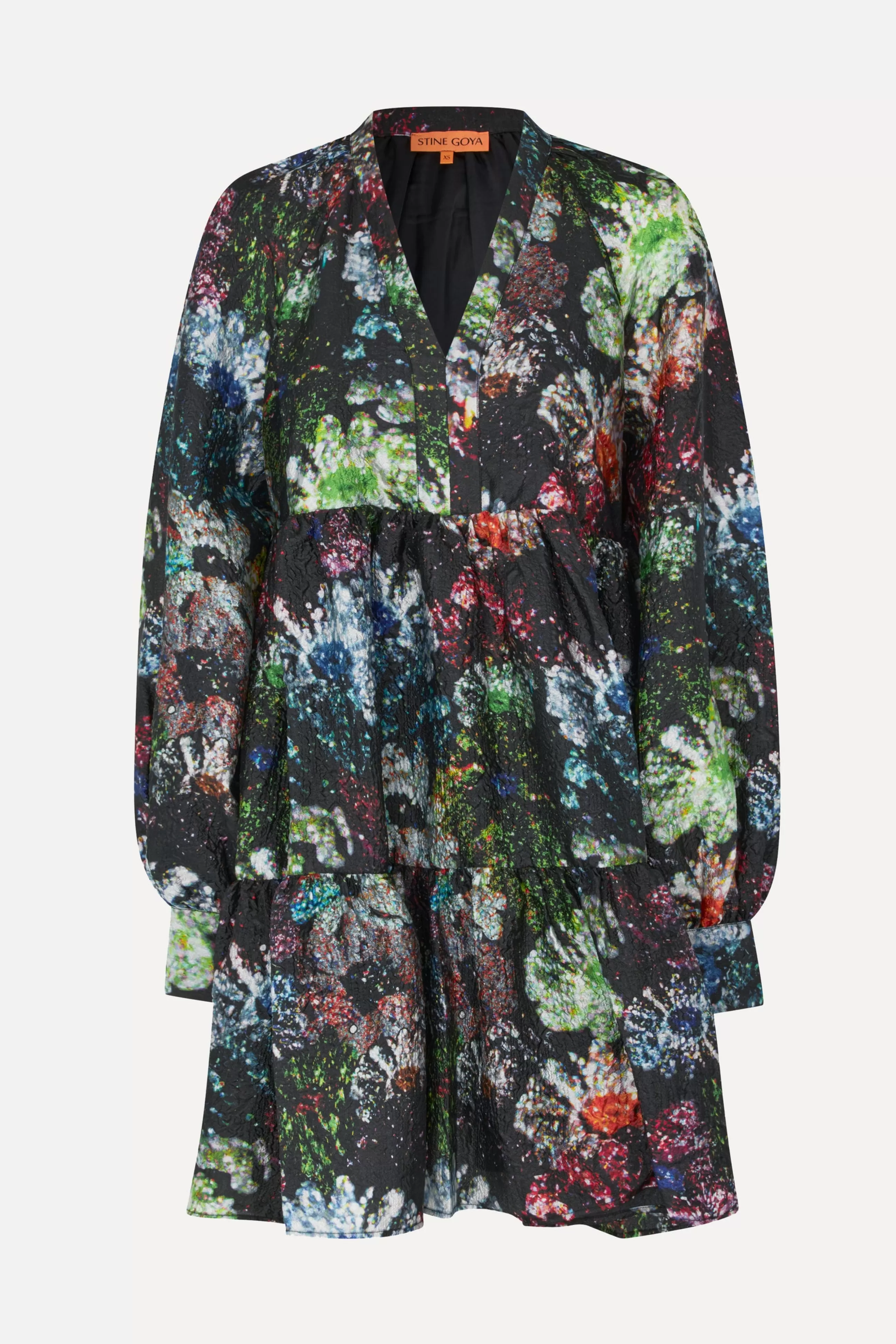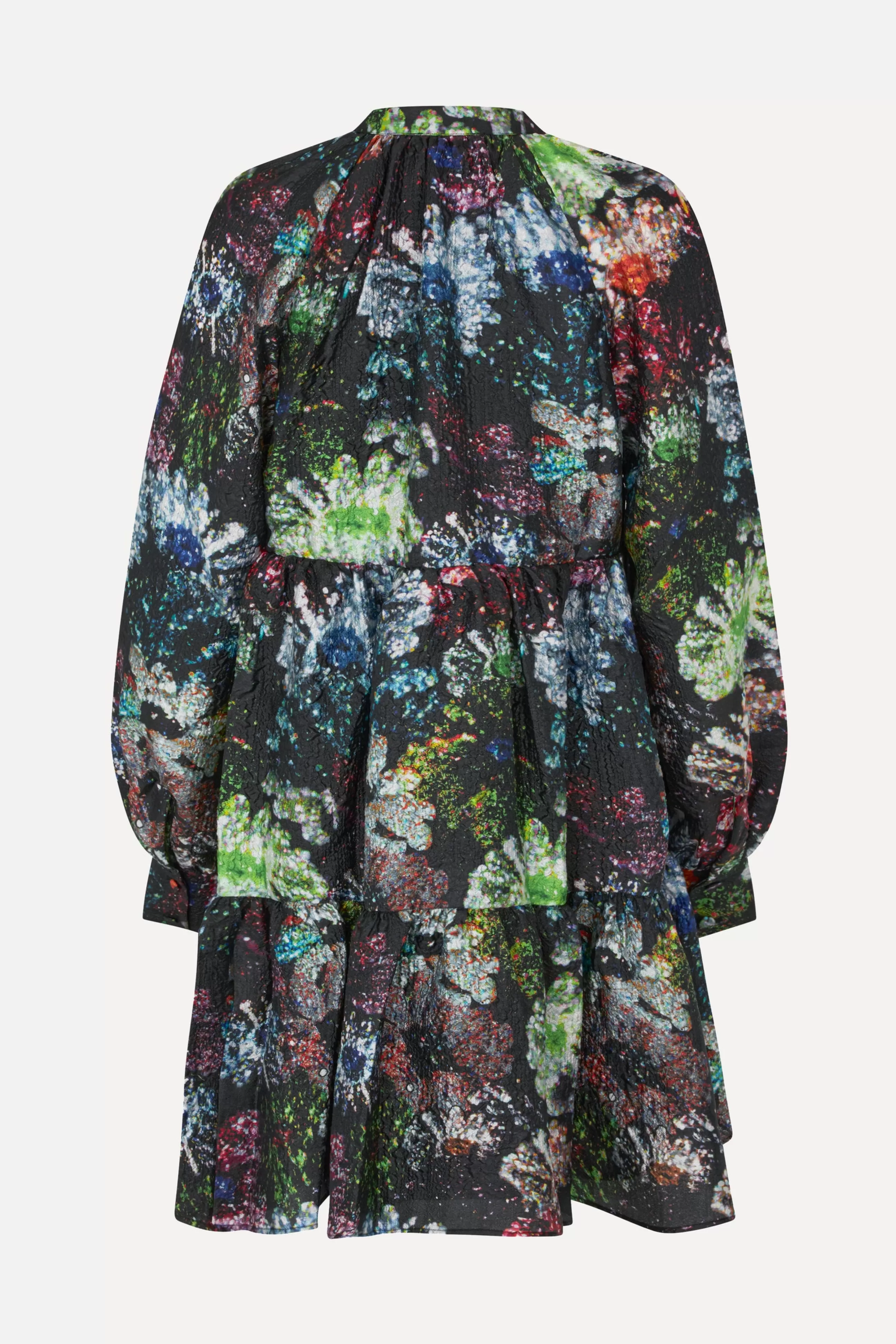 Afslappet mini-kjole med blomsterprint. Høj krave, V-udskæring og lange pufærmer med manchetter.