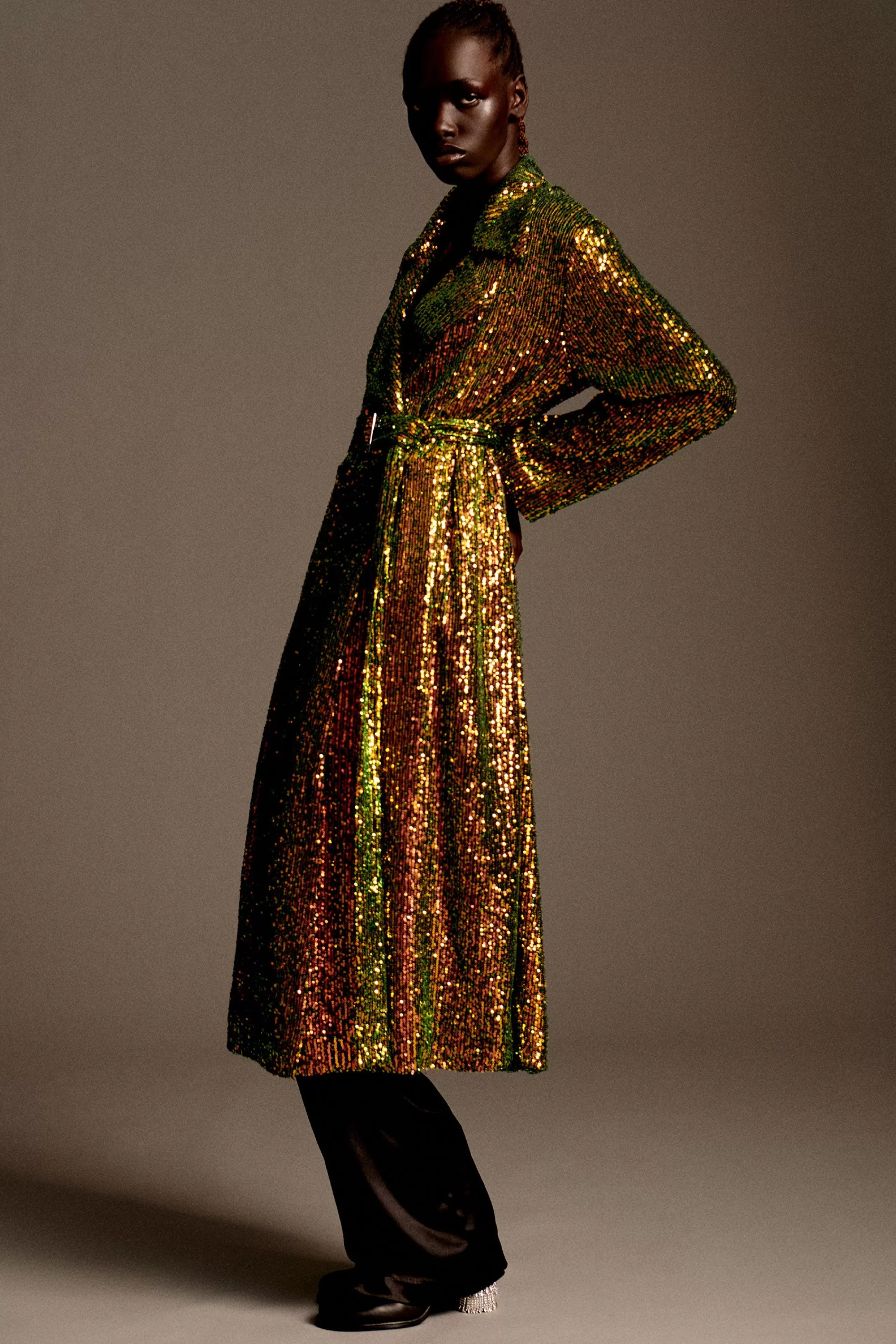 Dobbeltradet trenchcoat med iriserende pailletter, V-udskæring, bindebælte og sidelommer. Helforet.65% Genanvendt Poly…