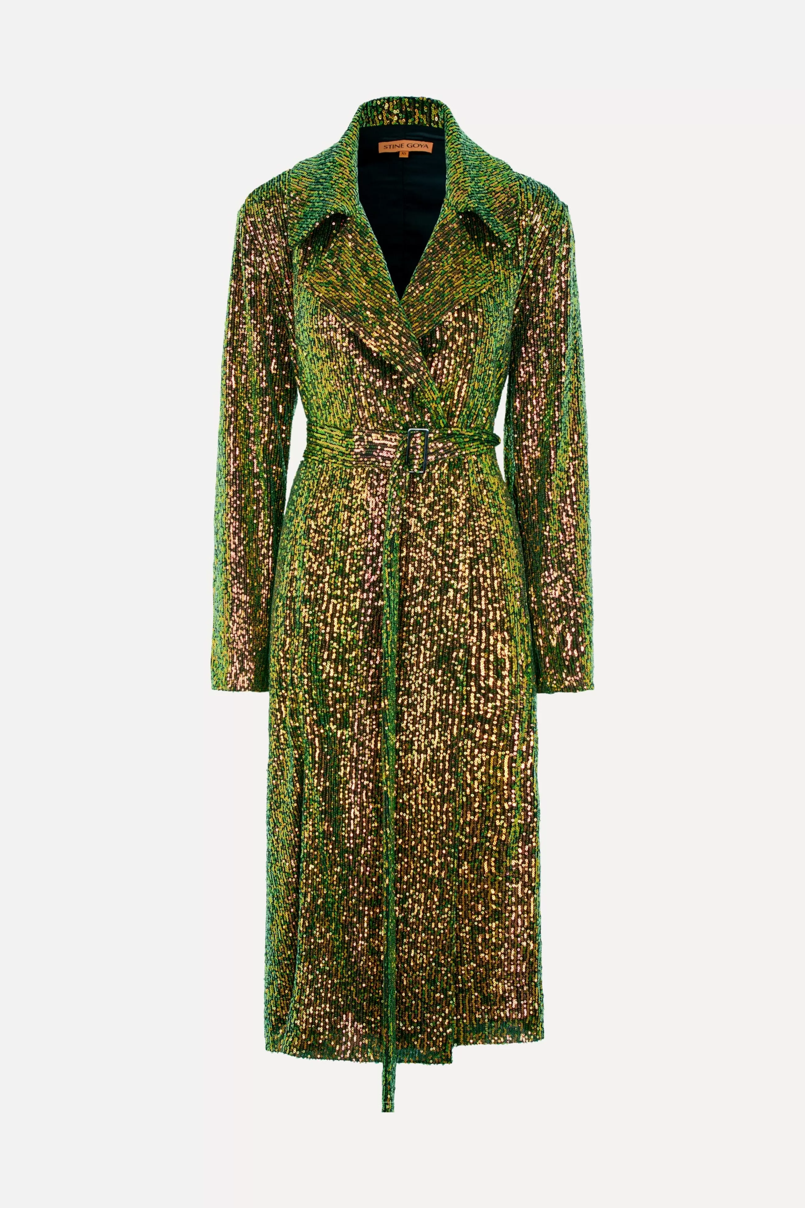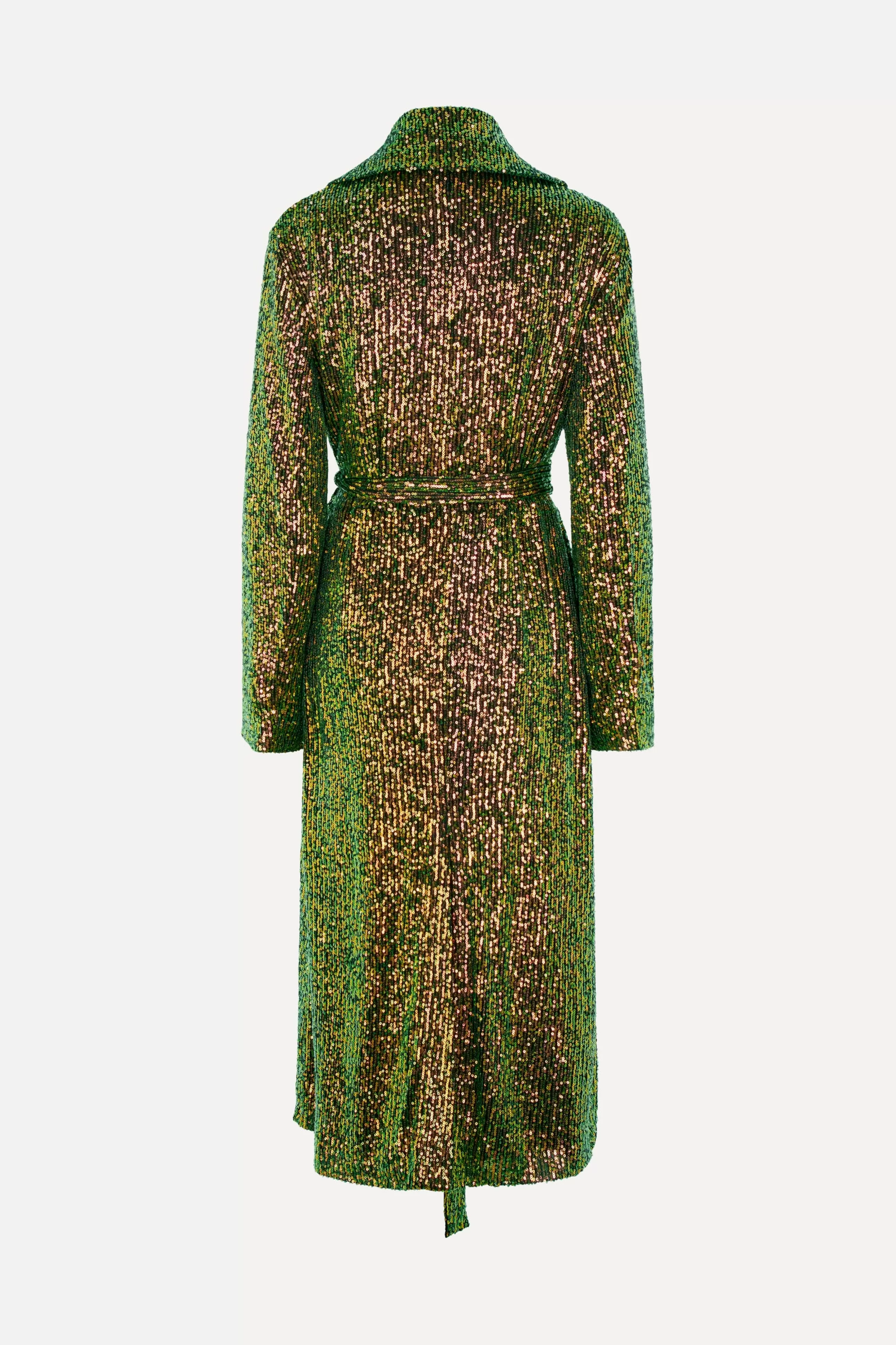 Dobbeltradet trenchcoat med iriserende pailletter, V-udskæring, bindebælte og sidelommer. Helforet.