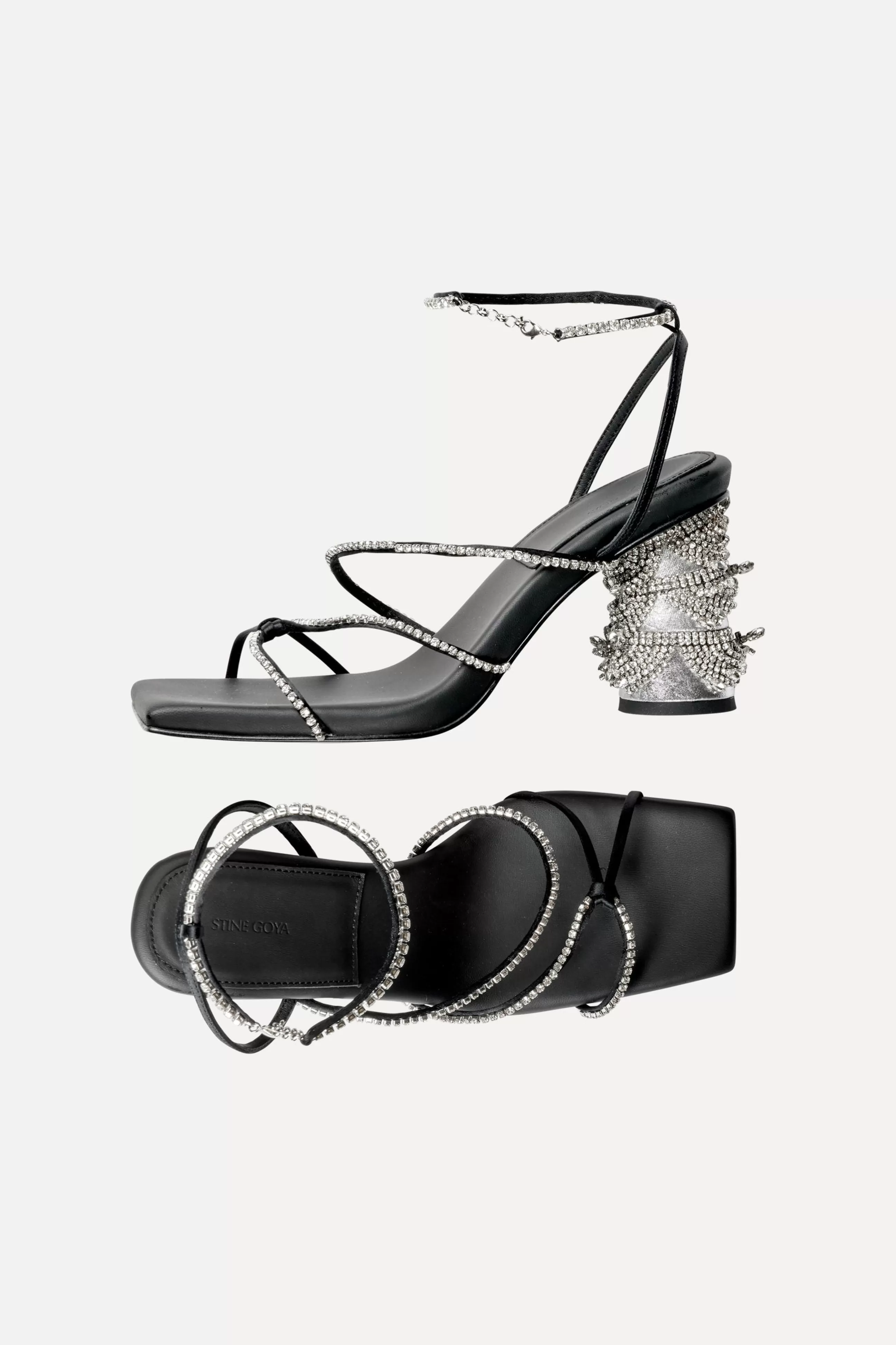 Højhælede sandaler med remme og krydsende krystalremme, firkantet åben tå og rund hæl med kvastdetaljer i krystal.