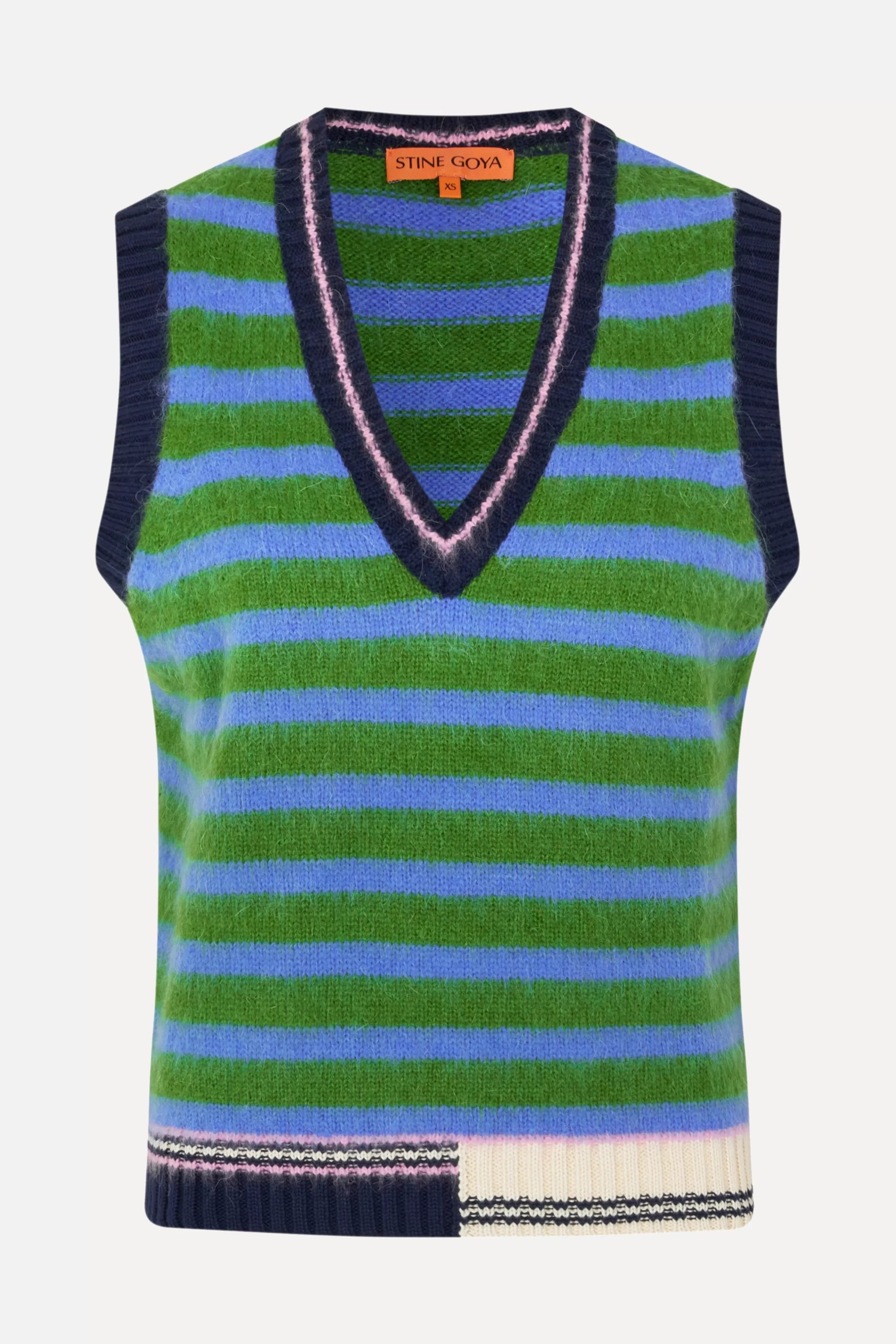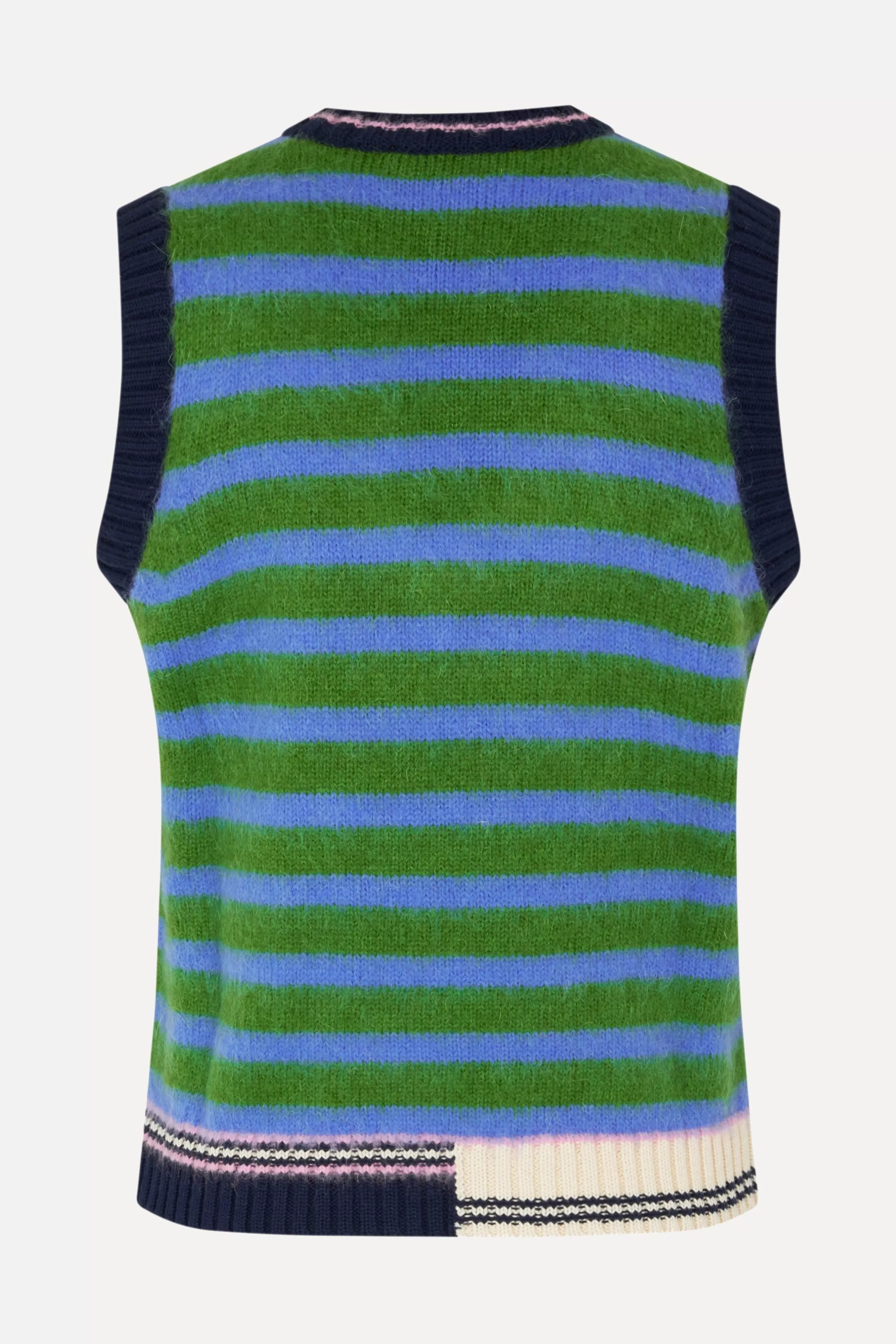 Ärmlös sweatervest med V-ringning, randigt mönster och tjock ribbad fåll med kontrastmönster.