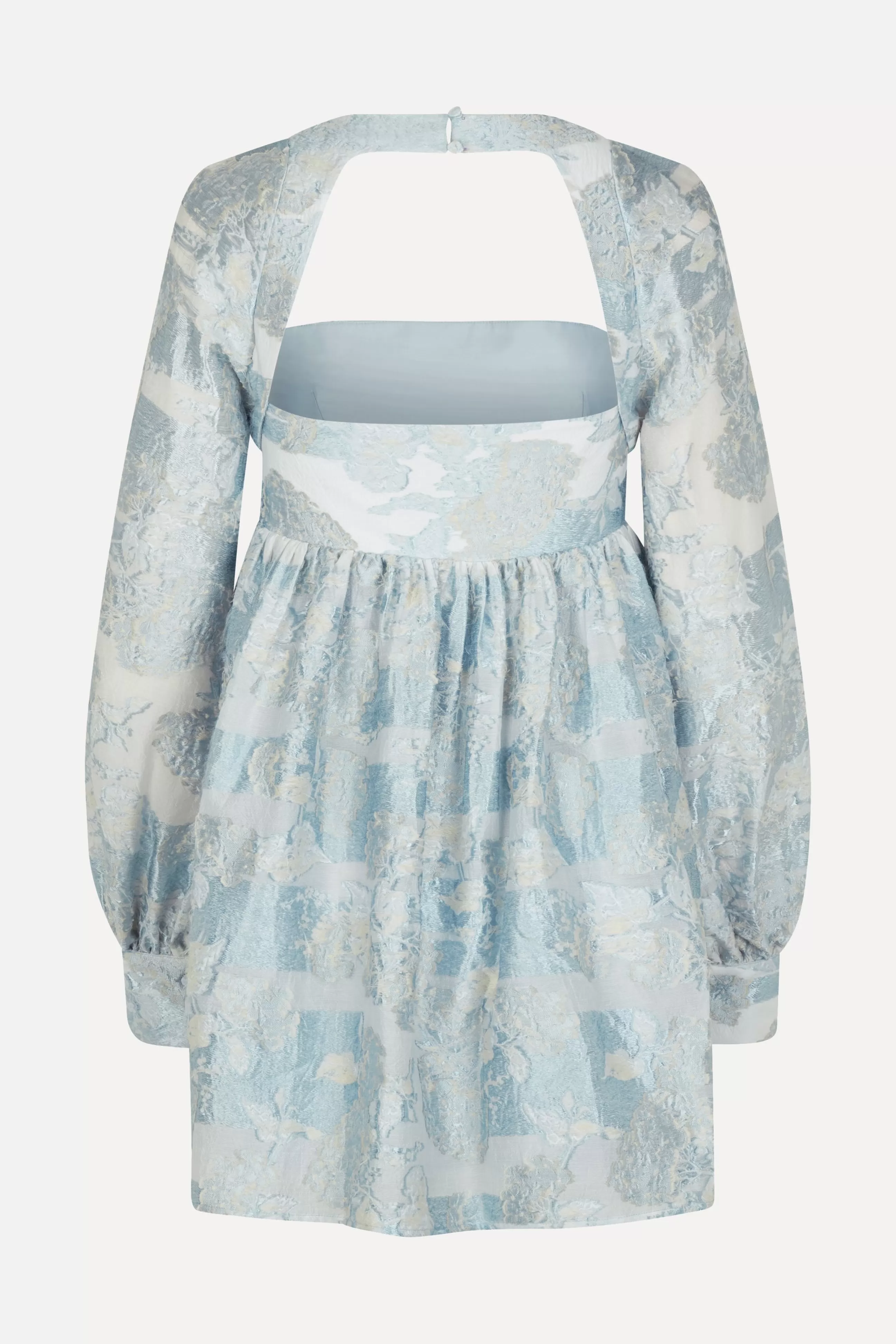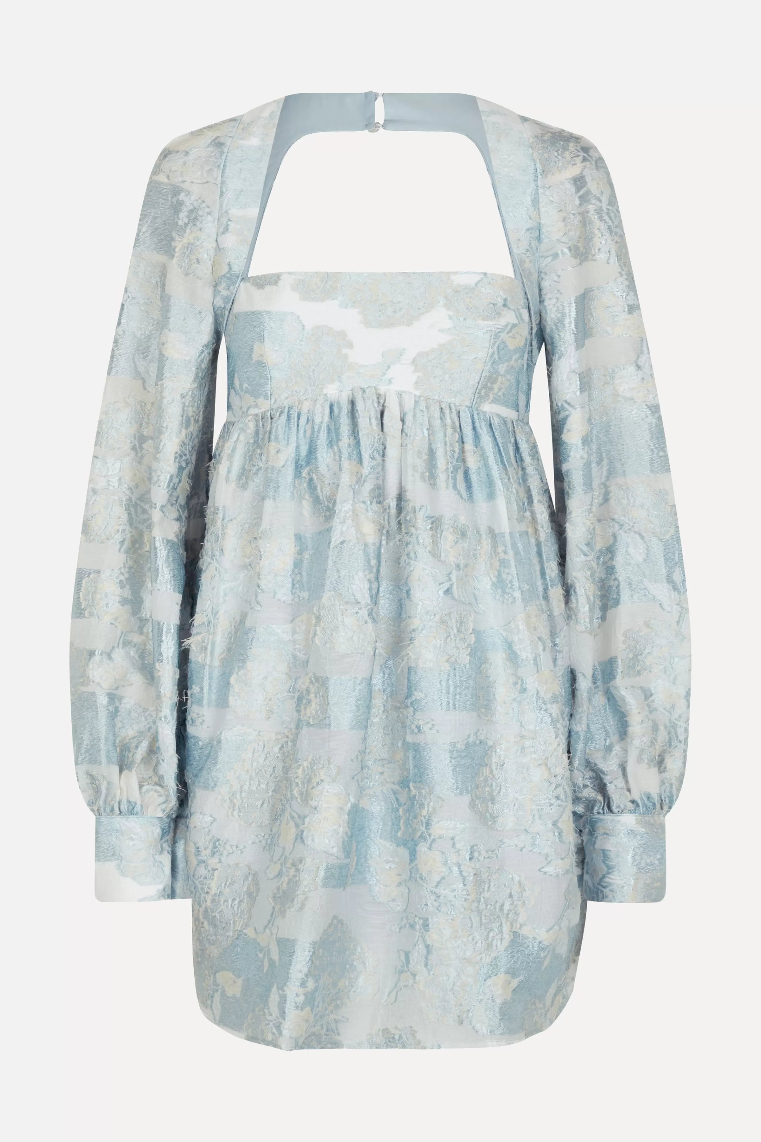 Voluminøs mini-kjole i tekstureret materiale med lange pufærmer med manchetter, rygudskæring og sidelommer. Helforet.