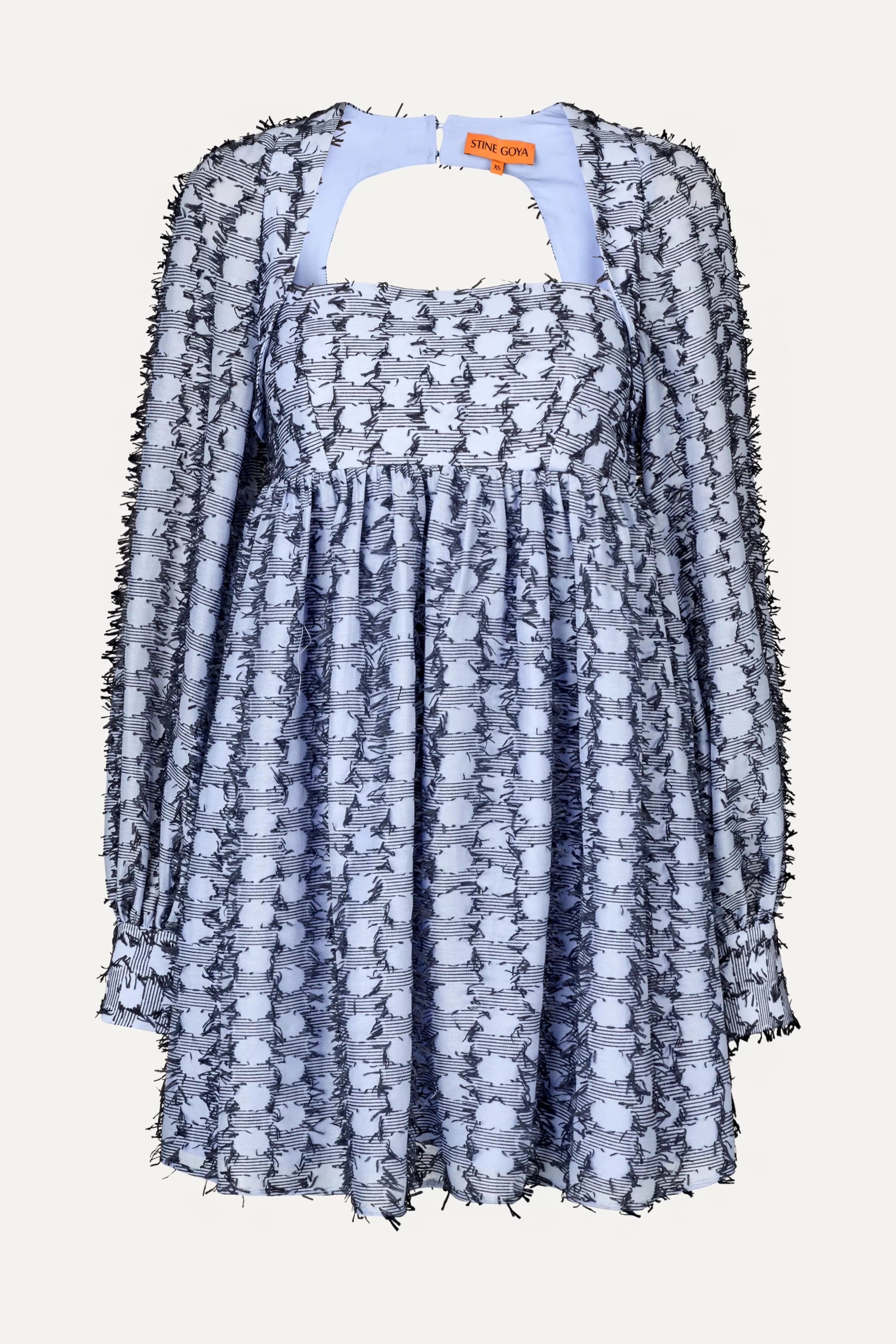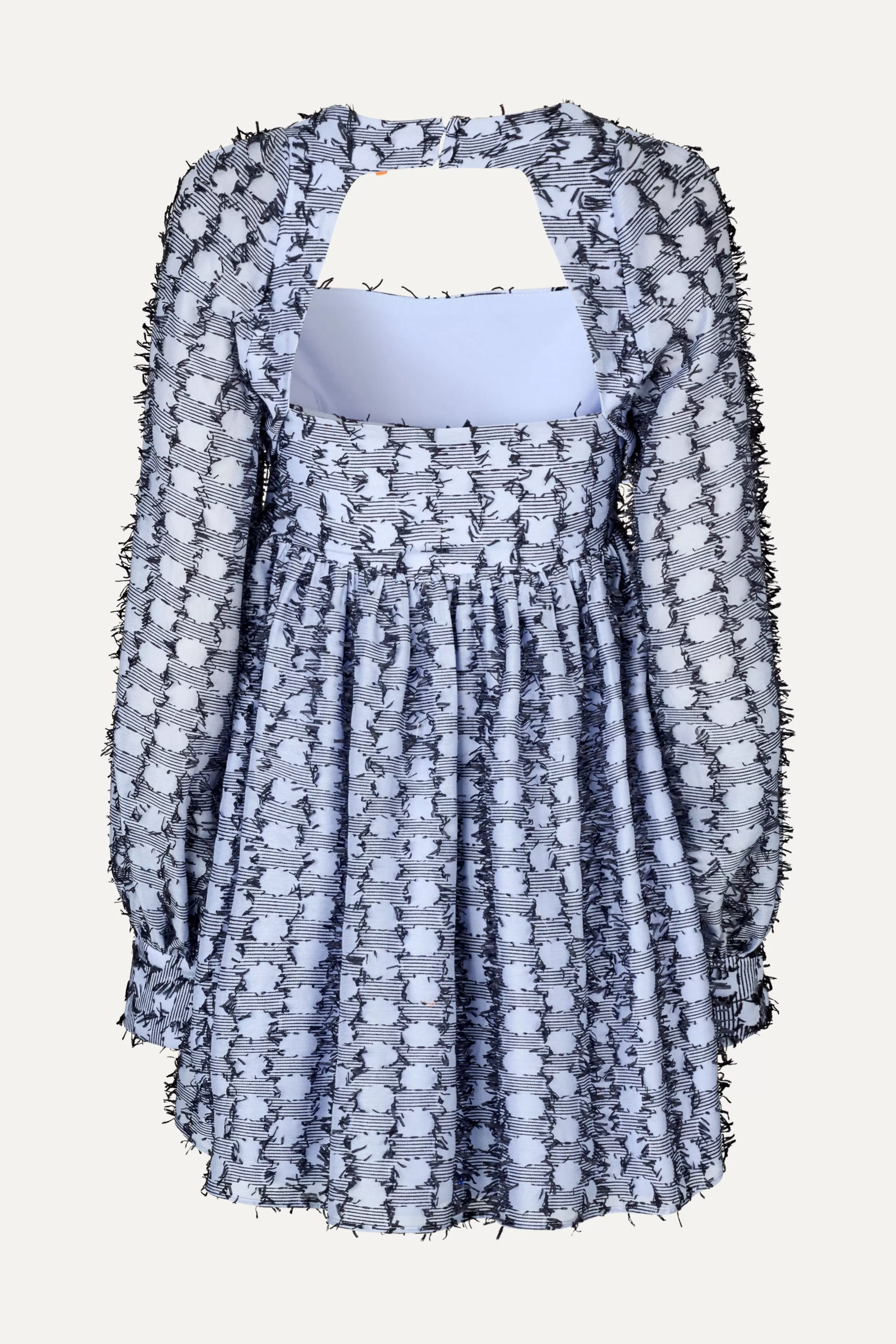Lyseblå minikjole i tekstureret jacquard materiale med bandeau-top med rygudskæring, lange pufærmer og sidelommer.