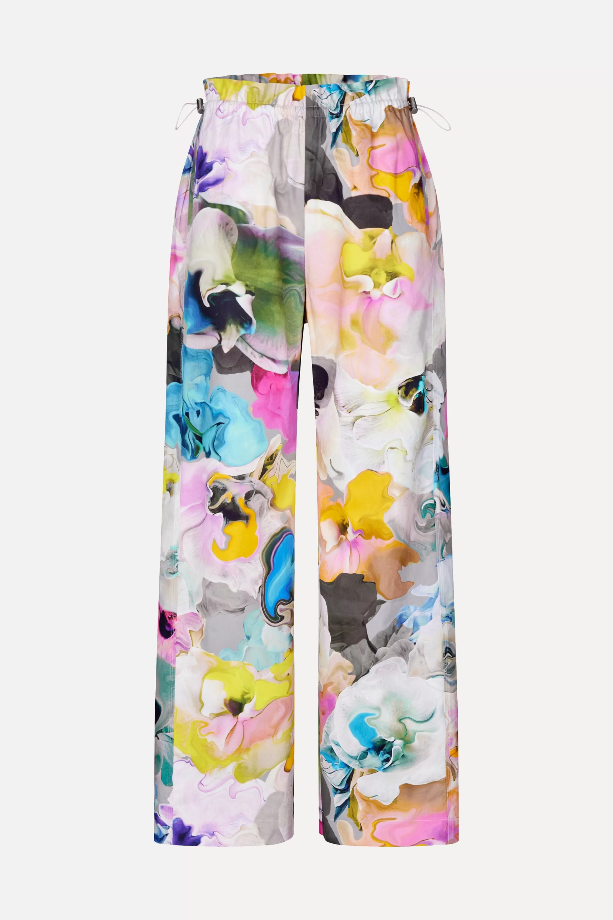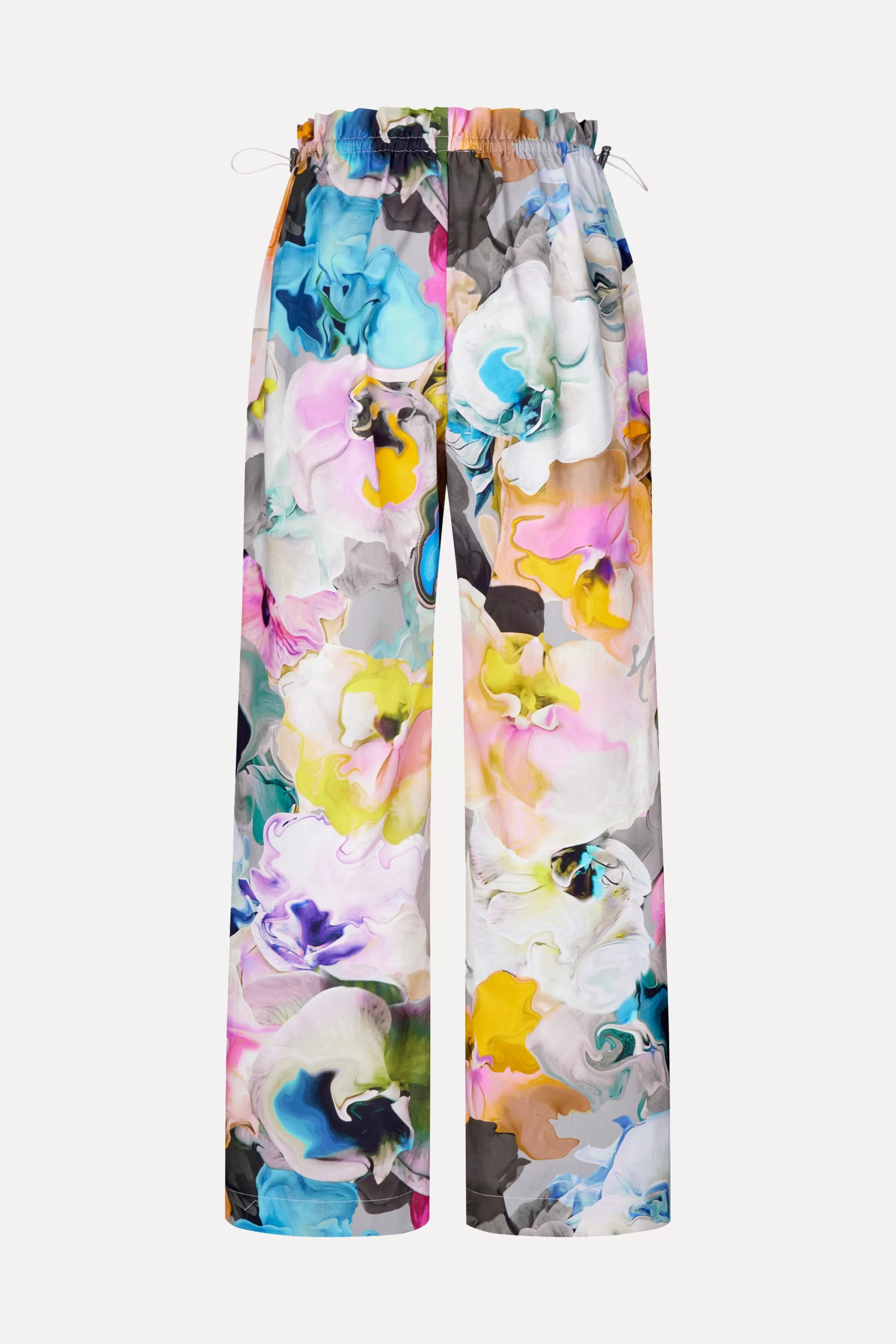 Afslappede bukser i 100% Økologisk Bomuld med blomsterprint. Detaljeret med justerbar elastisk lining, diskret flæseka…