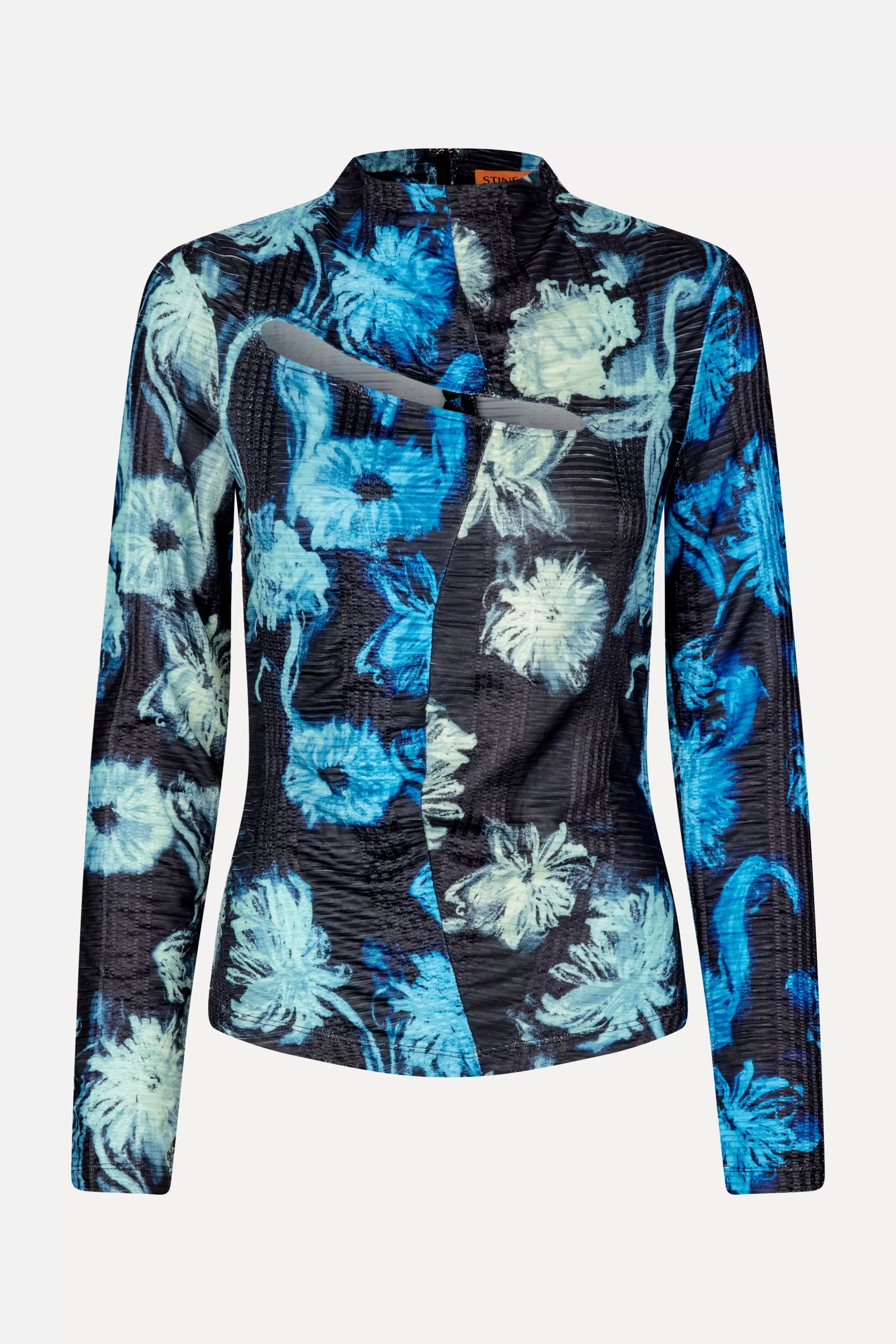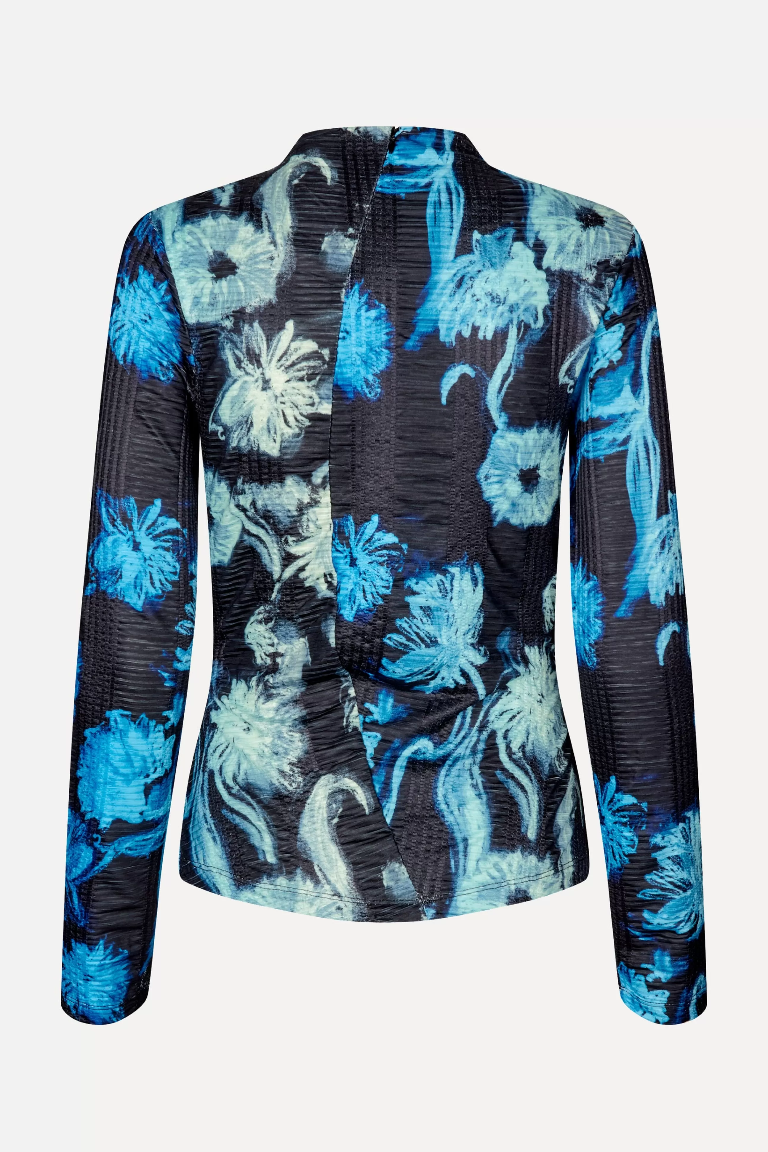 Sort stretchy langærmet top med håndmalet blomsterprint, høj krave og cut-out detalje foran.
