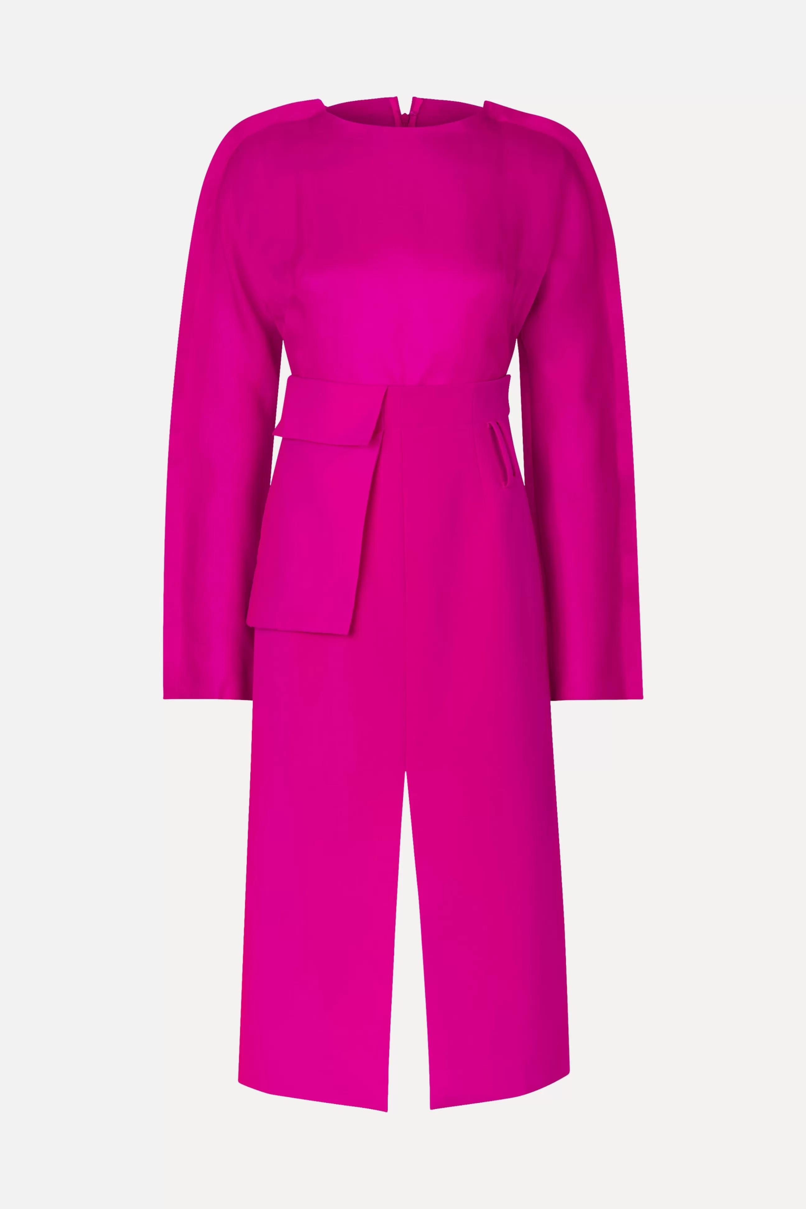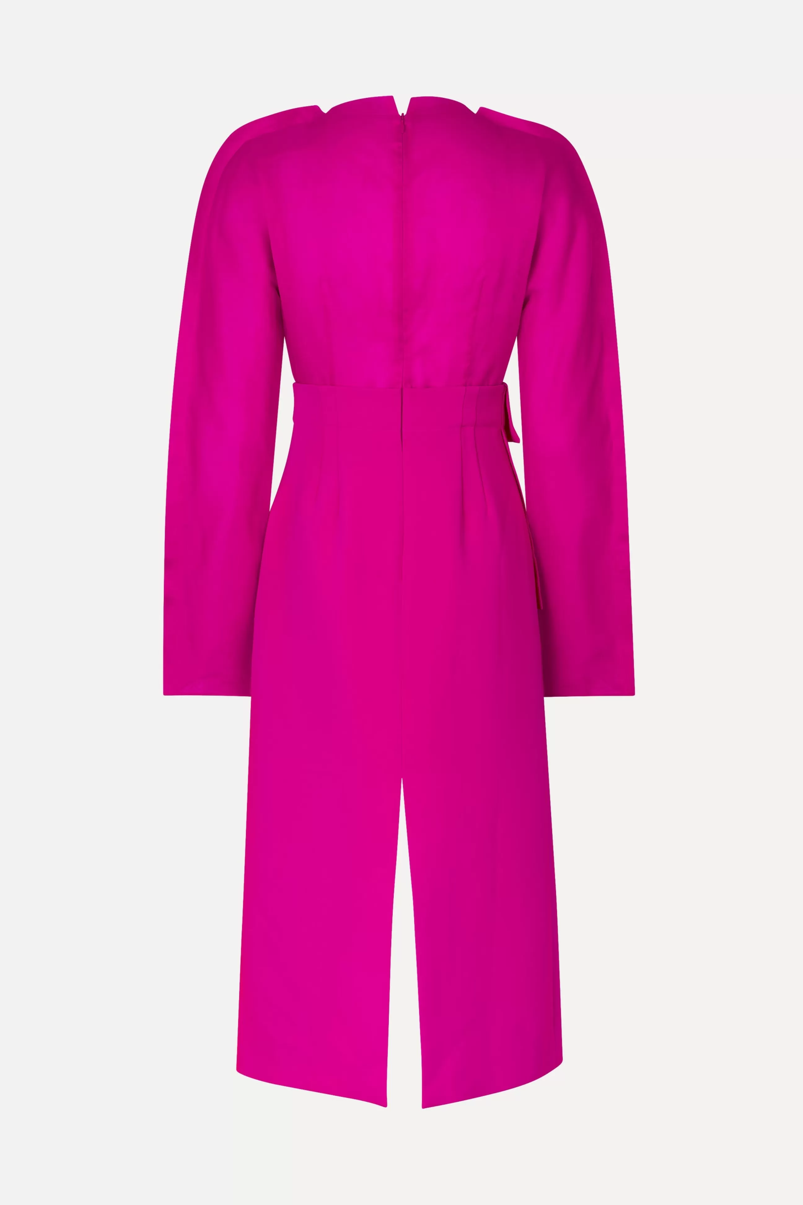 Langærmet pink midi-kjole med en halvgennemsigtig silketop, struktureret silhuet og bælte i taljen. Slids foran og bagpå. Foret underdel.