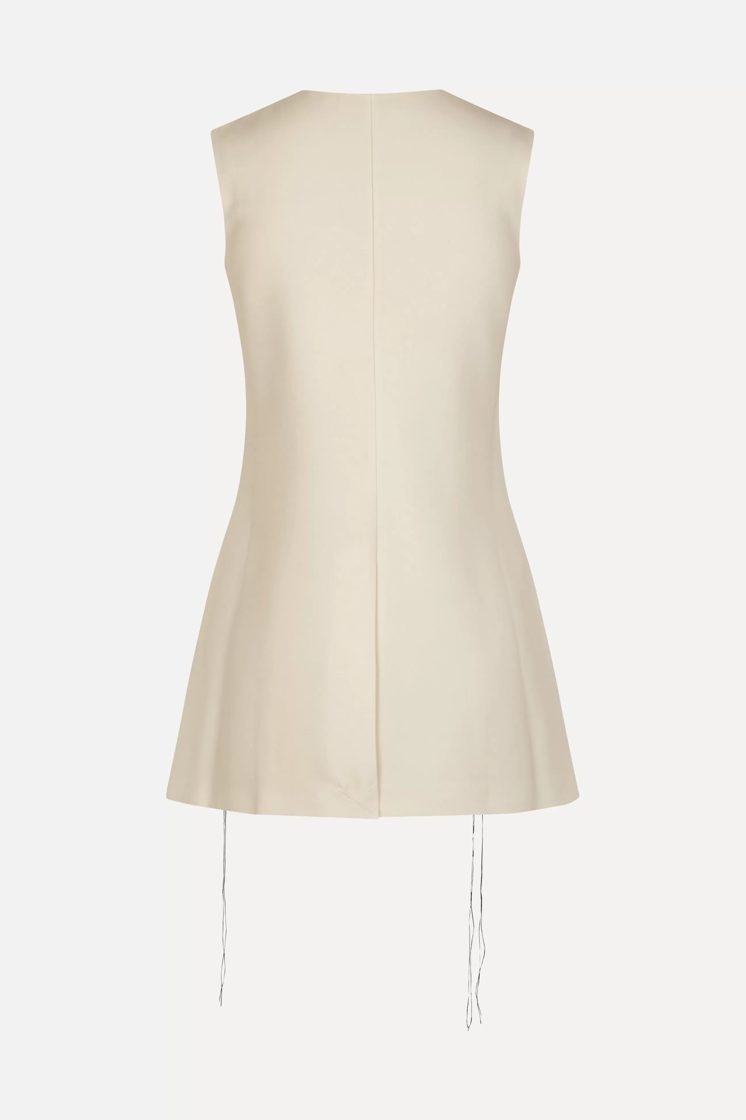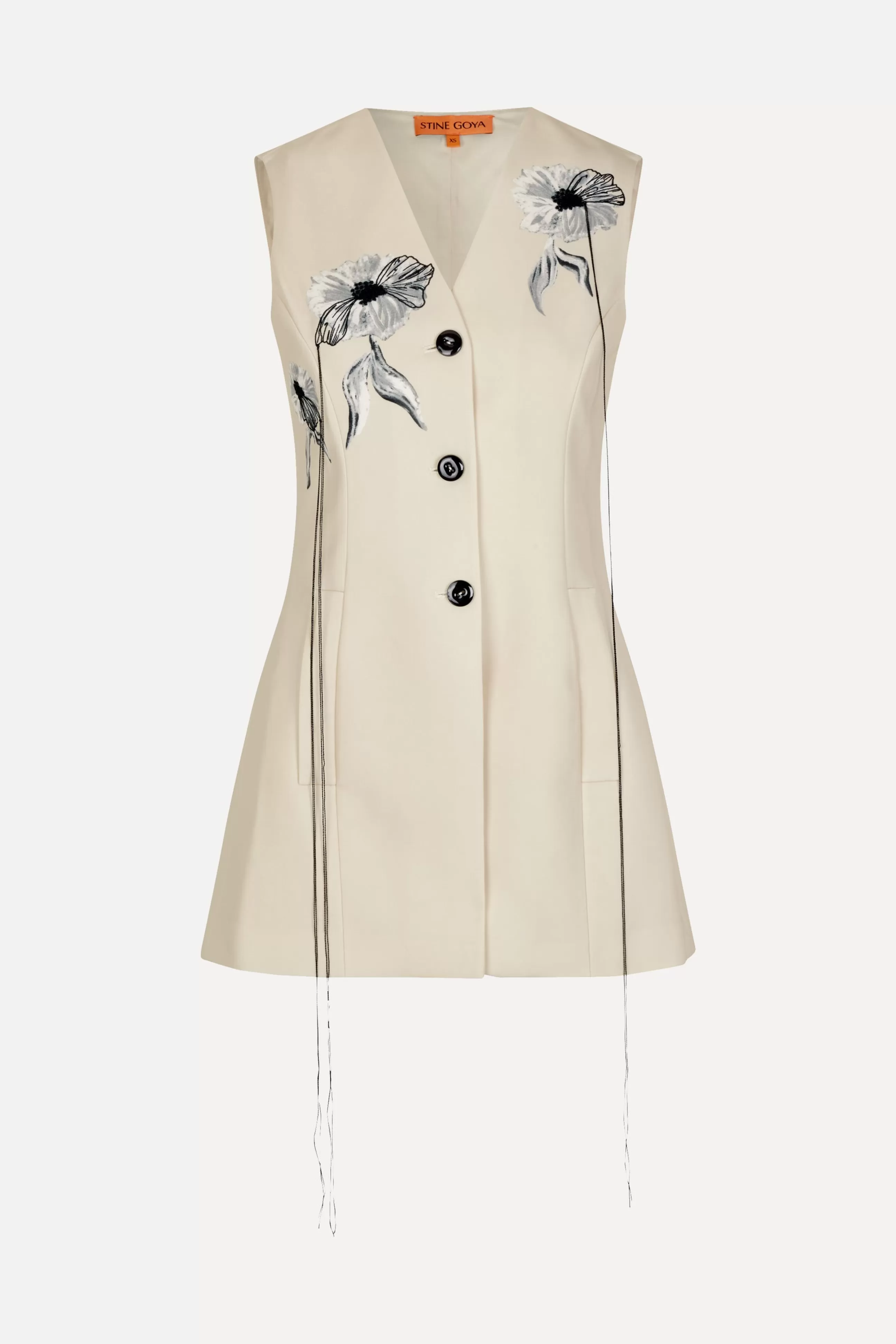 Skræddersyet vest i en cremefarvet vævet kvalitet med knaplukning, lommer og enkelt broderet blomstermønster. Helfore…
