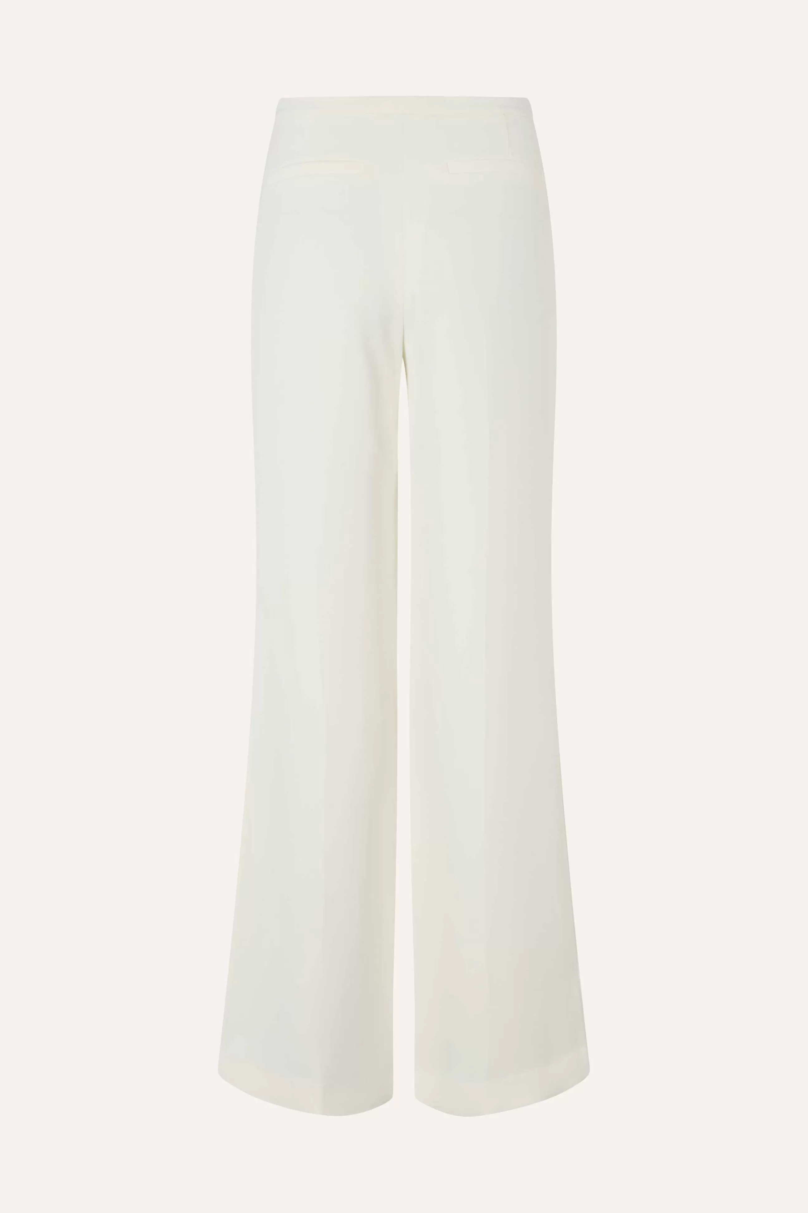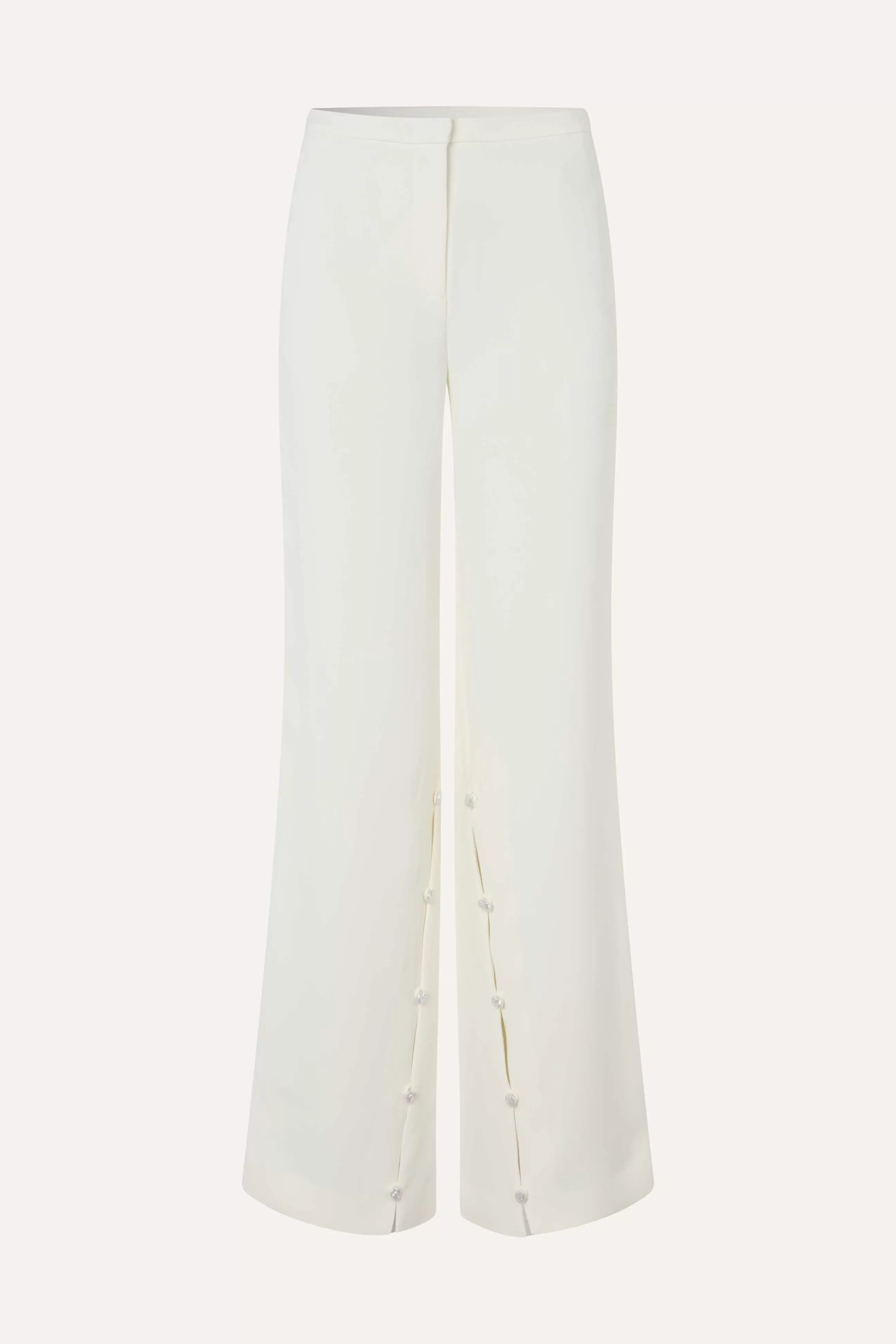 Hvide bukser i en let vævet kvalitet med vidde og høj talje, lynlås foran, samt høje slidser med perleknapper. Fuldend looket med den matchende jakke.