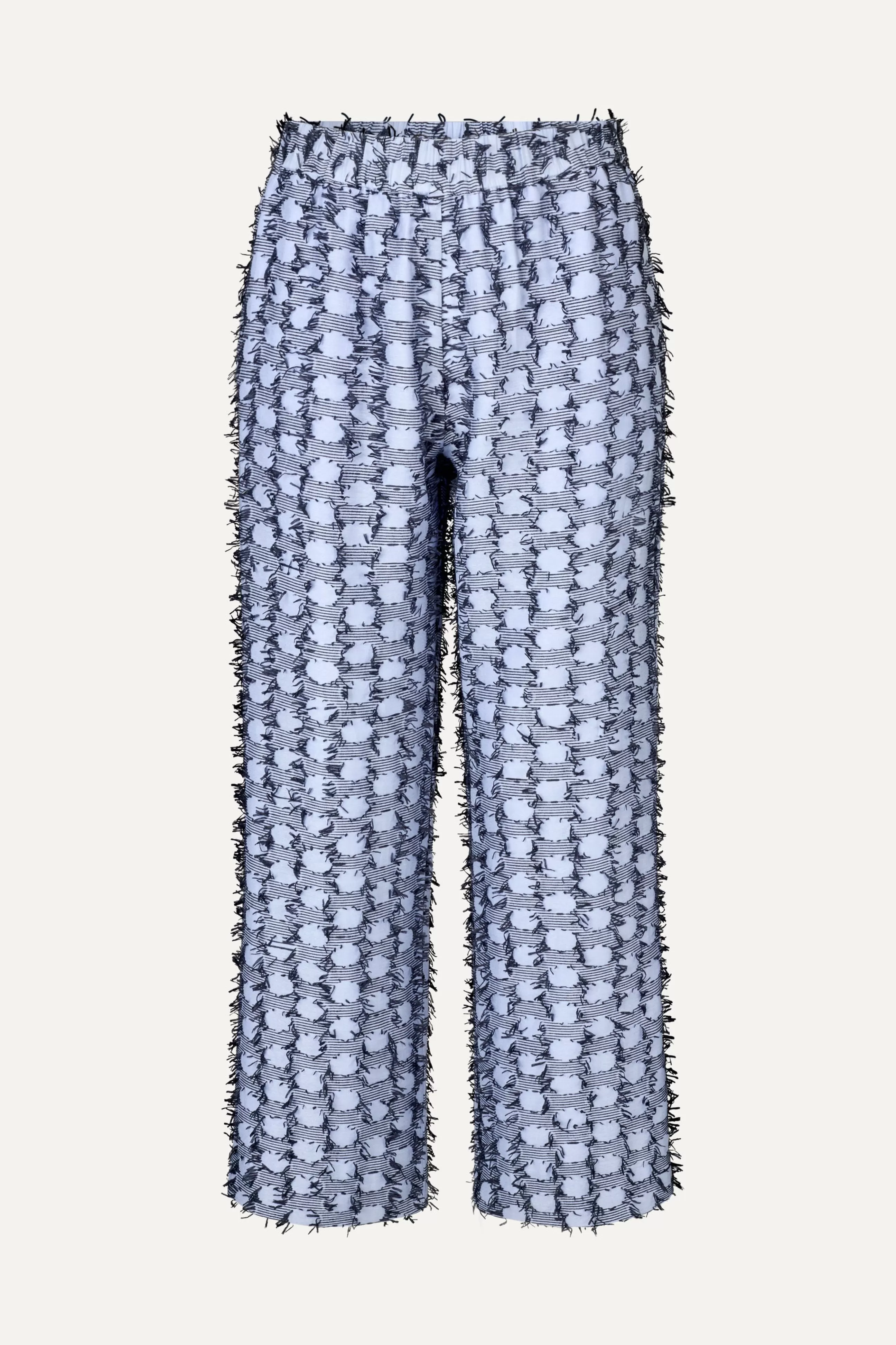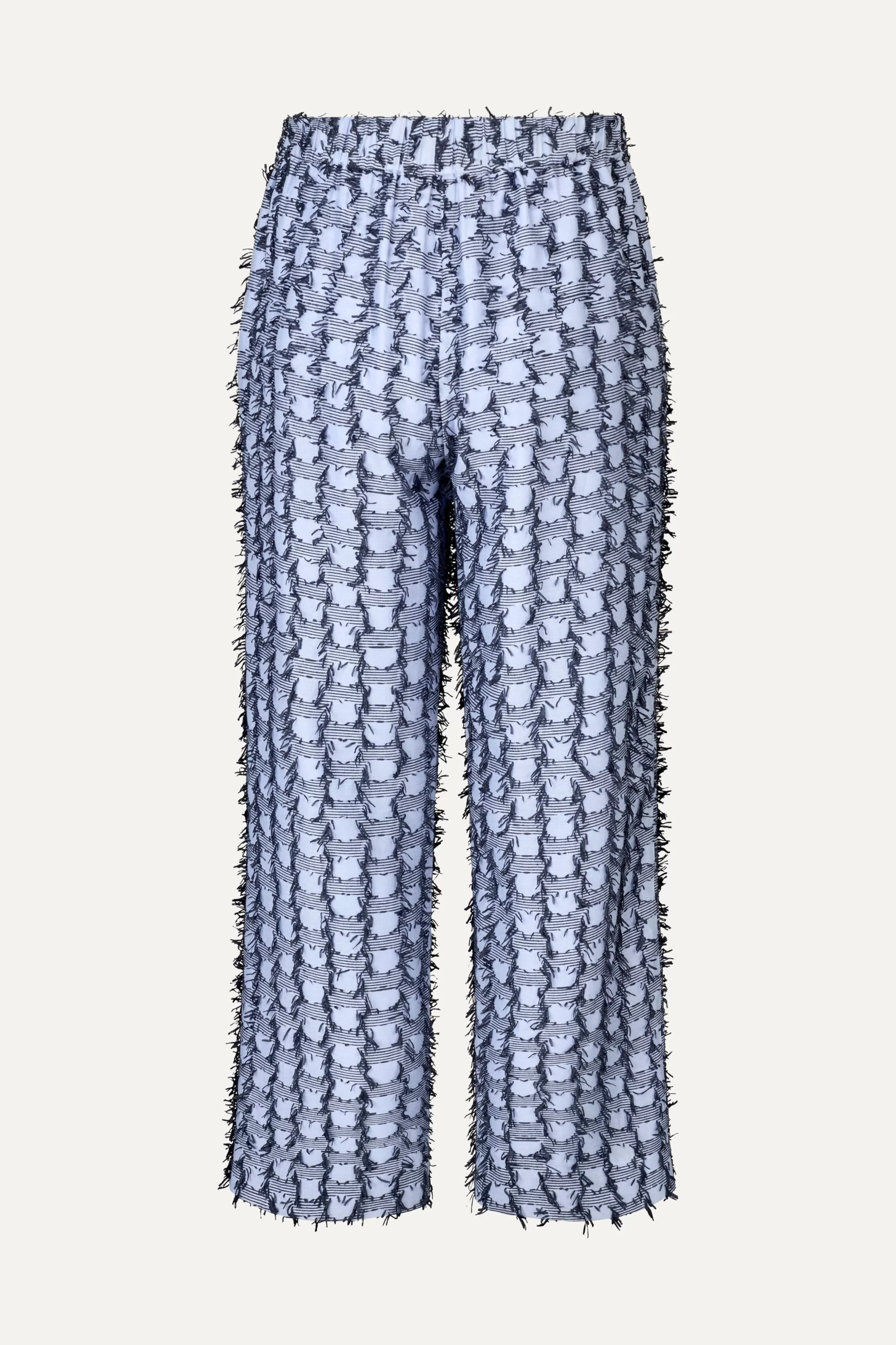 Lyseblå ankellange bukser i en delikat vævet kvalitet med struktur. Almindelig talje med beklædt elastik, sidelommer og lige ben. Helforet. Style dem med den matchende top for et fuldt look.