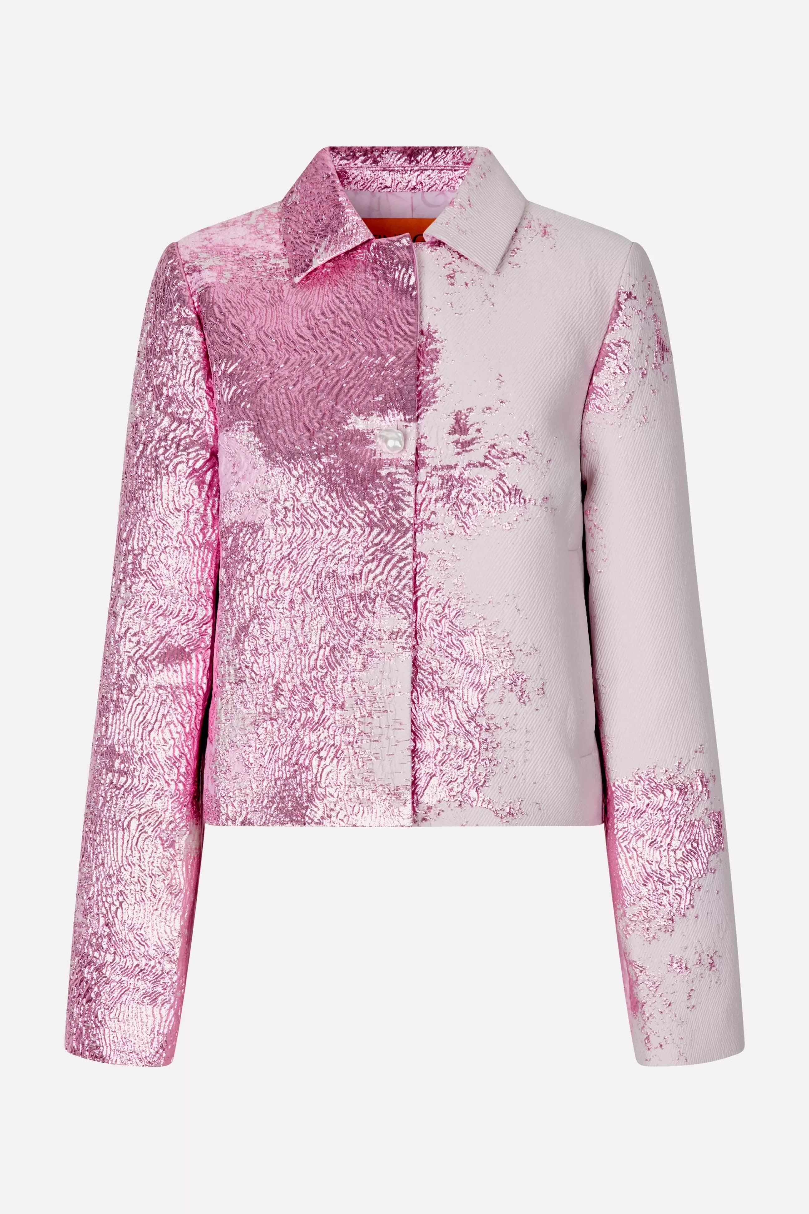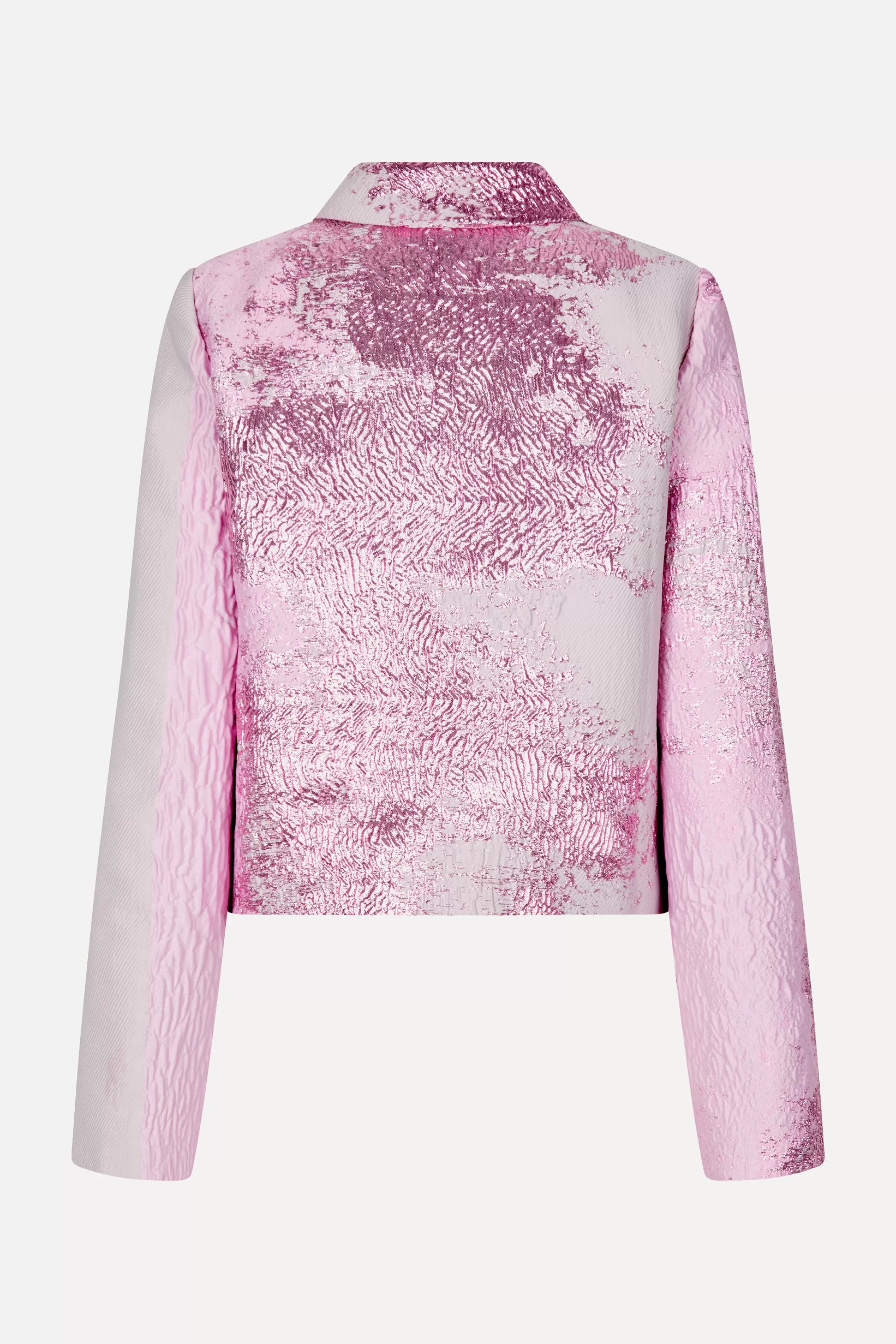 Kort lyserød jakke med jacquardvævet metallisk ombre-print, krave, lange ærmer og knaplukning