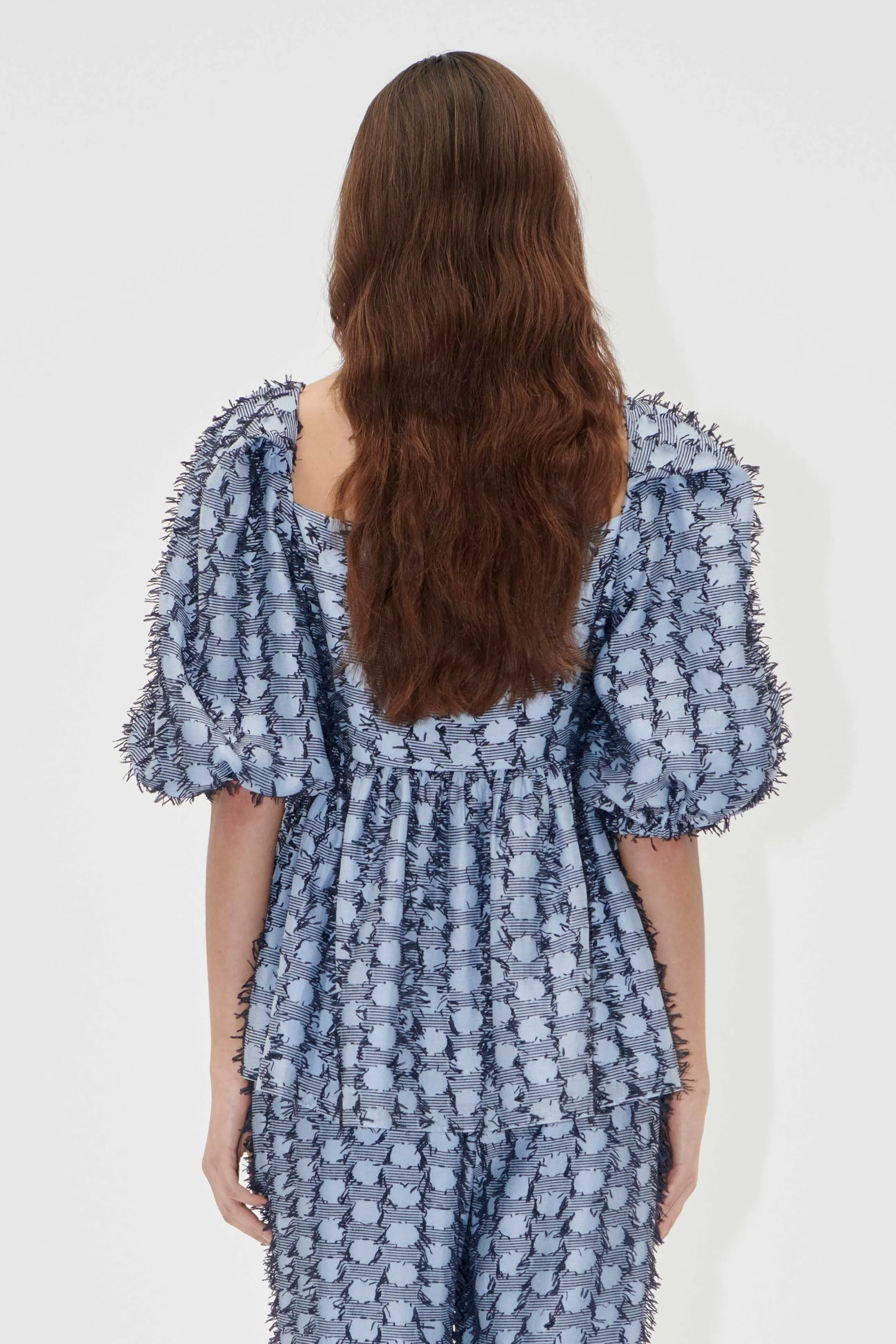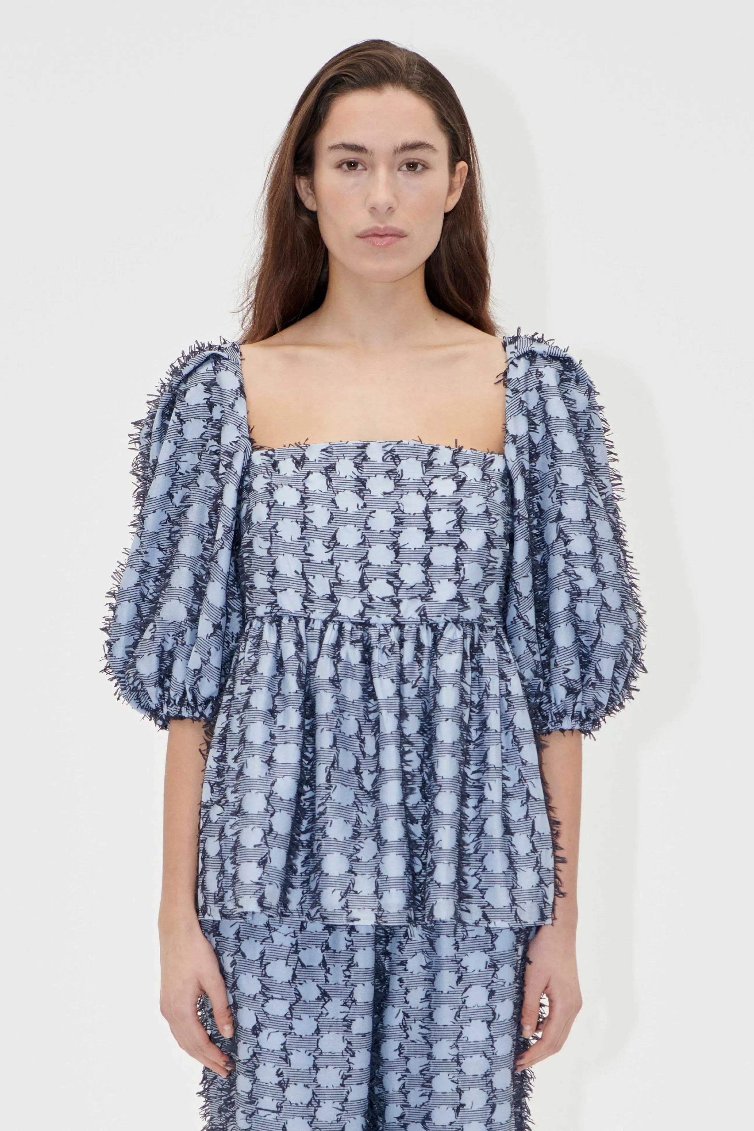 Lyseblå peplum top med sort struktur, korte pufærmer og firkantet halsudskæring. Skjult lynlås i siden.Eksklusivt ti…