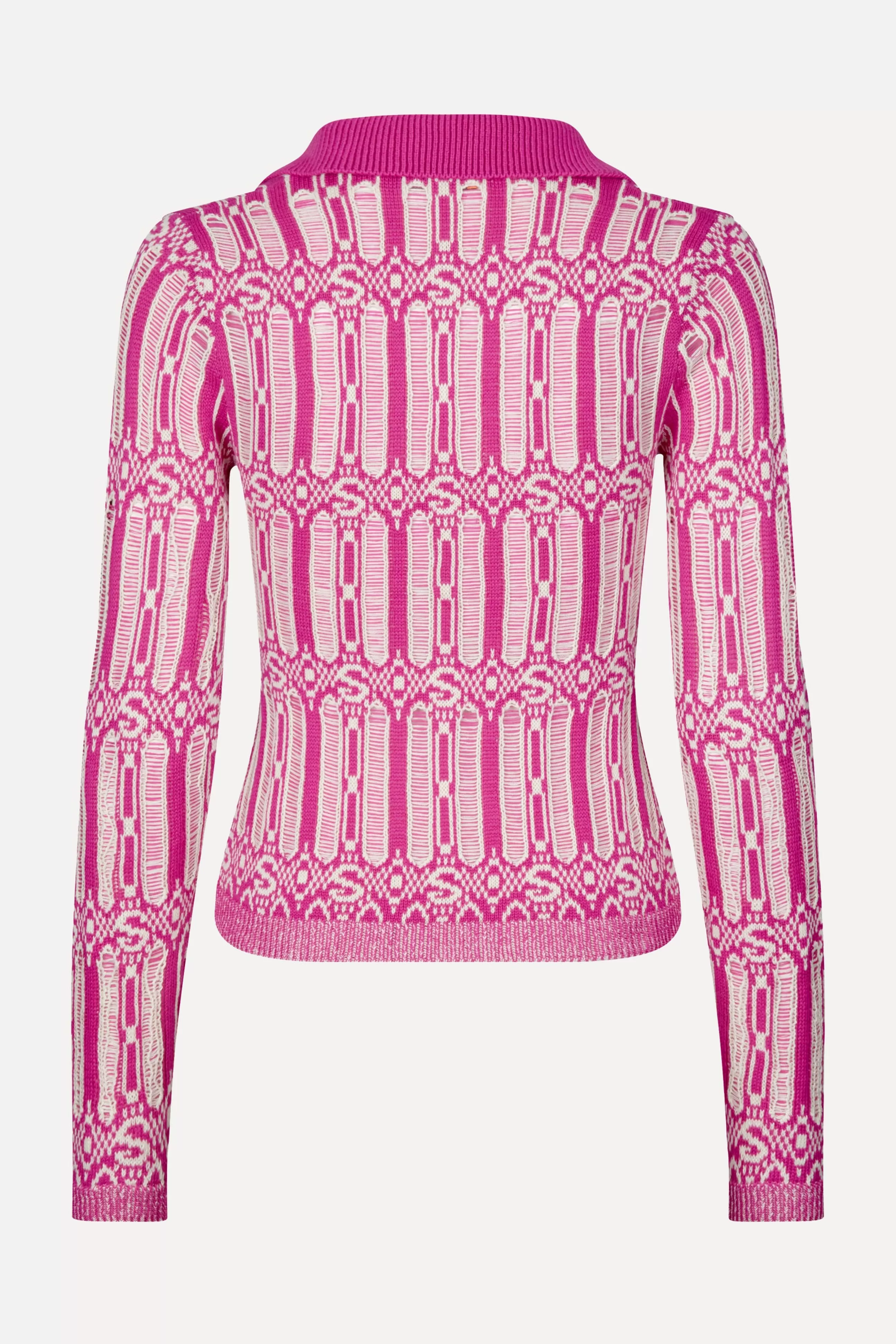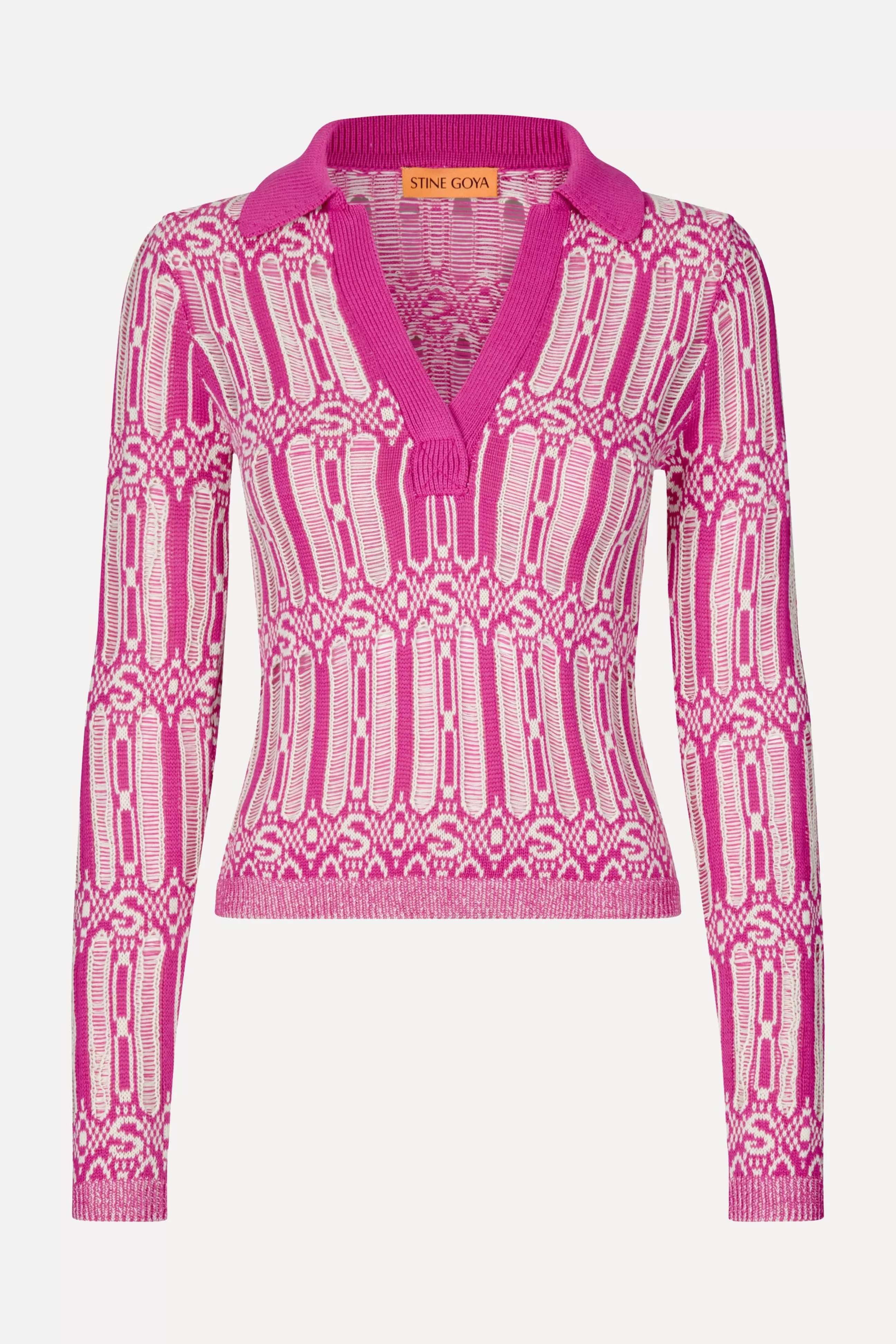 Figursyet langærmet striktrøje i pink med krave, V-udskæring og grafisk STINE GOYA logo mønster.