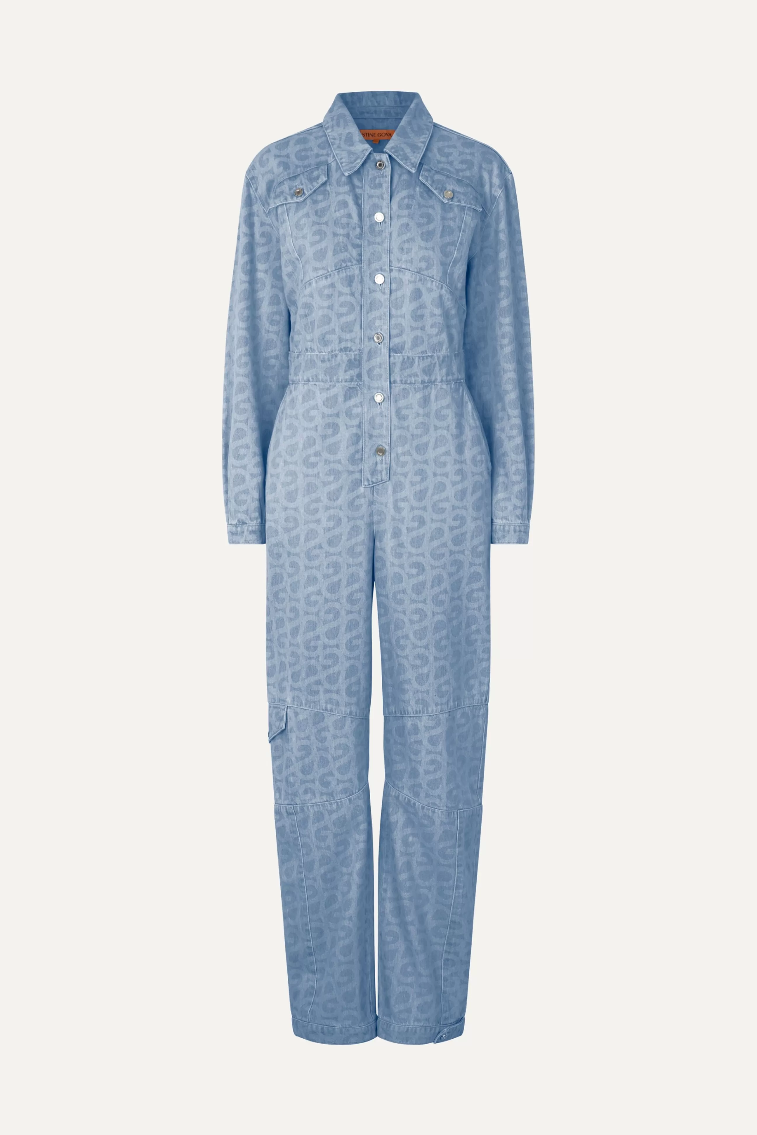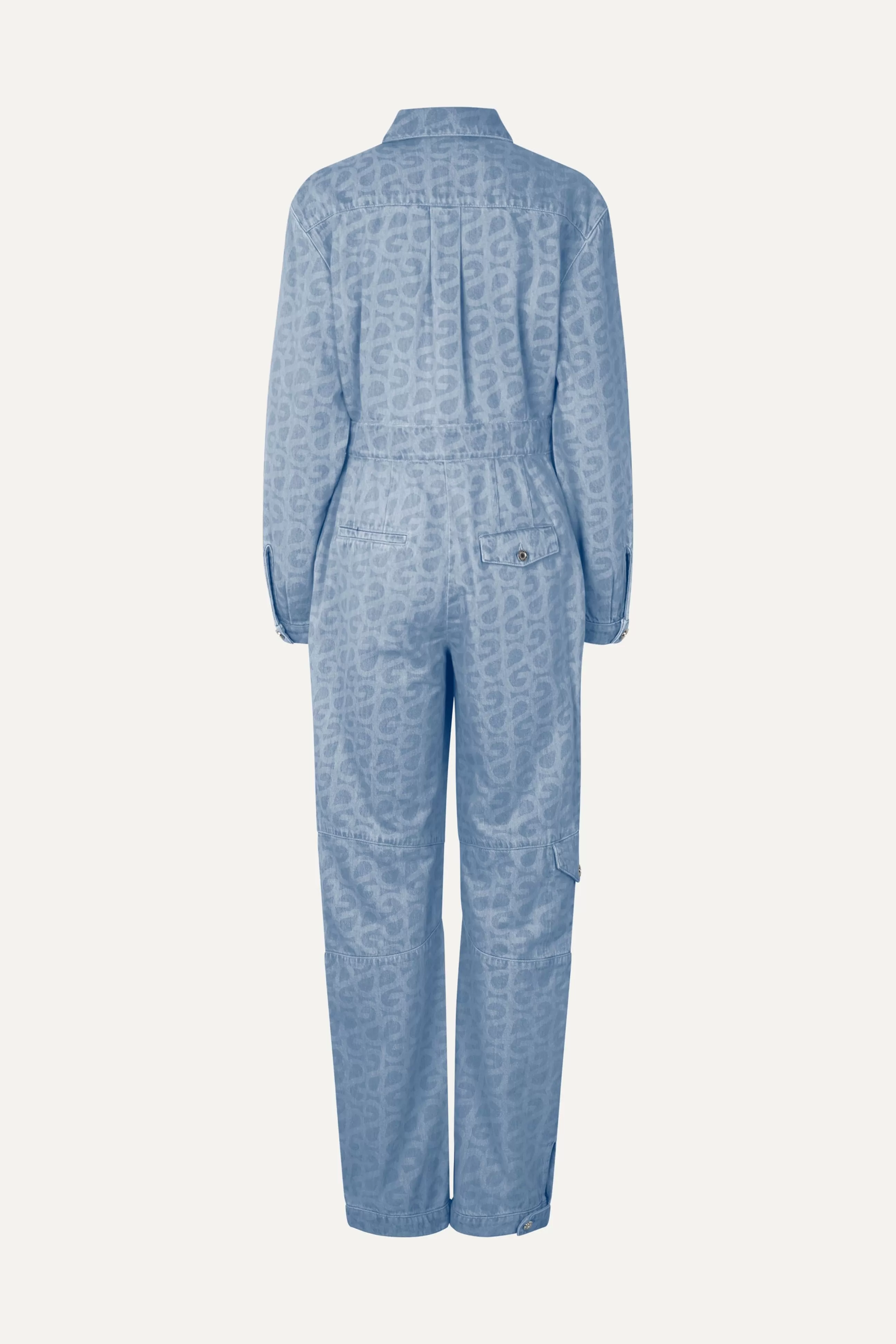 Langærmet jumpsuit i denim med krave, knaplukning foran, afslappet pasform og diskret STINE GOYA logo mønster. Detaljeret med brystlommer og sidelommer.