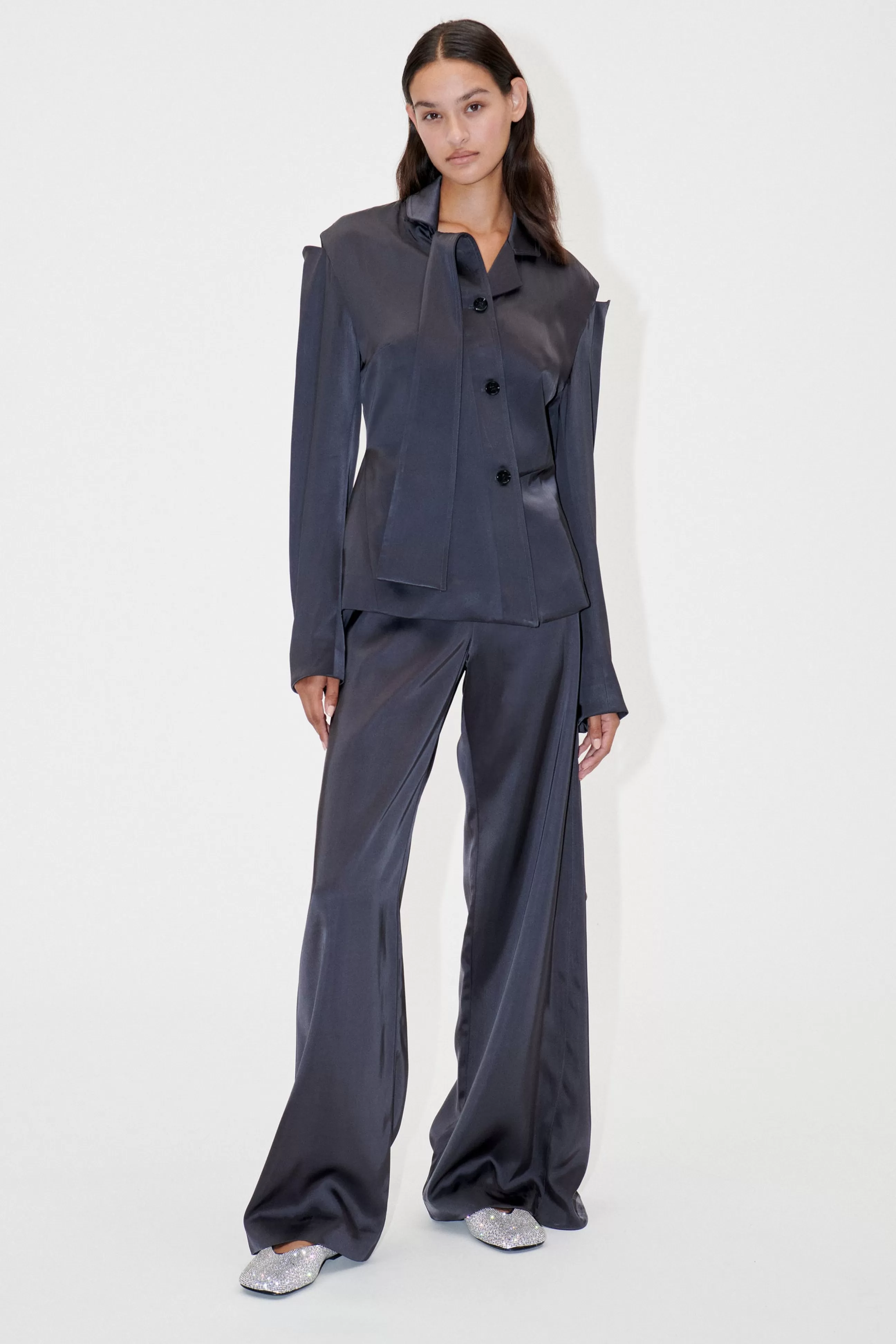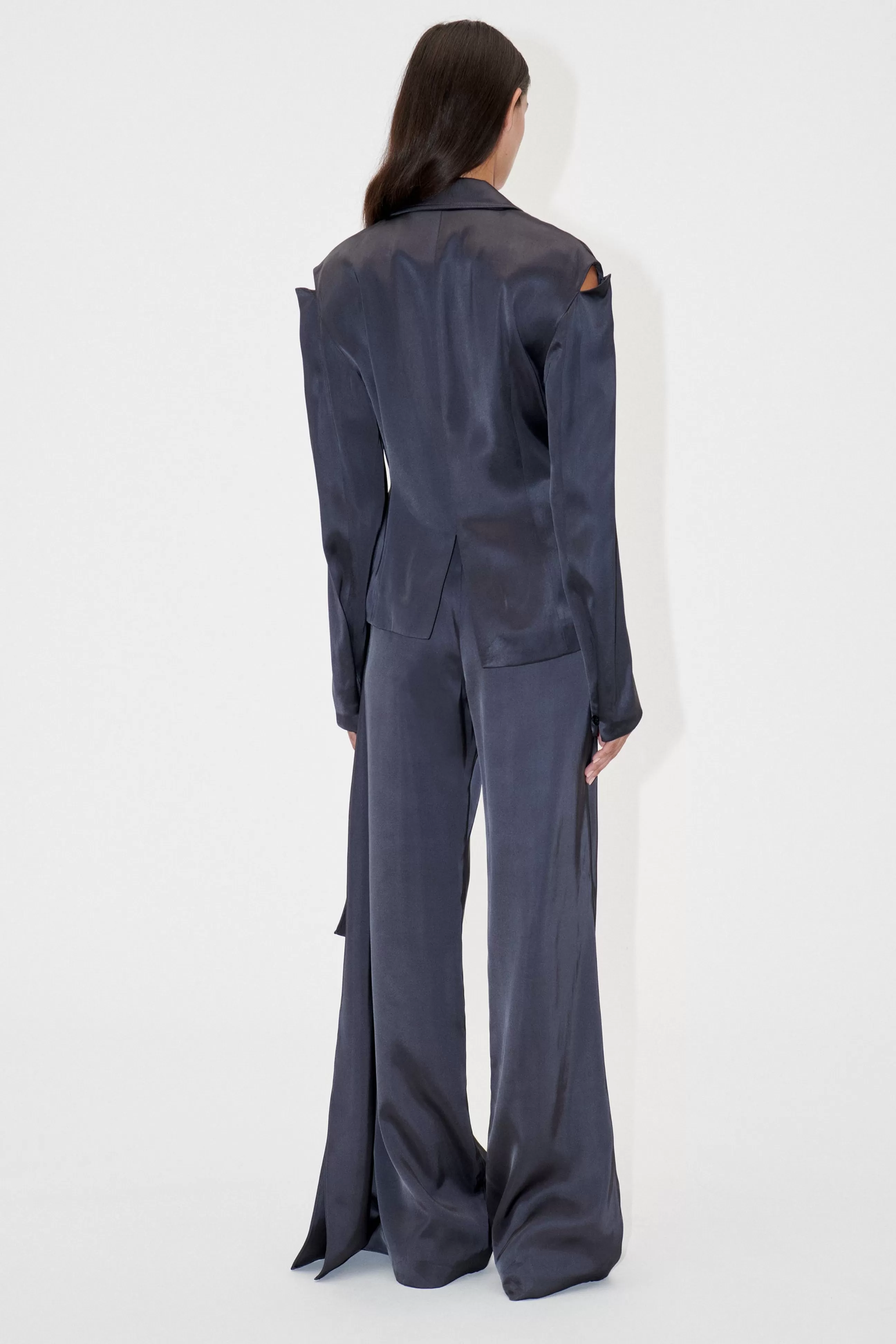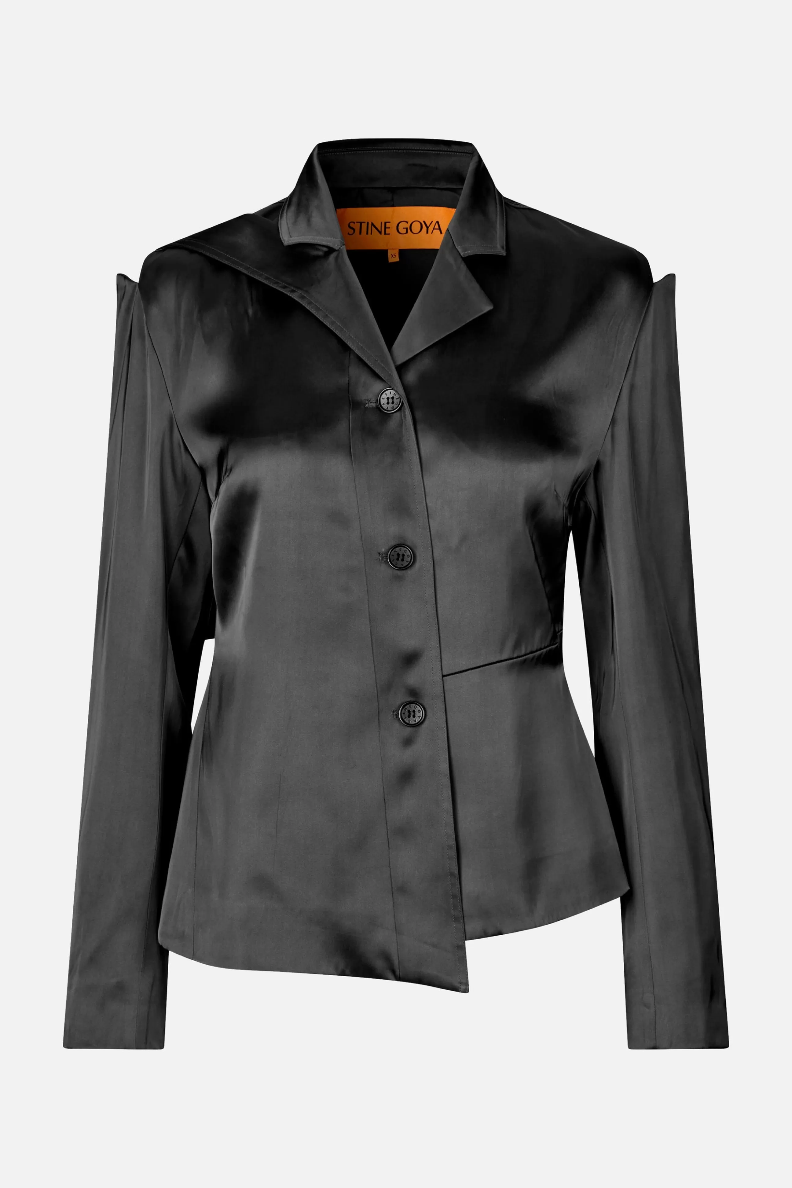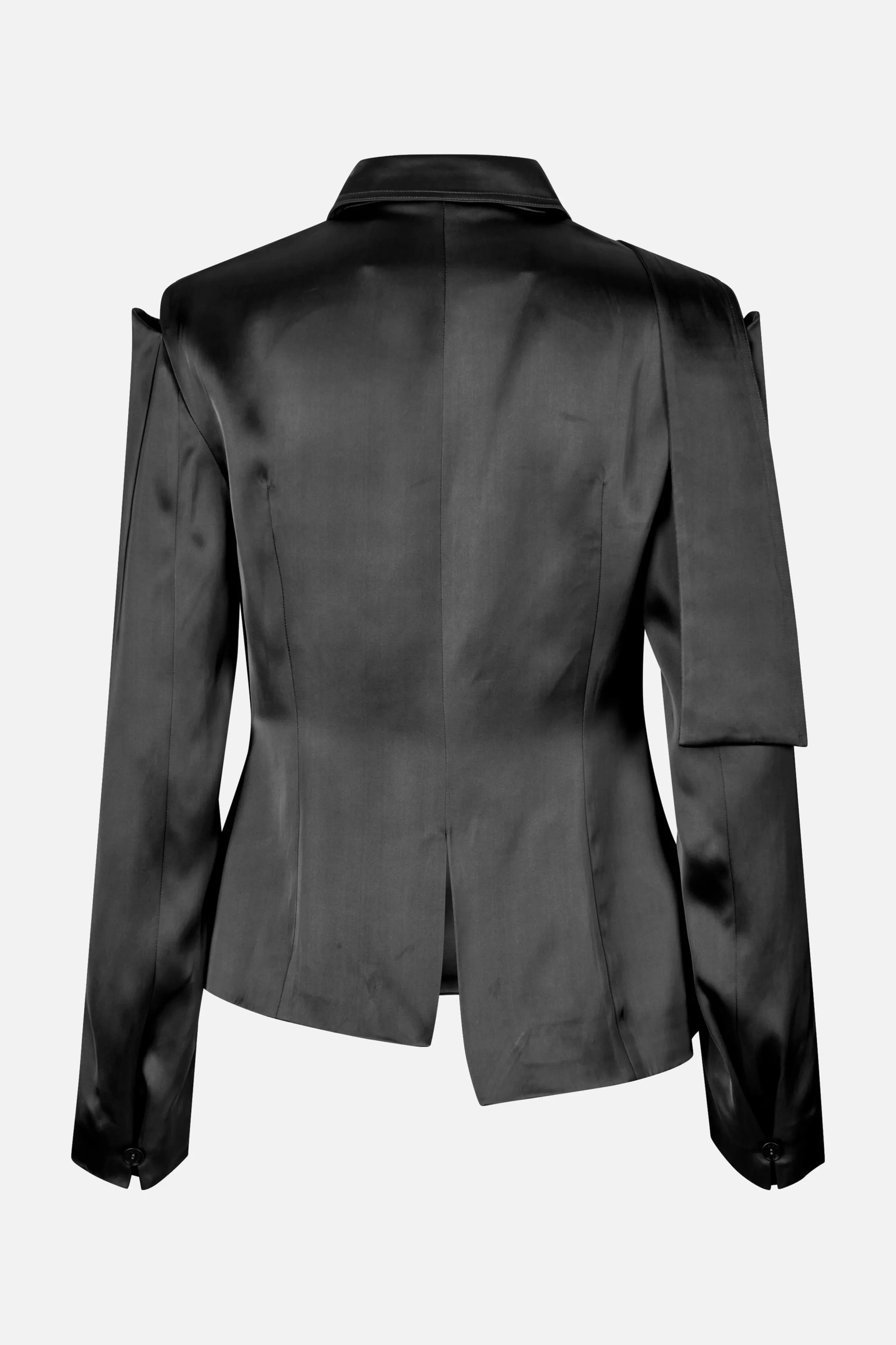 Figursyet sort blazer jakke med asymmetrisk pasform, skarp krave og cut-out skulderdetalje i blankt materiale.