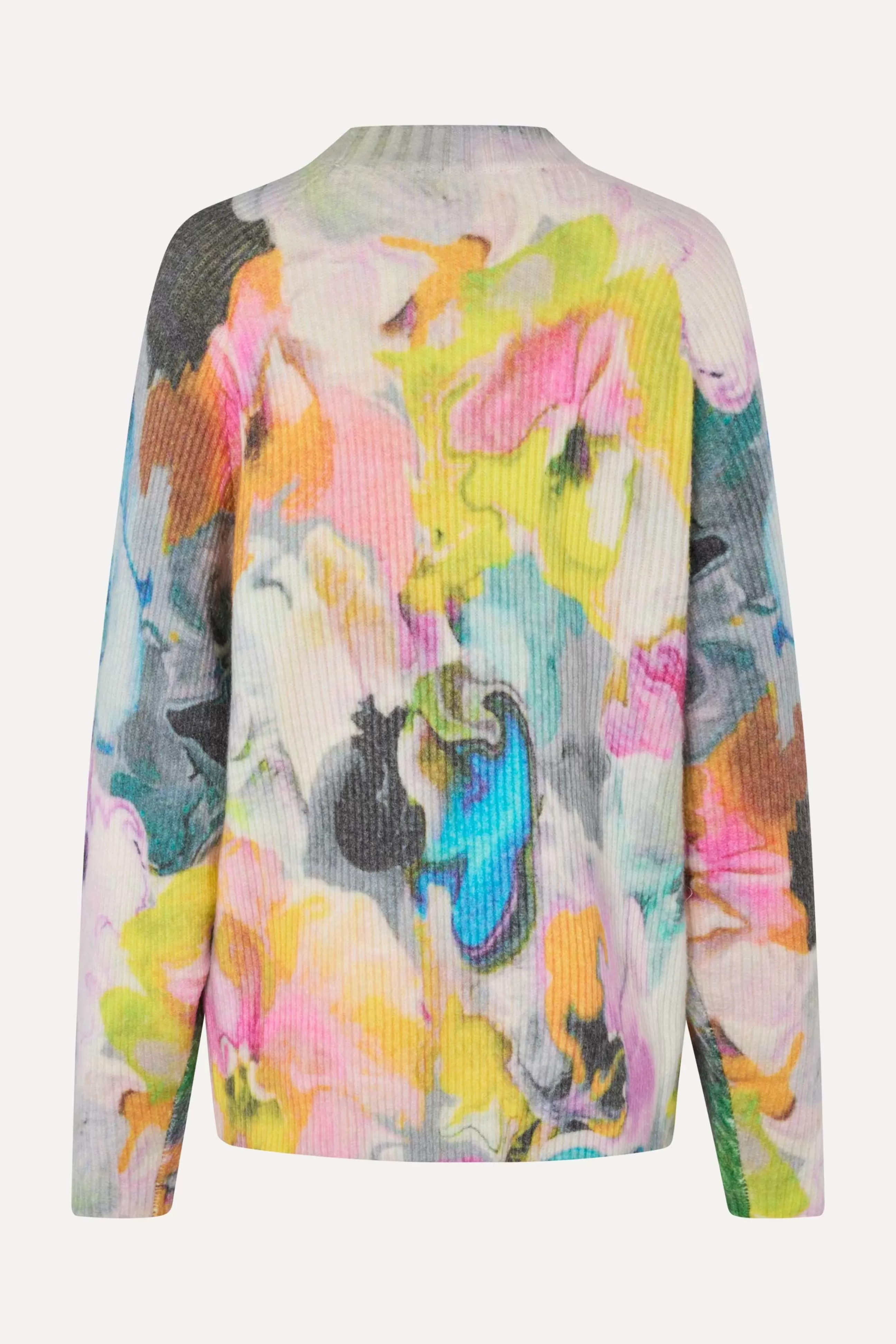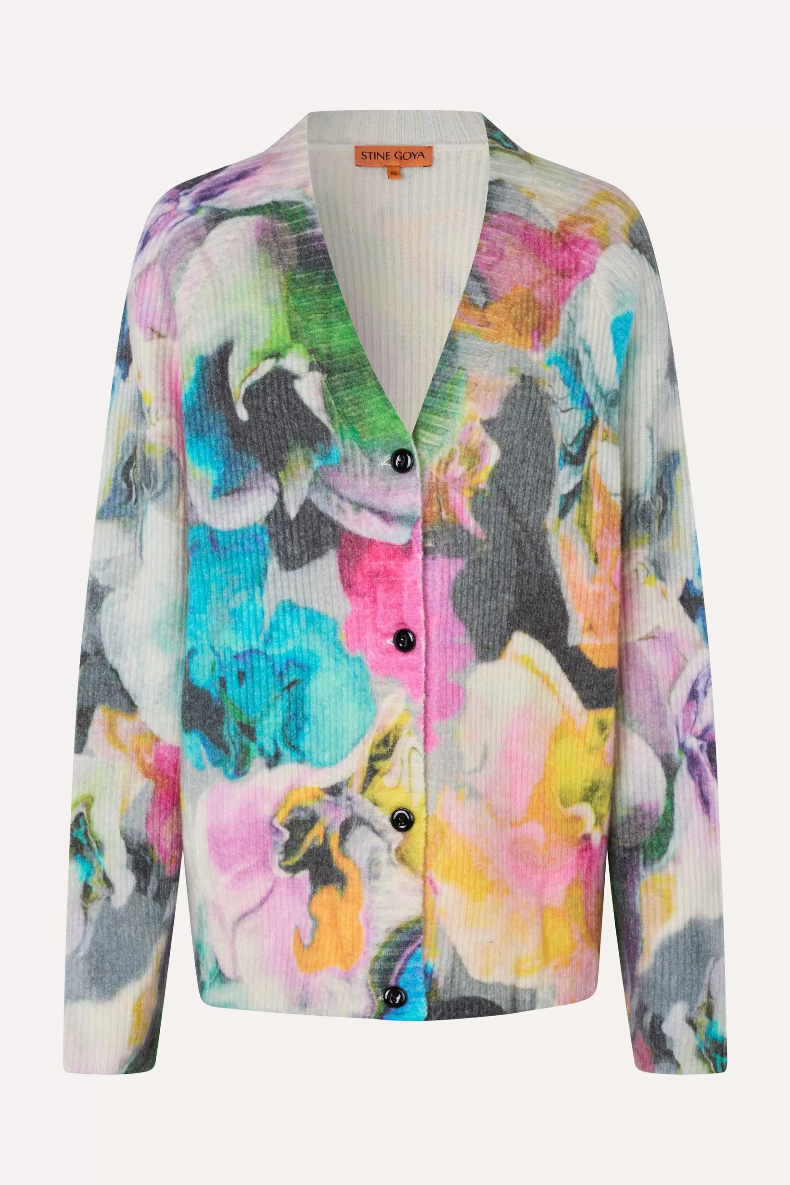 Afslappet cardigan med abstrakt blomster print, V-udskæring og knaplukning med STINE GOYA logo.47% Nylon/25% Uld/25% Ak…