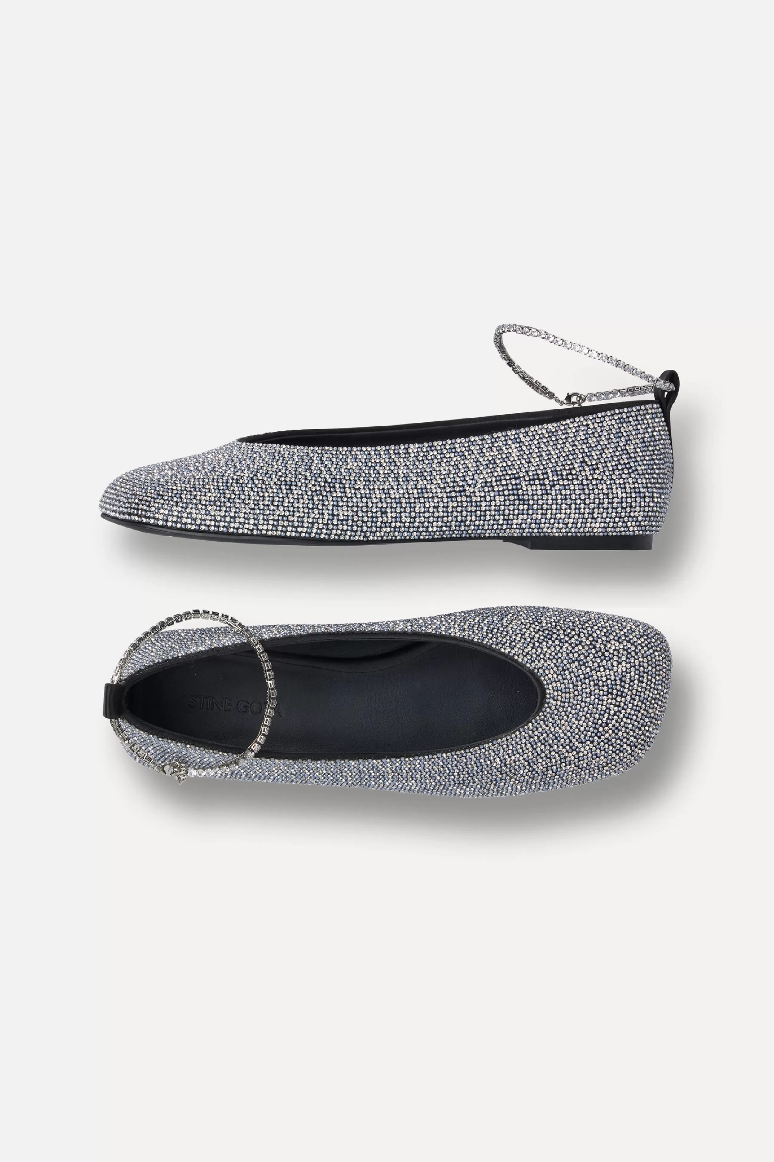 Komfortable sorte ballerina sko med krystal udsmykning, afrundet firkantet snude og aftagelig ankelkæde med krystaller….