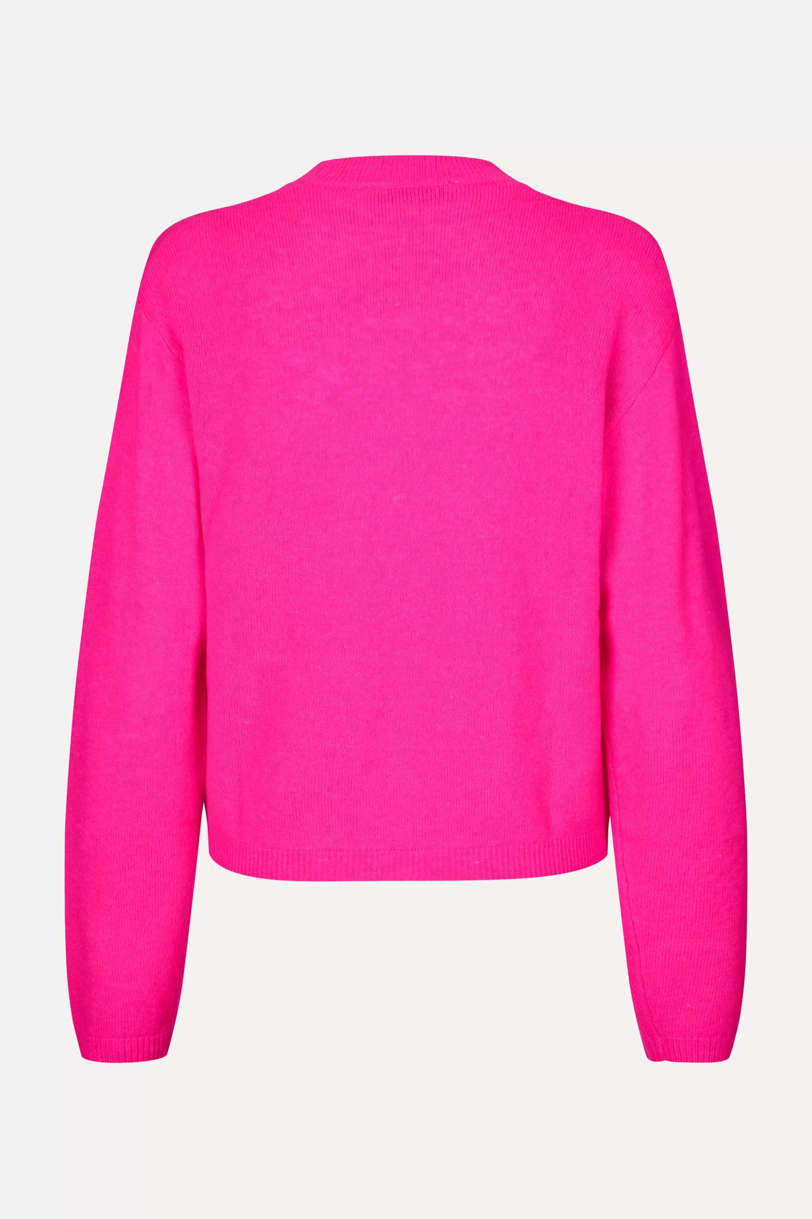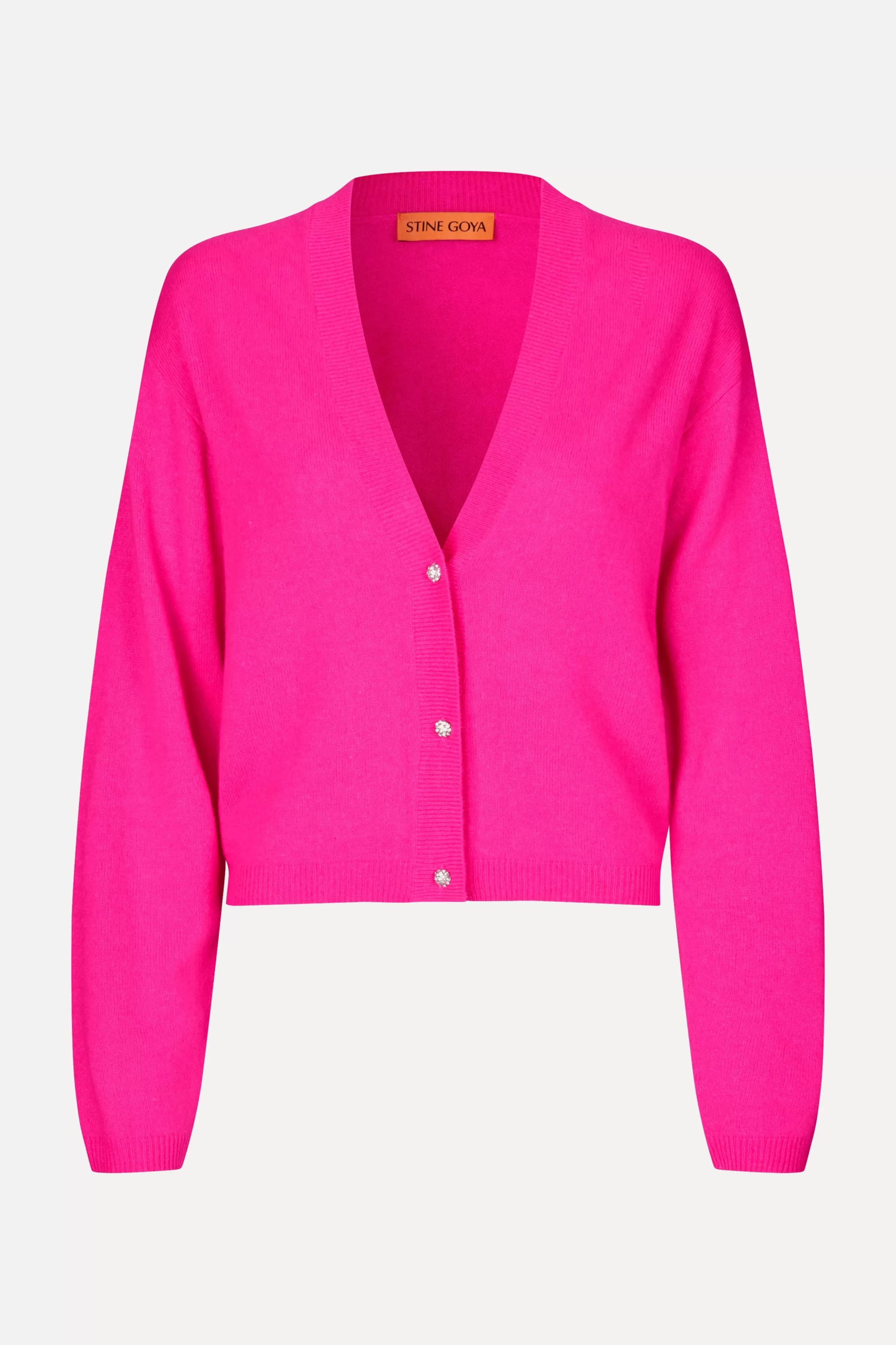 Pink cardigan, strikket i blød RWS certificeret merino uld blanding, med dyb V-udskæring, dekorative perleknapper foran, og lange ærmer. Ribstrikket kant langs knapstolpen samt nederst på ærmerne og Forneden .