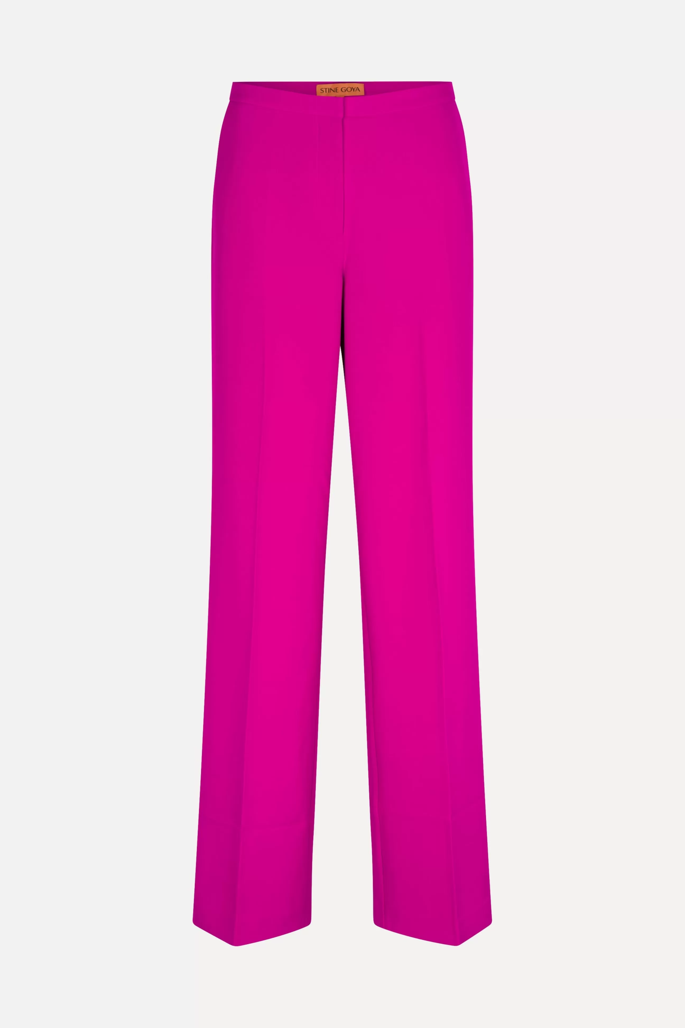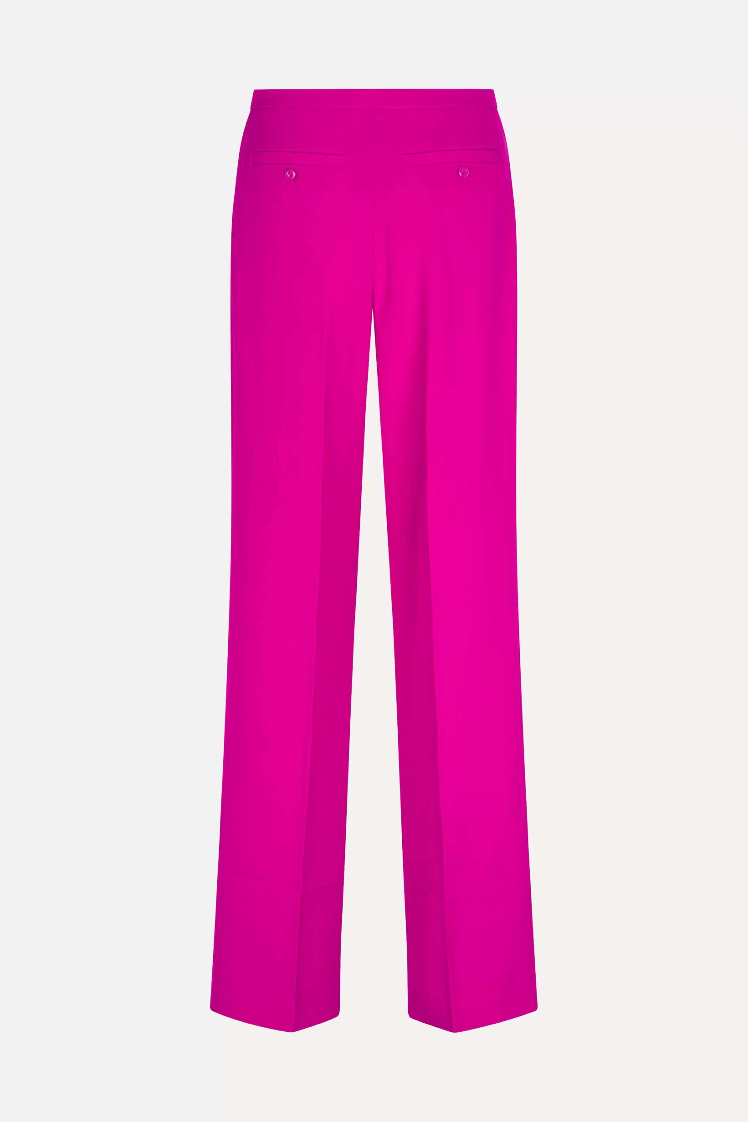 Pink bukser i vævet kvalitet med lynlås og skjult lukning med hægte og malle, samt skrå forlommer og paspolerede lommer bagpå. Designet med lige ben med pressefolder.