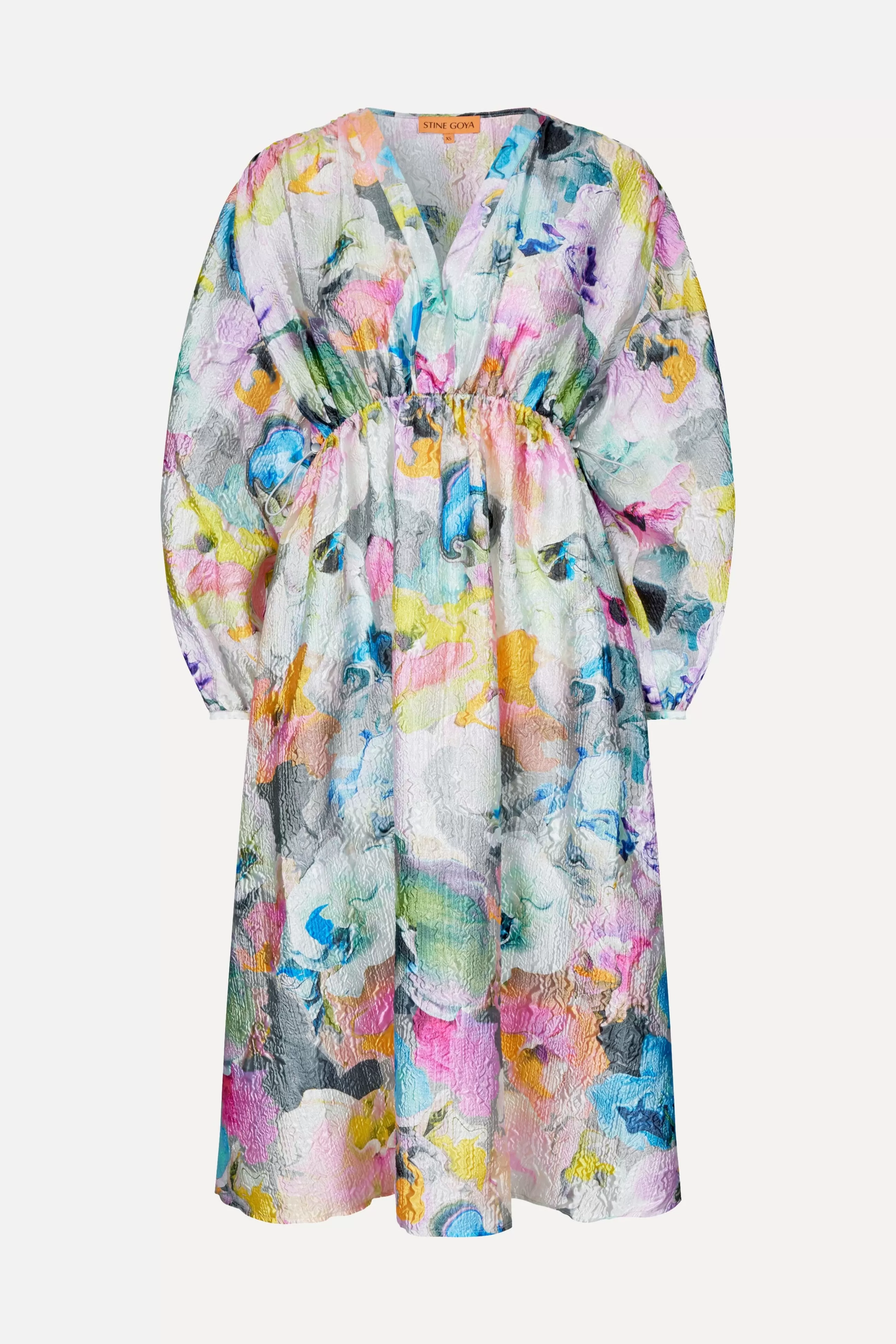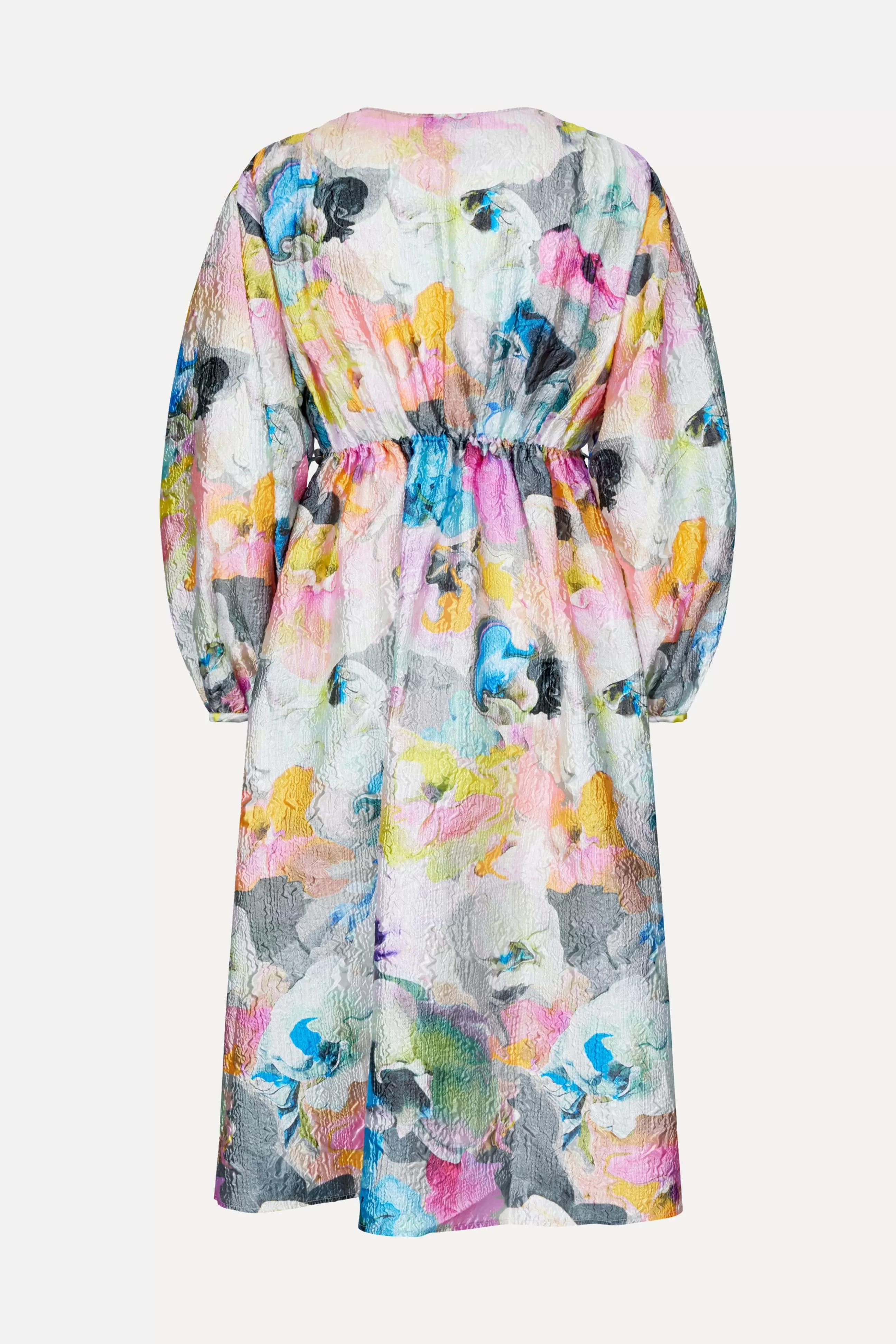 Afslappet midi-kjole med abstrakt blomster print, lange voluminøse ærmer og V-udskæring. Justerbar elastisk talje.