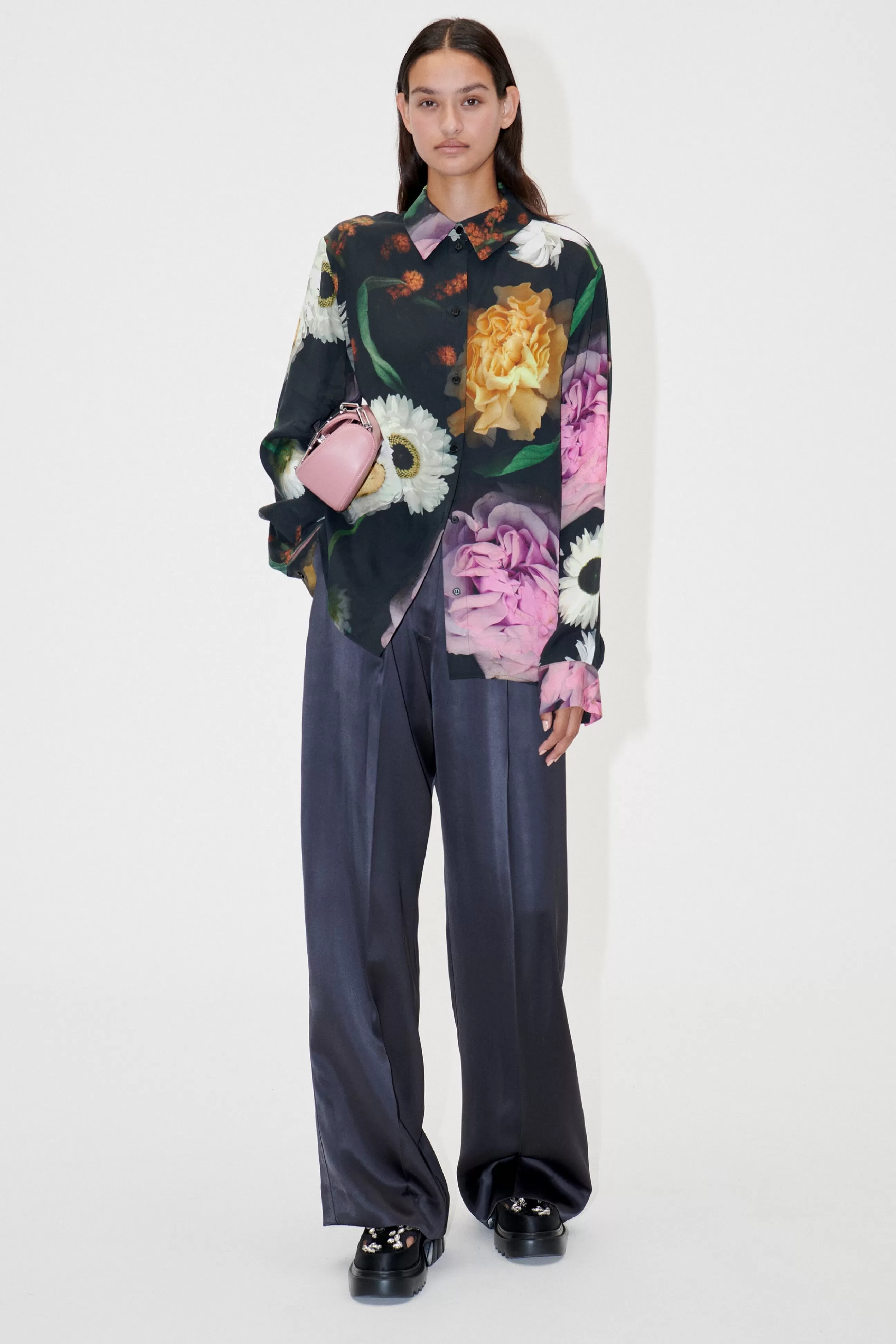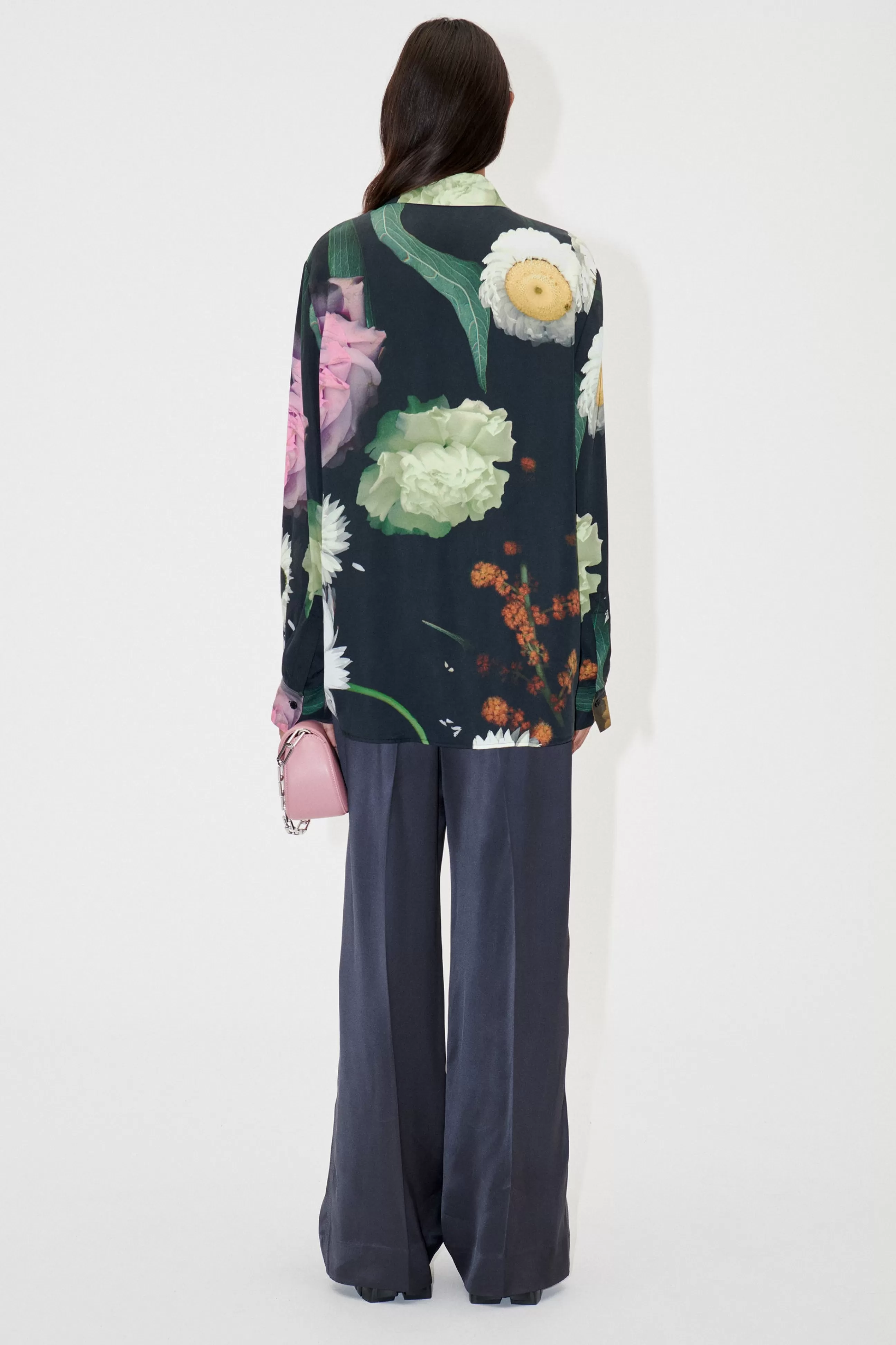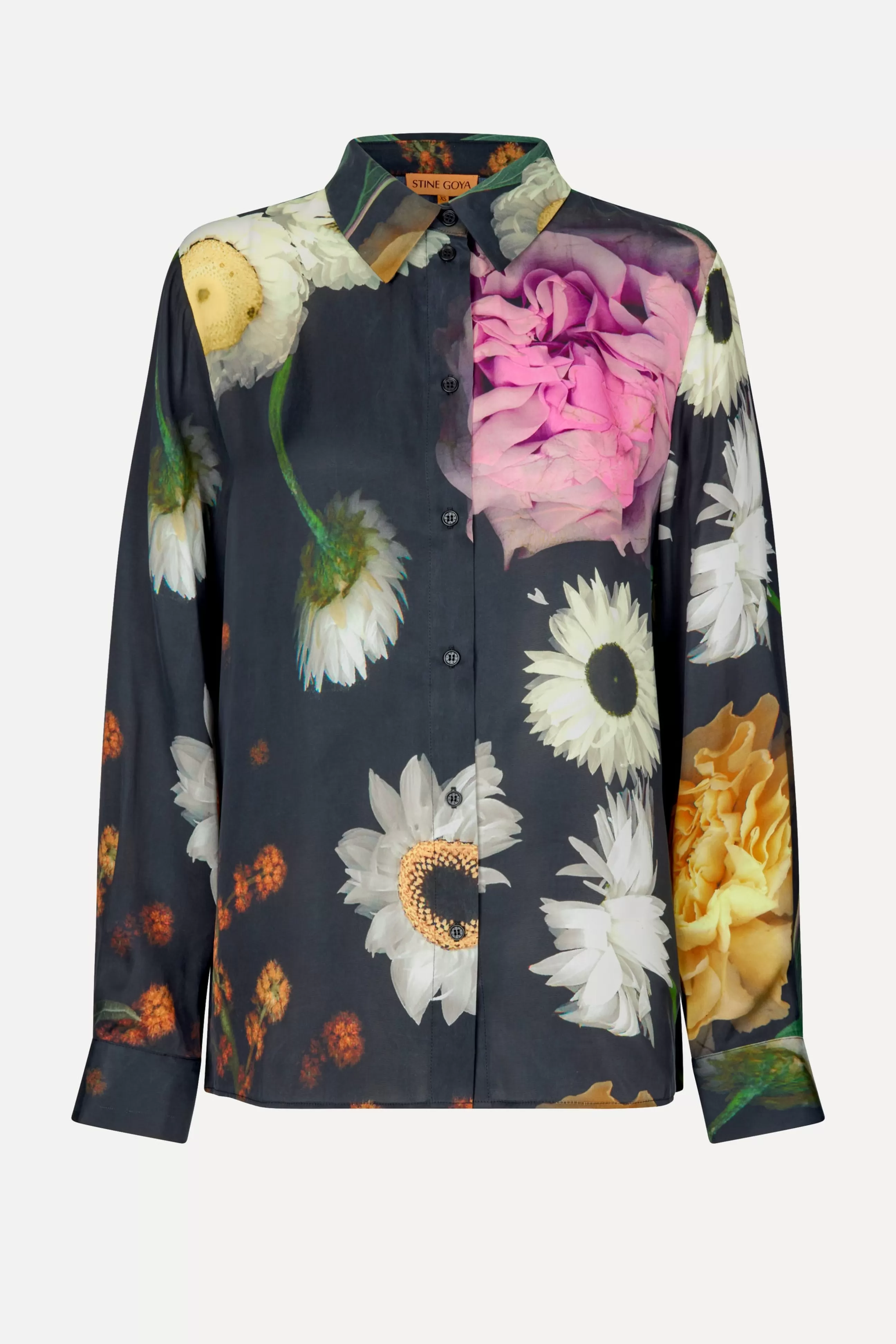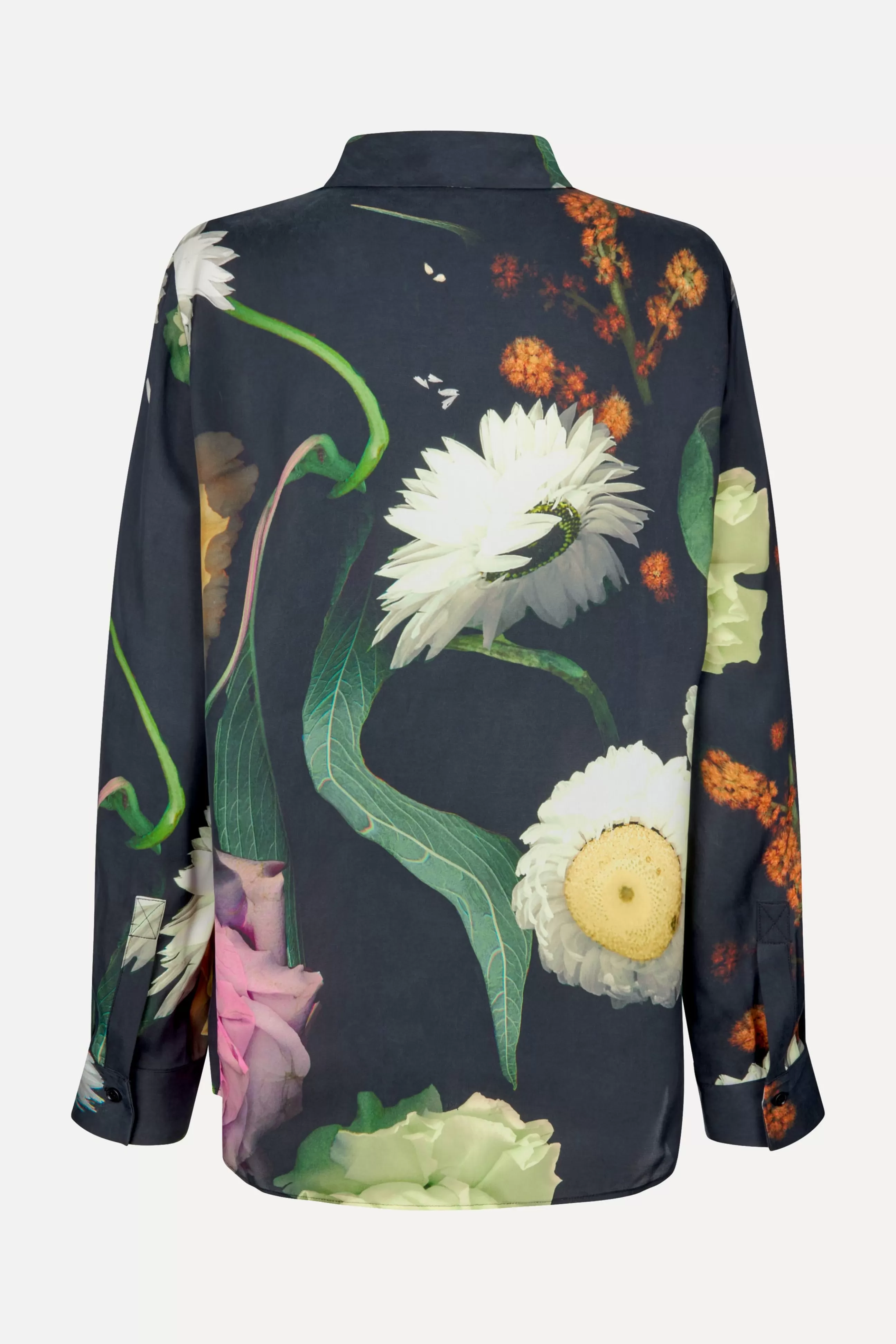 Afslappet sort skjorte med blomster print, knapper foran, lange ærmer med manchetter og lille krave.