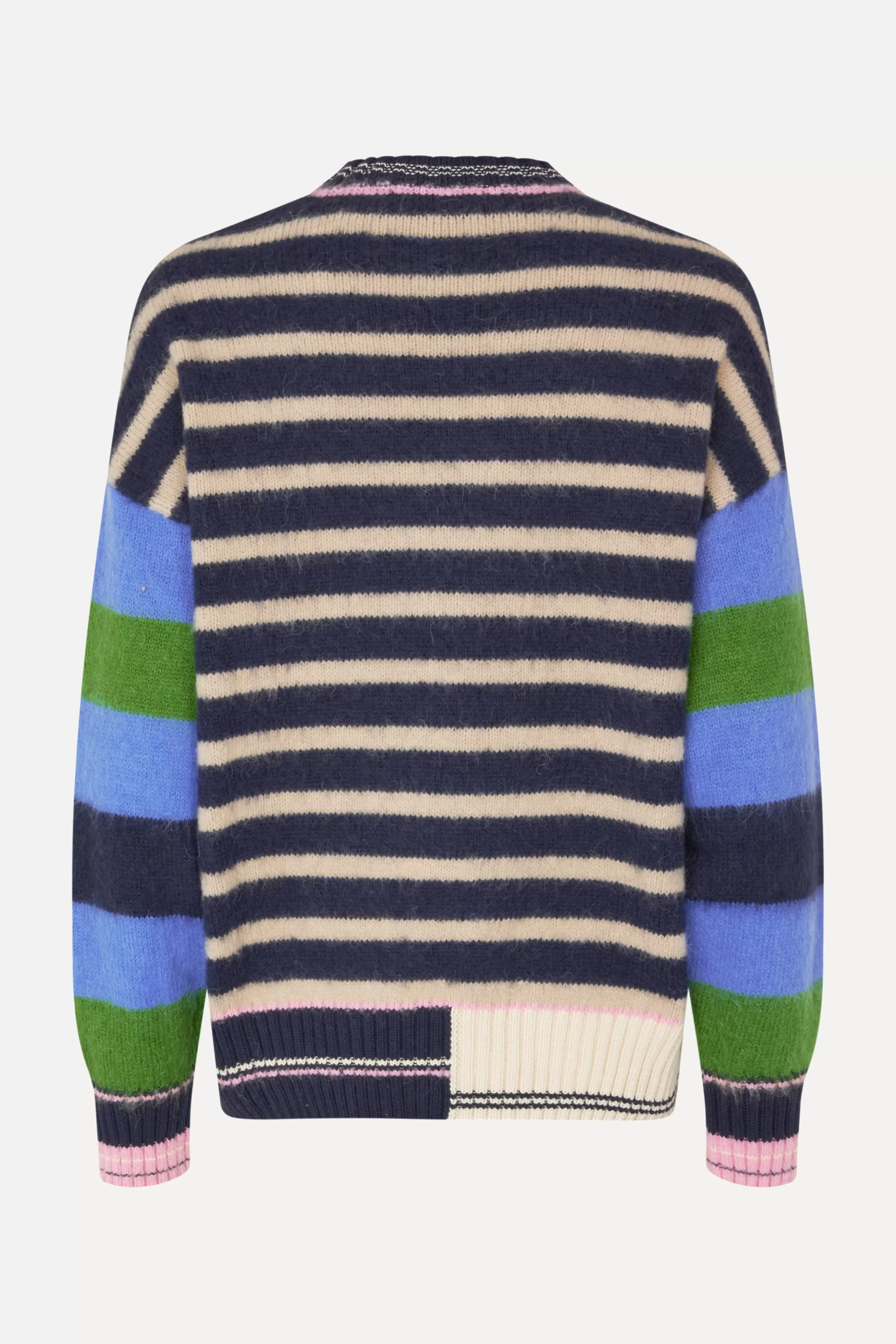 Oversized strik trøje med farverige striber og colour block design. Designet med lange ærmer og rund hals. Ribstrikket manchetter og kant. Fremstillet i Italien af en fluffy alpaca blanding.