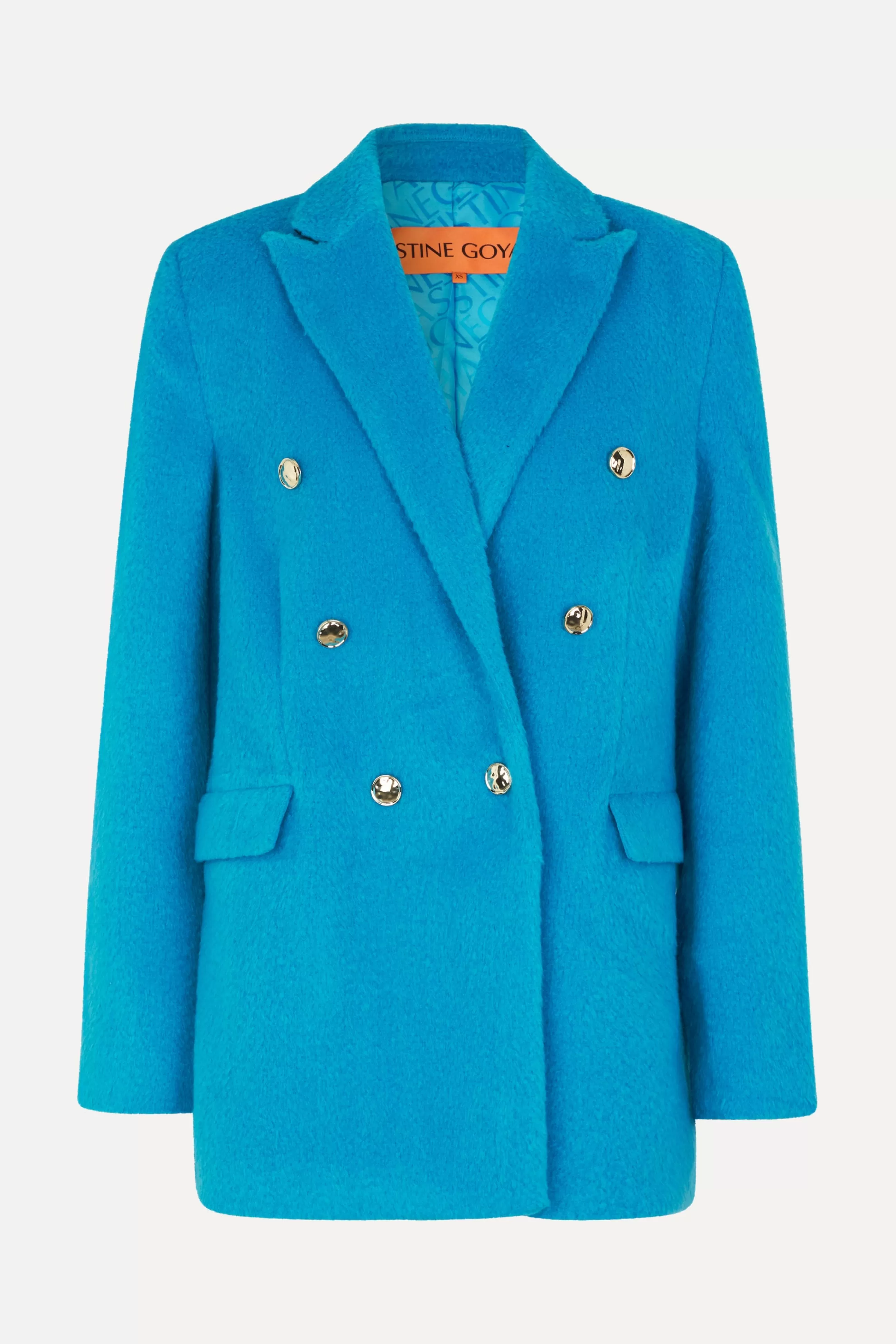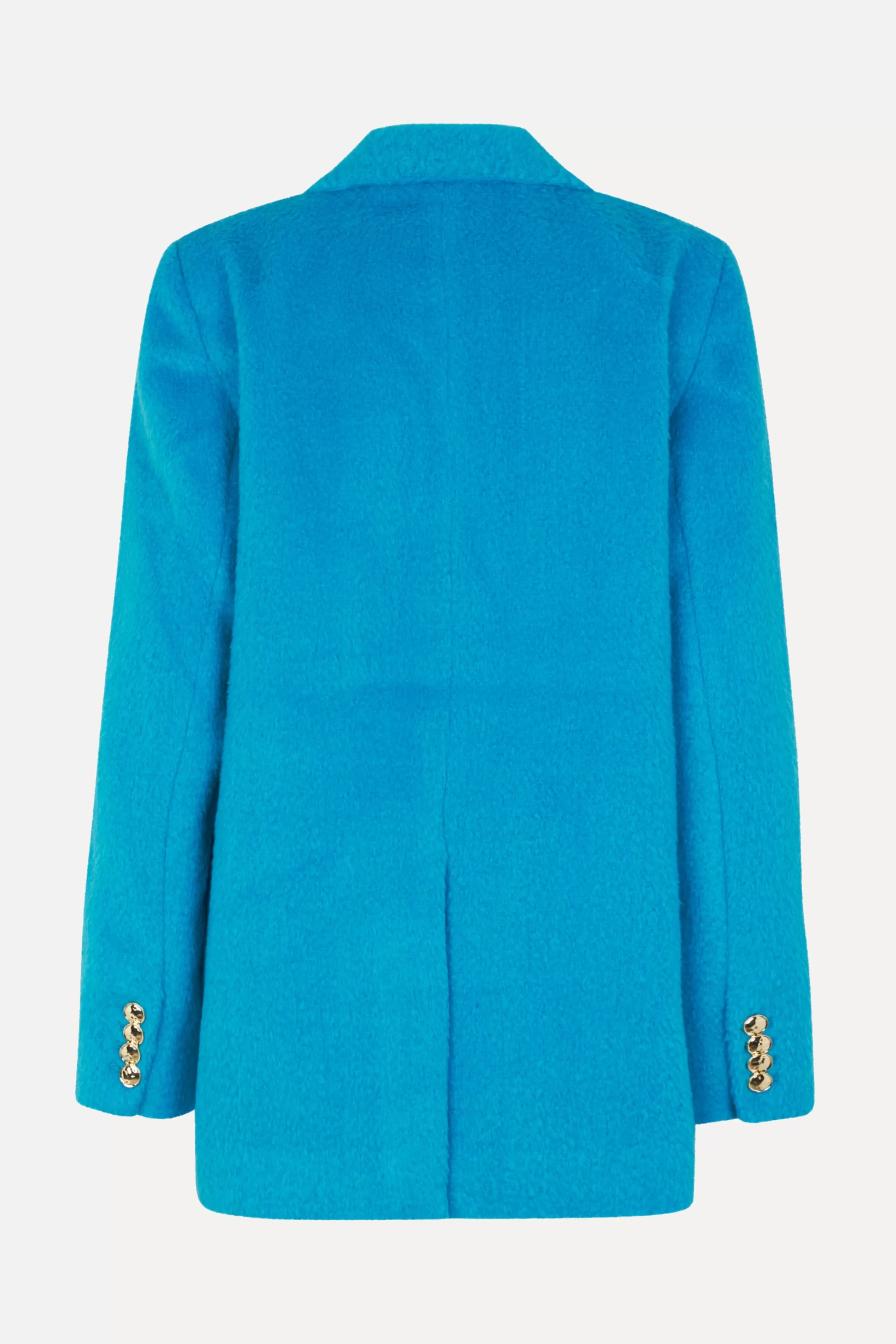 Oversized blå dobbeltradet blazer med en struktureret silhuet, skjulte påsatte lommer og blødt teddy-materiale. Fuldt foret.