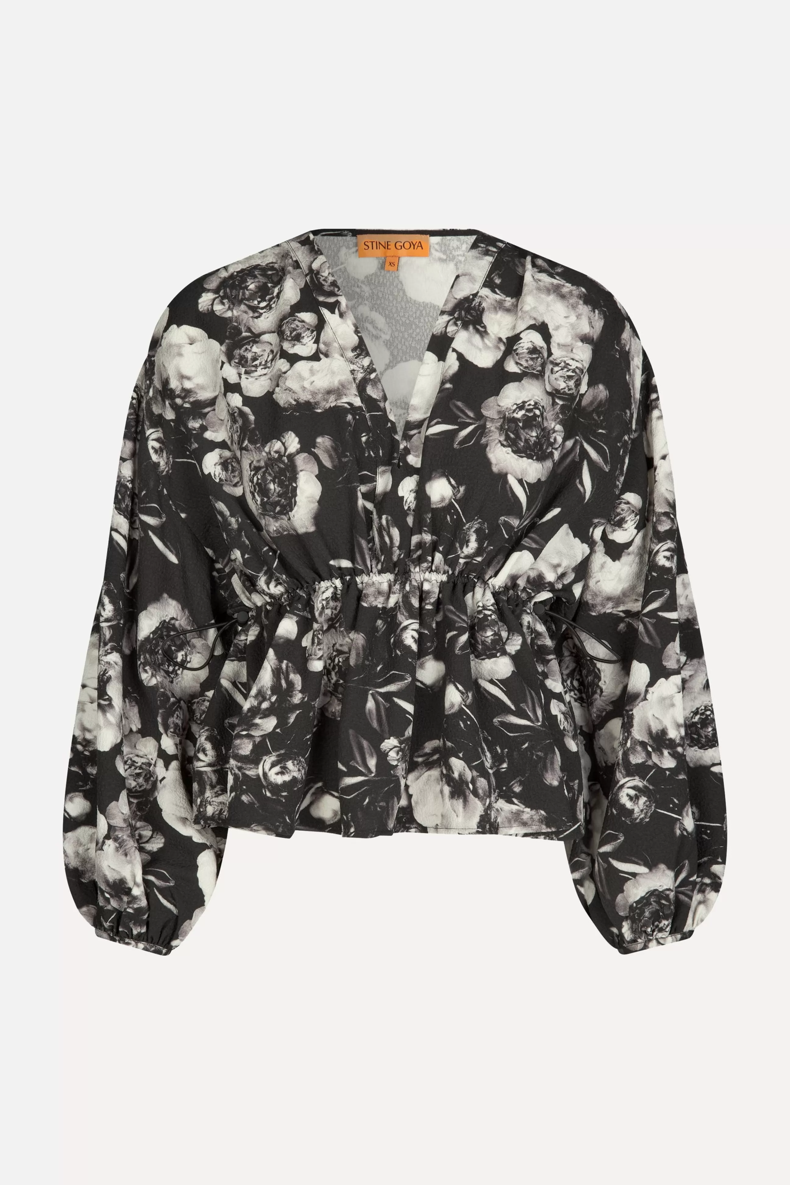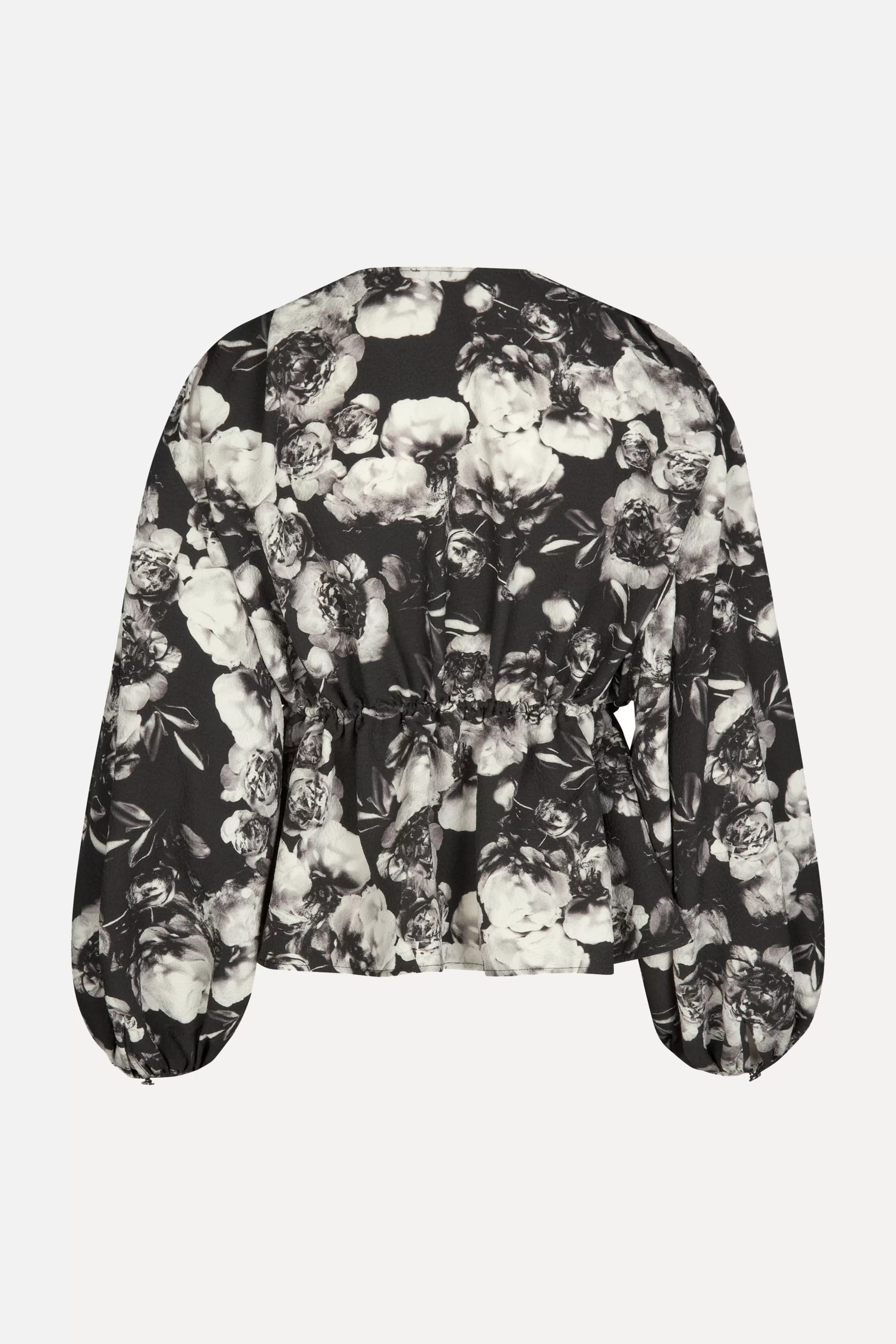 Peplum bluse med sort/hvid blomster print, lange voluminøse ærmer med knapper og V-udskæring. Justerbar elastisk talje.