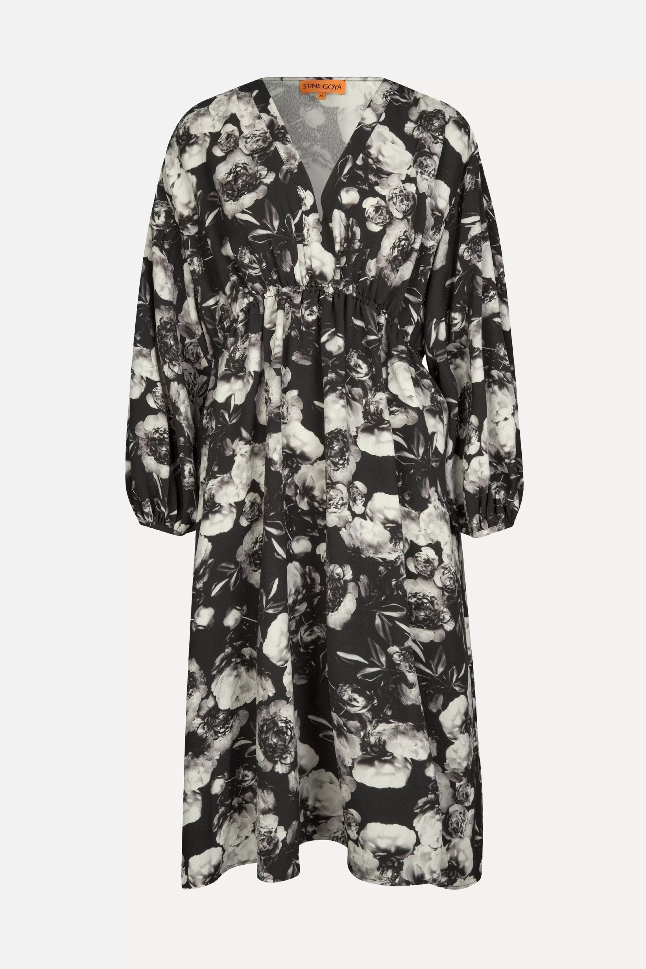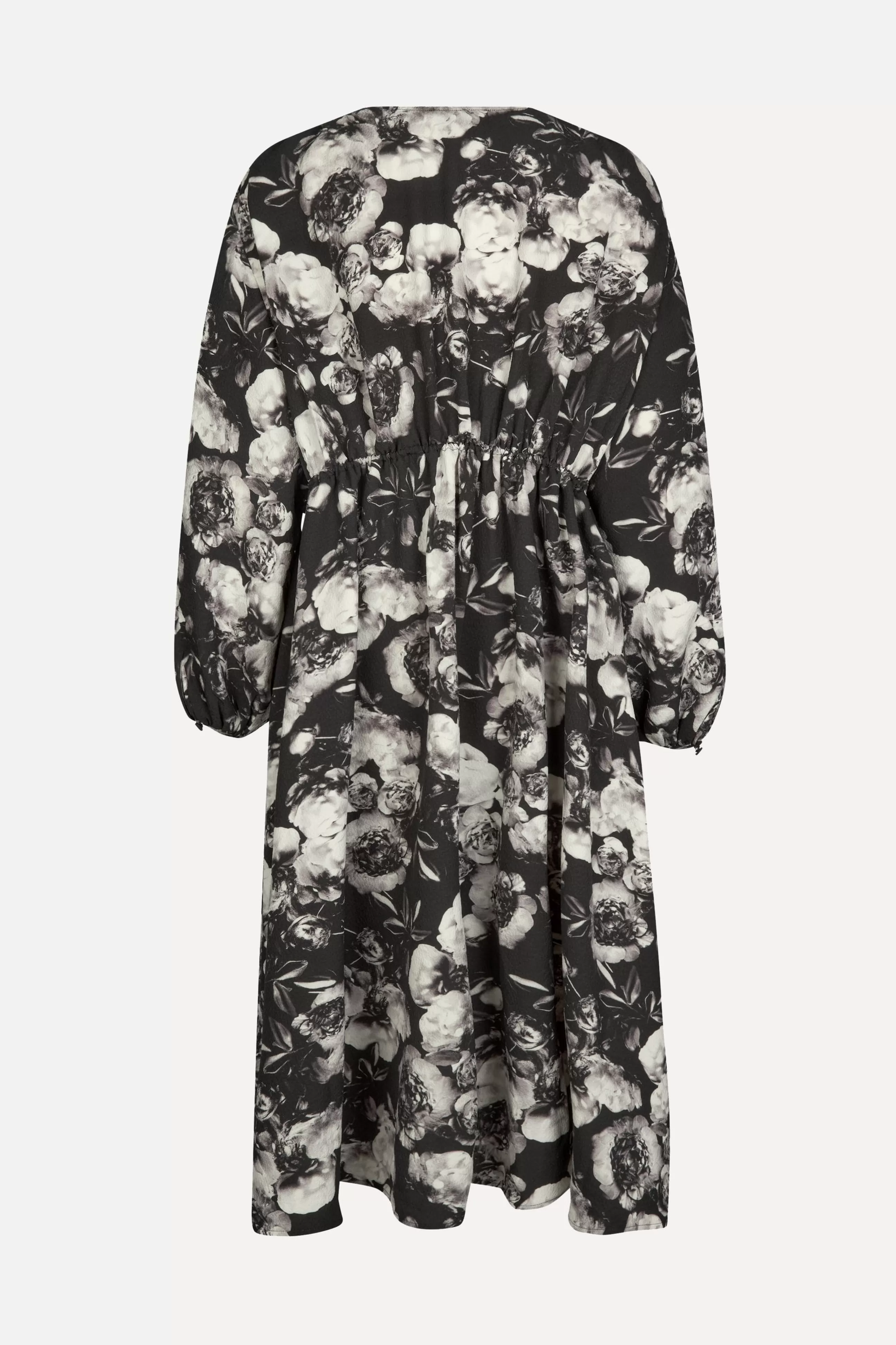 Afslappet midi-kjole med sort/hvid blomster print, lange voluminøse ærmer med knapper og V-udskæring. Justerbar elastisk talje.